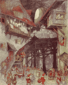 The old lady was pleased that the gnomes wished thus to honor her little altar and readily gave her consent, that they might come to it in order to celebrate the christening of their prince. The messenger bowed and, running quickly down her dress to the floor, disappeared through a little hole by the hearth. Immediately, from behind the great hearth, came the most wonderful procession she had ever seen.[Pg 13]