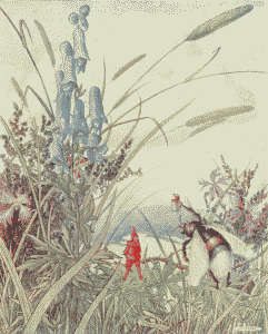 The queen started to take the wrappings from the tiny baby, which were bound round and round about him, and the herb woman and the old king talked of the golden days gone by. The king told her the tales he had from his forefathers, of the brilliant life in the great castle; how the gnomes nestled in the soft tapestries by the great marble hearths; how they cleaned and polished the gold and precious stones in the underground chambers; how, on clear moonlight nights, they danced graceful figures with the fairies; and how, with grasshoppers as horses, they held noisy tournaments.
