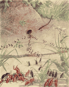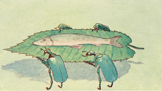 Nowhere was there a sign of the former life, or its delightful charm. They sadly returned to their home, wet and cold, where the Wood-bug awaited them. When he finally espied them, he shuffled about on his six feet, nodded with his whiskers and aired his wing shells, until he found courage to speak.