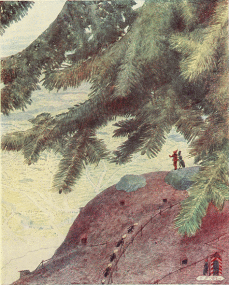 The old lady woke with a start, but the voices seemed to call to her faintly, as if from a great distance. She looked about her, but saw no one. The same faint sound of voices was still to be heard, and, now, right under the tree, she perceived a tiny little man in a red coat, just as if one of the three kings had really come from the altar and wakened her. Not one whit surprised, she bent toward him. It seemed to her that she had always known him.