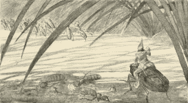 Here they were sheltered, at least, from the wind and, crawling out from the leaf, they looked around them, but everywhere they could only see black earth slippery and soft like high hills with nowhere any sign of human traces. They did not know where they were, or whither the wind had carried them.