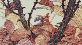Suddenly, he awoke. Already, the darkness was stealing over the county, the evening wind was whistling through the wild briar and playing with the leaves. Tom wanted to protect Chrysomela. He put his arm around her waist and wrapped a rolled up beech leaf around her, but the strong wind caught it up and, whirling it with many others, carried them through the air until they fell into a deep furrow.