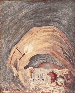 In the morning she milked Speckle and, as she drank the good, warm milk, she laughed to herself over her dream. But it would not leave her mind and, presently, she went to the hearth to see whence the procession of gnomes had come. She found nothing but a hole in the floor, large enough for a cat to pass through; but she thought to herself, »Why should I not go to the well by the chapel?«
