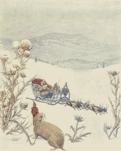 Tom looked around in vain; even from the stone steps of the chapel, he could not see it. All at once, a bright, little mouse stuck her sharp nose from under the rail and welcomed the Hamster. »How do you do, Godfather,« she cried. »You have brought us a guest. How is it that you still take walks in the snow?«