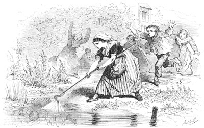 L'homme part. Un quart d'heure après, Mme de Fleurville arrive elle-même avec plusieurs domestiques et une voiture, dans laquelle on dépose la dame. On secourt le postillon, on relève la voiture versée dans le fossé.
