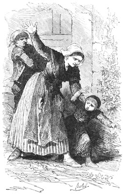 En disant ces mots elle relève la petite, la prend dans ses bras, et, malgré ce poids trop lourd pour ses forces et son âge, elle cherche à gravir le fossé; mais son pied glisse, ses bras vont laisser échapper son fardeau, lorsque Madeleine, surmontant sa frayeur et sa répugnance, s'élance au secours de sa sœur et l'aide à porter l'enfant; elles 10 arrivent au haut du fossé, traversent la route, et vont tomber épuisées sur le banc que leur avait indiqué Élisa.