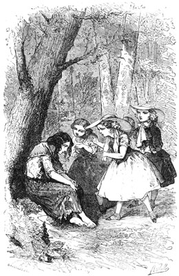 Sophie ne répondait rien; mais elle rougissait de s'être attiré par son égoïsme de pareilles consolations. Elle fit toute la route au pas; quand elle arriva à la halte désignée, elle vit tous les ânes attachés à des arbres; ses amies n'y étaient plus; elles avaient voulu l'attendre, mais Mme de Fleurville, qui désirait donner une leçon à Sophie, ne le 311 permit pas: elle les emmena avec Mme de Rosbourg dans la forêt. Elles y firent une charmante promenade et une grande provision de fraises et de noisettes; elles cueillirent des bouquets de fleurs des bois, et, lorsqu'elles revinrent à la halte, leurs visages roses et épanouis et leur gaieté bruyante contrastaient avec la figure morne et triste de Sophie, qu'elles trouvèrent assise au pied d'un arbre, les yeux bouffis et l'air honteux.