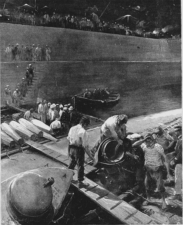 Pendant la journée du 16 et la nuit qui suivit, l'équipe des travailleurs n'interrompit pas un moment son horrible et pieuse besogne. Successivement, furent ramenés au dehors les corps de l'enseigne Robin et des autres victimes--pauvres matelots qui, deux mois auparavant, posaient joyeusement devant un photographe, pour ce groupe que nous reproduisons d'après une carte postale envoyée par l'un d'eux à ses parents.