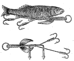 Le poisson carnassier distingue vite ce véron remarquable qui nage comme s'il était vivant et, en se précipitant pour l'avaler, se trouve infailliblement accroché par les deux hameçons doubles qui l'entourent et qu'il ne peut éviter.