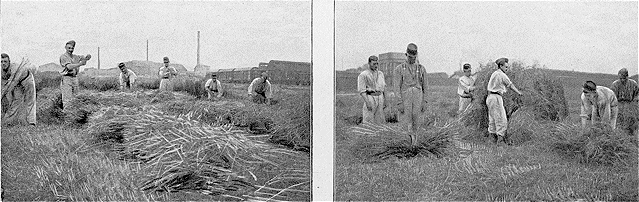 De tout temps il a été d'usage, à l'époque de la moisson, de mettre à la disposition des cultivateurs des travailleurs militaires, choisis de préférence parmi les hommes originaires de la campagne. L'utilité de ce renfort s'est fait sentir plus particulièrement cette année; en effet, de fréquents orages, de violents ouragans, ont versé une partie des blés, ce qui rend l'emploi des faucheuses mécaniques presque impossible et nécessite le travail à la main. Or, l'agriculture manquant de bras, le ministre de la Guerre, afin de lui en fournir, a donné aux chefs de corps des instructions en conséquence. C'est ainsi que, dans les champs de la banlieue parisienne, la plupart bornés par de noires usines--notamment entre Saint-Denis et Aubervilliers--on pouvait voir, ces jours derniers, des équipes de soldats vêtus de treillis manier la faucille et lier les gerbes avec la même activité qu'ils apportent à leurs exercices habituels.