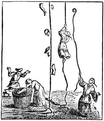 Parallels.—Campbell gives another variant, l. c. i., 318. Dr. Hyde has an Irish version of Campbell's tale written down in 1762, from which he gives the incident of the air-ladder (which I have had to euphemise in my version) in his Beside the Fireside, p. 191, and other passages in his Preface. The most remarkable parallel to this incident, however, is afforded by the feats of Indian jugglers reported briefly by Marco Polo, and illustrated with his usual wealth of learning by the late Sir Henry Yule, in his edition, vol. i., p. 308 seq. The accompanying illustration (reduced from Yule) will tell its own tale: it is taken from the Dutch account of the travels of an English sailor, E. Melton. Zeldzaame Reizen, 1702, p. 468. It tells the tale in five acts, all included in one sketch. Another instance quoted by Yule is still more parallel, so to speak. The twenty-third trick performed by some conjurors before the Emperor Jahangueir (Memoirs, p. 102) is thus described: "They produced a chain of 50 cubits in length, and in my presence threw one end of it toward the sky, where it remained as if fastened to something in the air.[279] A dog was then brought forward, and being placed at the lower end of the chain, immediately ran up, and, reaching the other end, immediately disappeared in the air. In the same manner a hog, a panther, a lion, and a tiger were successively sent up the chain." It has been suggested that the conjurors hypnotise the spectators, and make them believe they see these things. This is practically the suggestion of a wise Mohammedan, who is quoted by Yule as saying, "Wallah! 'tis my opinion there has been neither going up nor coming down; 'tis all hocus-pocus," hocus-pocus being presumably the Mohammedan term for hypnotism.