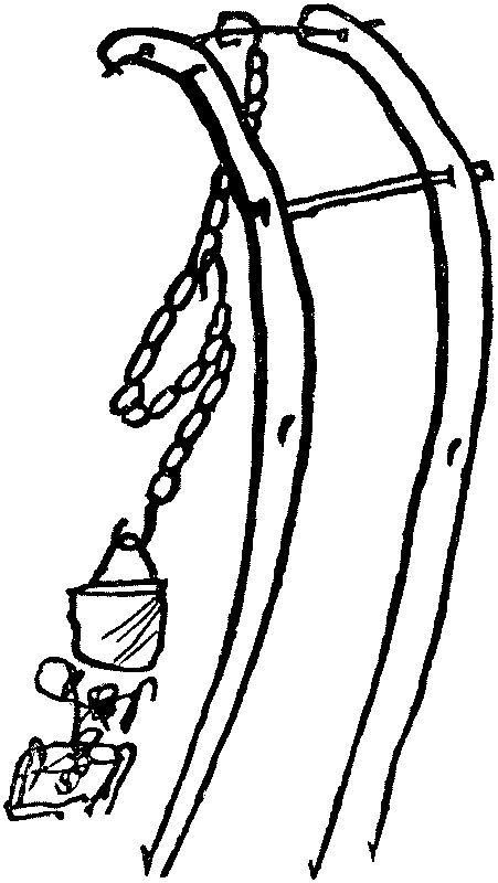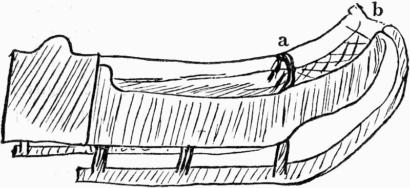 [5] La Motraye, after describing the Lapland sledge, observes that "it is attached by a single trace or thong, passing under the belly of the reindeer, and fixed to a leather collar which goes round the animal's neck. A long cord made of twisted fir bark, tied to his horns, serves, when pulled in a straight line, to stop his course, or, when drawn toward either side, to turn him in that direction. When this cord is made to strike him gently, by a vertical motion, on the back, it urges him to greater speed. The overturn of the sledge, where the road is uneven, is prevented by a stick, which serves, like the oar or paddle of a boat, to guide its course."