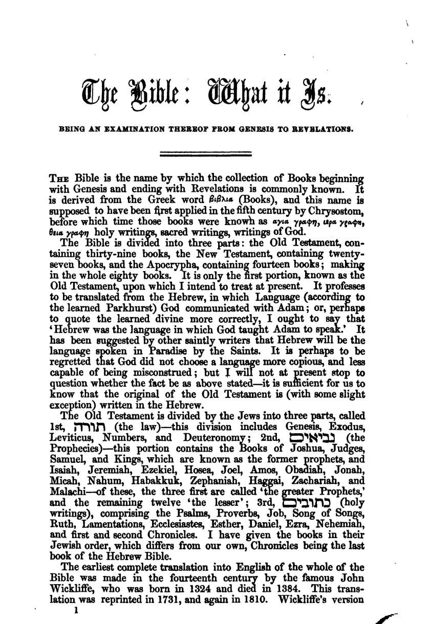 The Bible is divided into three parts: the Old Testament, containing thirty-nine books, the New Testament, containing twenty-seven books, and the Apocrypha, containing fourteen books; making in the whole eighty books. It is only the first portion, known as the Old Testament, upon which I intend to treat at present. It professes to be translated from the Hebrew, in which Language (according to the learned Parkhurst) God communicated with Adam; or, perhaps to quote the learned divine more correctly, I ought to say that 'Hebrew was the language in which God taught Adam to speak.' It has been suggested by other saintly writers that Hebrew will be the language spoken in Paradise by the Saints. It is perhaps to be regretted that God did not choose a language more copious, and less capable of being misconstrued; but I will not at present stop to question whether the fact be as above stated—it is sufficient for us to know that the original of the Old Testament is (with some slight exception) written in the Hebrew.