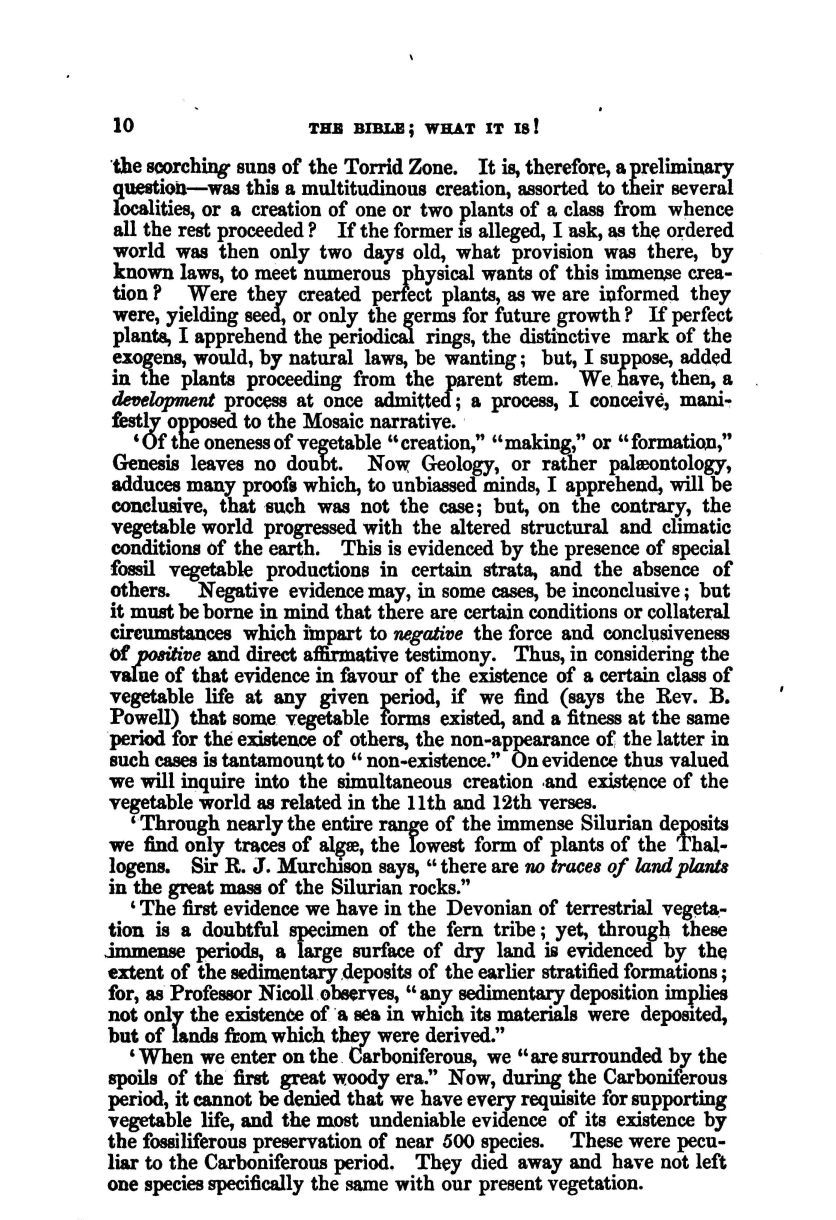'Now we find that, although seeds, herbs, and flowers and plants were stated to have been "created," "made," or "formed," on the third day, we find no evidence of their existence during periods incalculable subsequent to the appearance of animal life. Any short period of non-appearance might not satisfy the requirements for the proof of "non-existence;" but the astounding fact or the absence of the vegetation specifically the same as the present, through all the intervening series from the earliest dawn of life to the tertiary, can leave no doubt on any unbiassed or candid mind of their "non-existence" in the early ages of the created world, and of their subsequent altered structure. May we not fairly argue and expect that in such multitudinous species some evidence of their existence during enormous periods (especially when we find remains of other vegetable forms and animal life abound) would appear. And if this one day's work does not disclose the whole vegetable creation, when or at what period did the subsequent one take place?