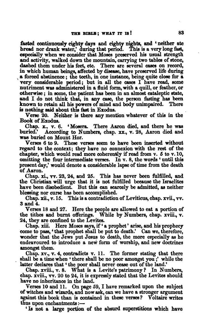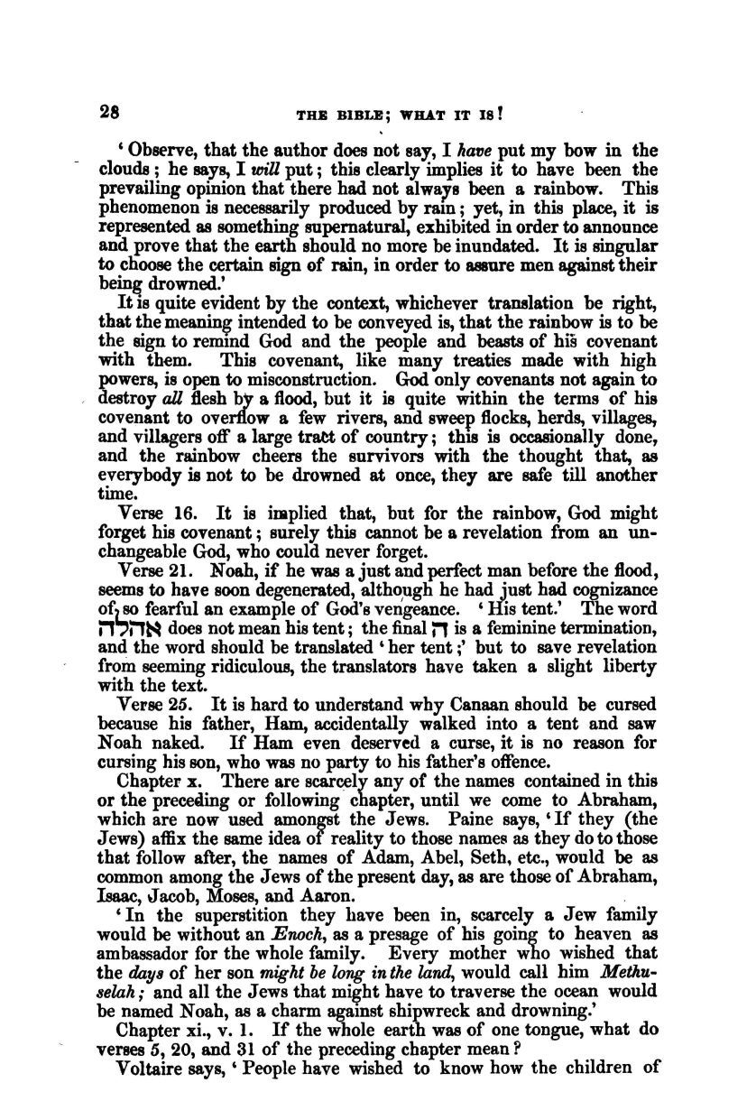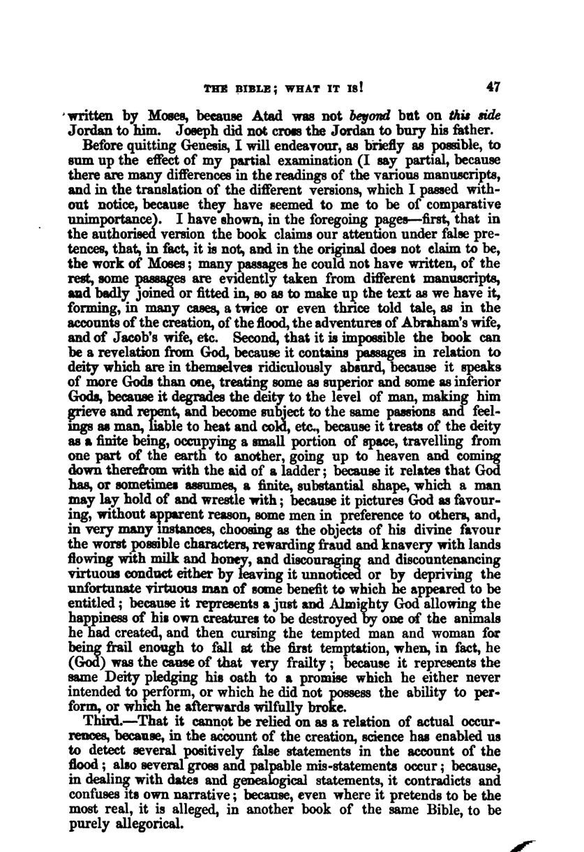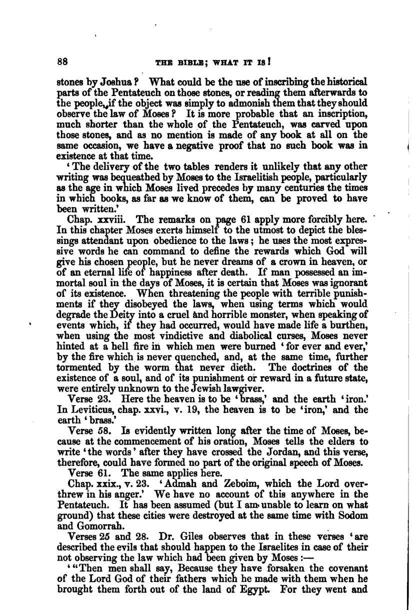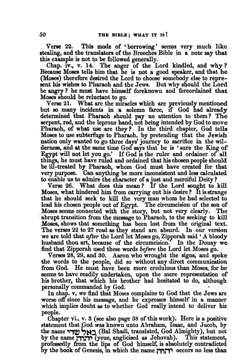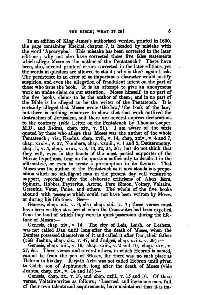 I have a copy printed by Robert Barker before me which contains the whole eighty books. It begins with these words, 'The first book of Moses, called Genesis.' Not one word of this title is to be found in the Hebrew. The word Genesis is a Greek word, signifying production, generation, birth, origin, or formation. It seems curious that the translators should have given a Hebrew book a Greek title. In the Hebrew there is no title to the book; the first word [———] (in the beginning) is merely written in larger characters. The headings to each page and chapter are also additions made by the translators; and this is sometimes very important, as they are made to improperly govern the meaning of the text. As to Genesis being called 'the first book of Moses,' I think that grave censure should be cast on those who prefixed those words; they are entirely omitted in the Douay edition. Long since, our churchmen have been acquainted with the fact that these words, fixing the authorship on Moses, form no part of the original text, yet they allow edition after edition to be printed bearing the same title as that of 1611. Why is this? It is not that they are afraid of tampering with the authorised version, for they have actually, in the later editions, omitted the whole fourteen books of the Apocrypha, which were included in the original edition. {pg5} In an edition of King James's authorised version, printed in 1630, the page containing Ezekiel, chapter 7, is headed by mistake with the word 'Apocrypha.' This mistake has been corrected in the later editions; why not also have corrected those five false statements which allege Moses as the author of the Pentateuch? There have been, also, several printers' errors corrected in the later editions, yet the words in question are allowed to stand; why is this? again I ask. The persistence in an error of so important a character would justify suspicion, and even the allegation of fraudulent intent on the part of those who issue the book. It is an attempt to give an anonymous work an undue claim on our attention. Moses himself, in no part of the five books, claims to be the author of them; and in no part of the Bible is he alleged to be the writer of the Pentateuch. It is certainly alleged that Moses wrote 'the law,' 'the book of the law,' but there is nothing whatever to show that that work outlived the destruction of Jerusalem, and there are several express declarations to the contrary (vide Letter on the Pentateuch by Thomas Cooper, M.D., and Esdras, chap, xiv., v. 21). I am aware of the texts quoted by those who allege that Moses was the author of the whole Pentateuch; viz., Exodus, chap, xvii., v. 14, chap, xxiv., v. 4 and 7, chap, xxxiv., v. 27, Numbers, chap, xxxiii., v. 1 and 2, Deuteronomy, chap, i., v. 5, chap, xxxi., v. 9, 13, 22, 24, 26; but do not think that they will, even in the hands of the most partial supporter of the Mosaic hypothesis, bear on the question sufficiently to decide it in the affirmative, or even to create a presumption in its favour. That Moses was the author of the Pentateuch as it now stands is a proposition which no intelligent man in the present day will venture to support, especially after the elaborate criticisms of Aben Ezra, Spinoza, Hobbes, Peyrerius, Astruc, Pere Simon, Volney, Voltaire, Gesenius, Vater, Paine, and others. The whole of the five books abound with passages which could not have been written by Moses, or during his life time. See—Genesis, chap, xii., v. 6, also chap, xiii., v. 7; these verses must have been written at a period when the Canaanites had been expelled from the land of which they were in quiet possession during the lifetime of Moses:—