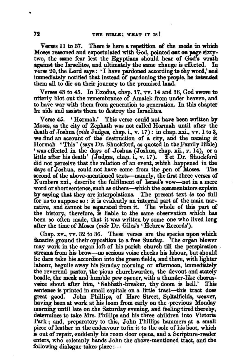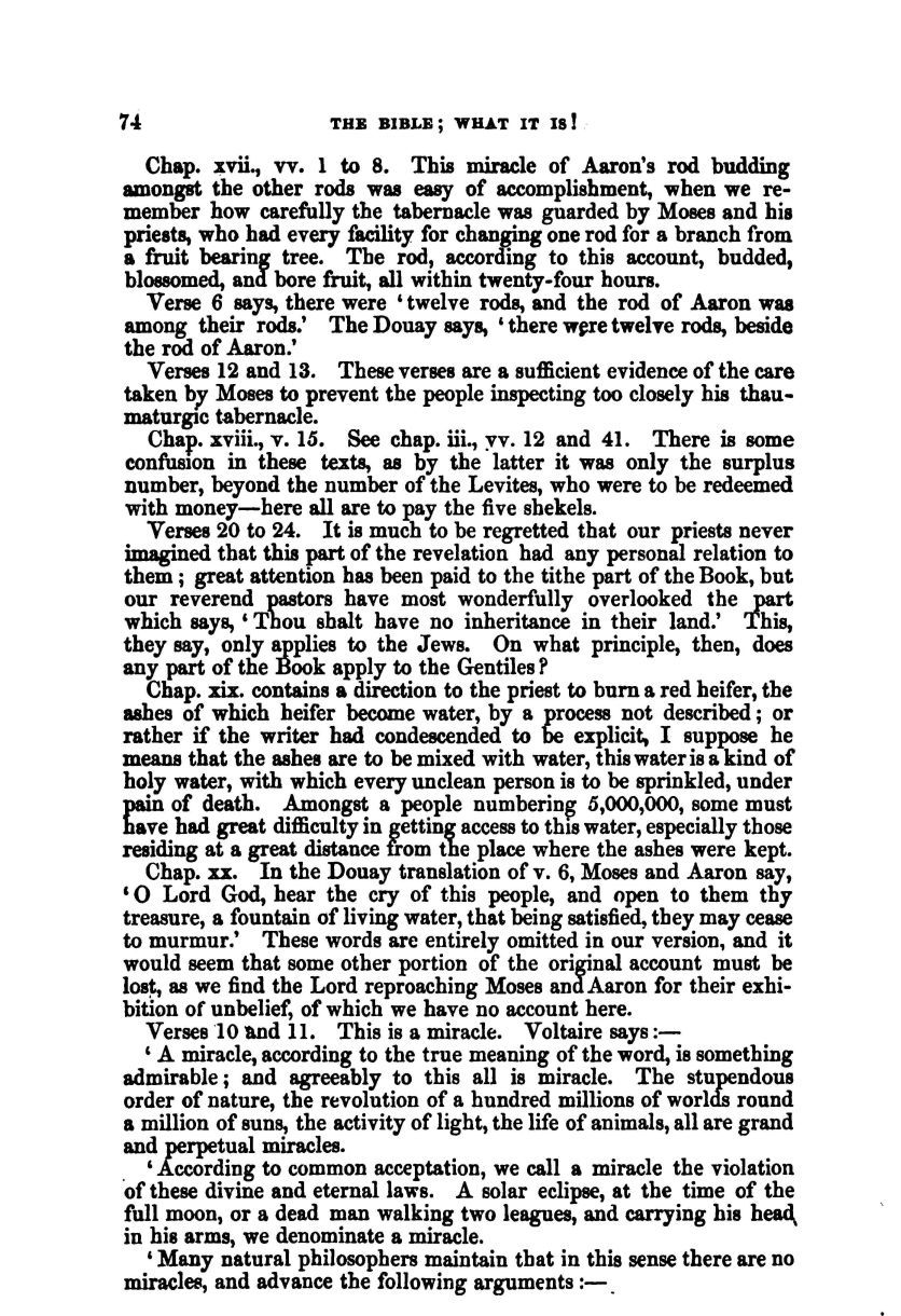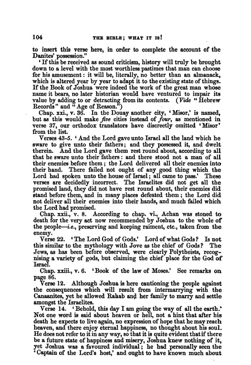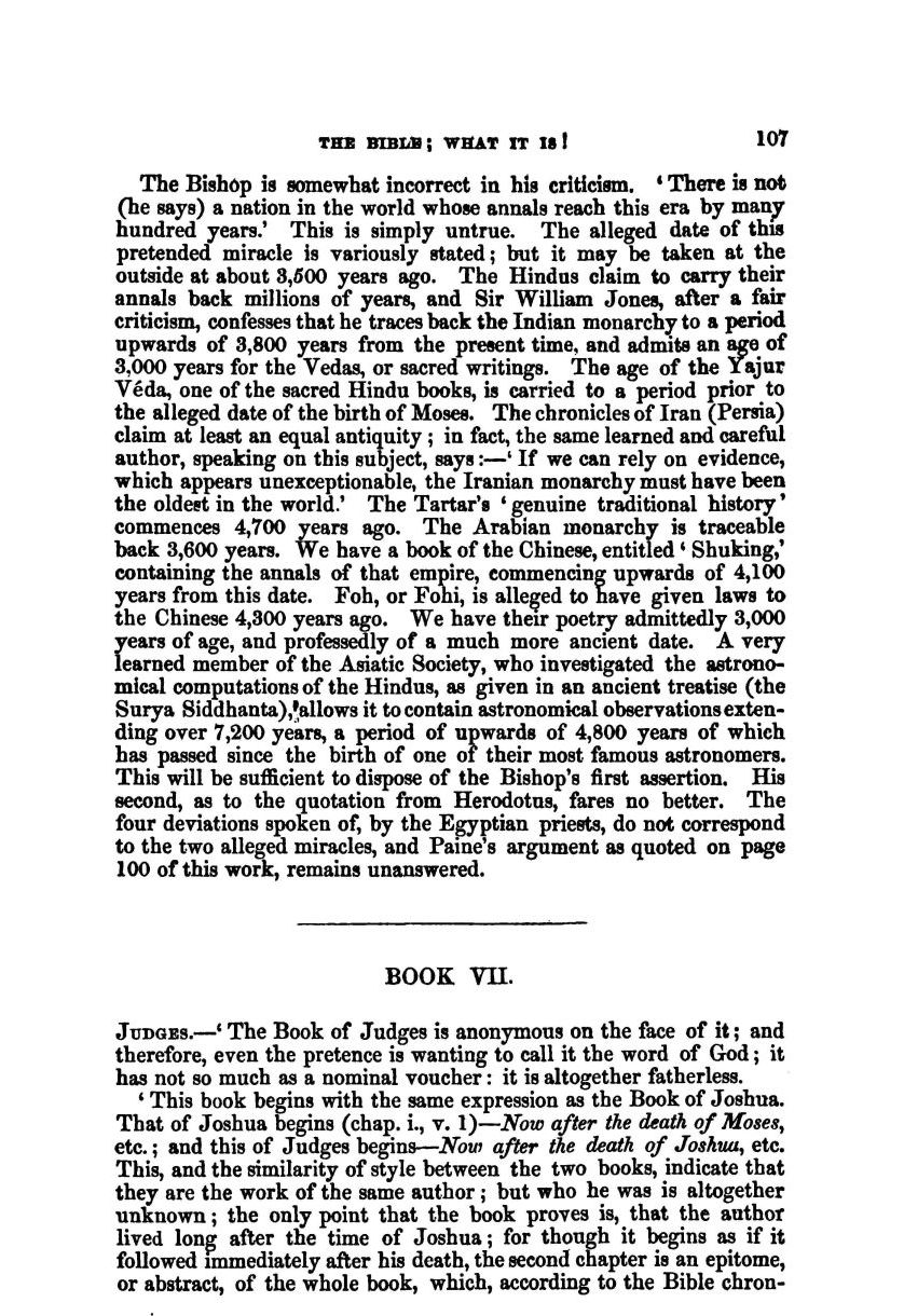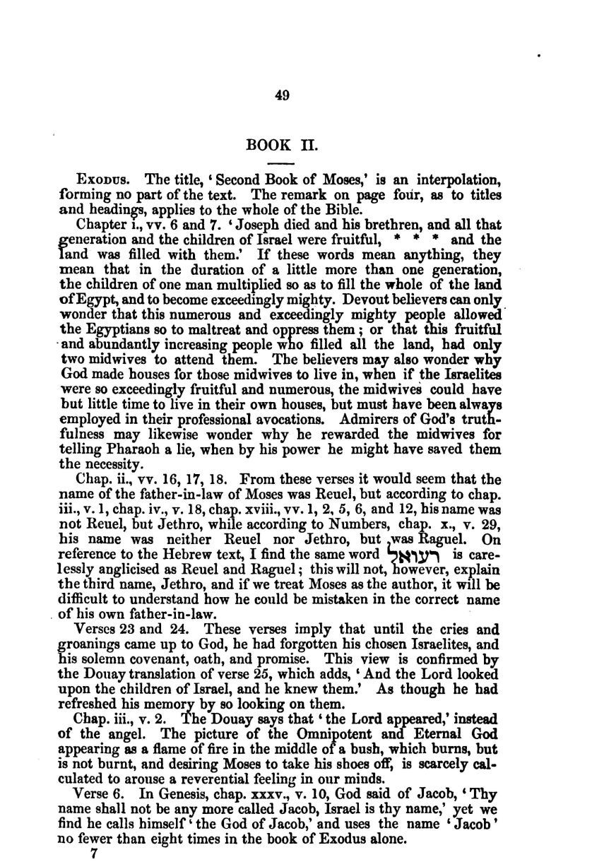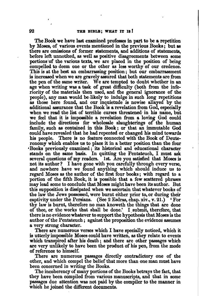 I have a copy printed by Robert Barker before me which contains the whole eighty books. It begins with these words, 'The first book of Moses, called Genesis.' Not one word of this title is to be found in the Hebrew. The word Genesis is a Greek word, signifying production, generation, birth, origin, or formation. It seems curious that the translators should have given a Hebrew book a Greek title. In the Hebrew there is no title to the book; the first word [———] (in the beginning) is merely written in larger characters. The headings to each page and chapter are also additions made by the translators; and this is sometimes very important, as they are made to improperly govern the meaning of the text. As to Genesis being called 'the first book of Moses,' I think that grave censure should be cast on those who prefixed those words; they are entirely omitted in the Douay edition. Long since, our churchmen have been acquainted with the fact that these words, fixing the authorship on Moses, form no part of the original text, yet they allow edition after edition to be printed bearing the same title as that of 1611. Why is this? It is not that they are afraid of tampering with the authorised version, for they have actually, in the later editions, omitted the whole fourteen books of the Apocrypha, which were included in the original edition. {pg5} In an edition of King James's authorised version, printed in 1630, the page containing Ezekiel, chapter 7, is headed by mistake with the word 'Apocrypha.' This mistake has been corrected in the later editions; why not also have corrected those five false statements which allege Moses as the author of the Pentateuch? There have been, also, several printers' errors corrected in the later editions, yet the words in question are allowed to stand; why is this? again I ask. The persistence in an error of so important a character would justify suspicion, and even the allegation of fraudulent intent on the part of those who issue the book. It is an attempt to give an anonymous work an undue claim on our attention. Moses himself, in no part of the five books, claims to be the author of them; and in no part of the Bible is he alleged to be the writer of the Pentateuch. It is certainly alleged that Moses wrote 'the law,' 'the book of the law,' but there is nothing whatever to show that that work outlived the destruction of Jerusalem, and there are several express declarations to the contrary (vide Letter on the Pentateuch by Thomas Cooper, M.D., and Esdras, chap, xiv., v. 21). I am aware of the texts quoted by those who allege that Moses was the author of the whole Pentateuch; viz., Exodus, chap, xvii., v. 14, chap, xxiv., v. 4 and 7, chap, xxxiv., v. 27, Numbers, chap, xxxiii., v. 1 and 2, Deuteronomy, chap, i., v. 5, chap, xxxi., v. 9, 13, 22, 24, 26; but do not think that they will, even in the hands of the most partial supporter of the Mosaic hypothesis, bear on the question sufficiently to decide it in the affirmative, or even to create a presumption in its favour. That Moses was the author of the Pentateuch as it now stands is a proposition which no intelligent man in the present day will venture to support, especially after the elaborate criticisms of Aben Ezra, Spinoza, Hobbes, Peyrerius, Astruc, Pere Simon, Volney, Voltaire, Gesenius, Vater, Paine, and others. The whole of the five books abound with passages which could not have been written by Moses, or during his life time. See—Genesis, chap, xii., v. 6, also chap, xiii., v. 7; these verses must have been written at a period when the Canaanites had been expelled from the land of which they were in quiet possession during the lifetime of Moses:—