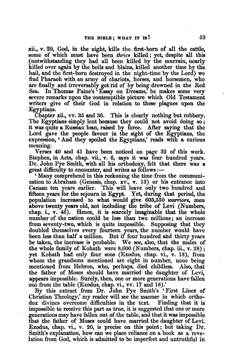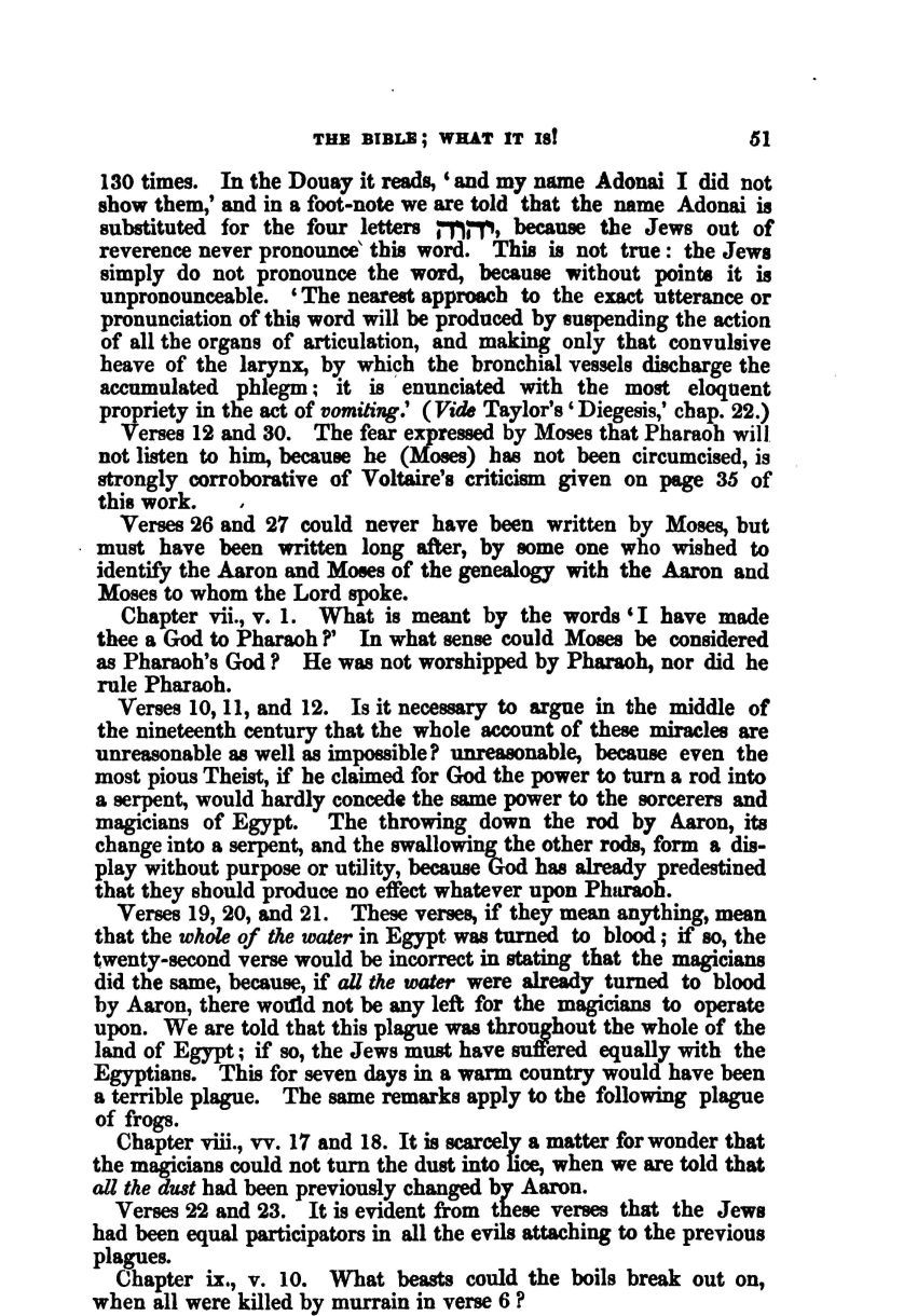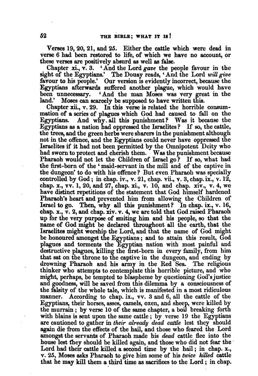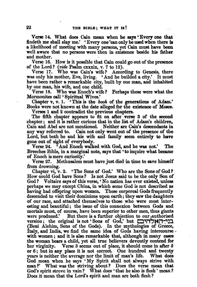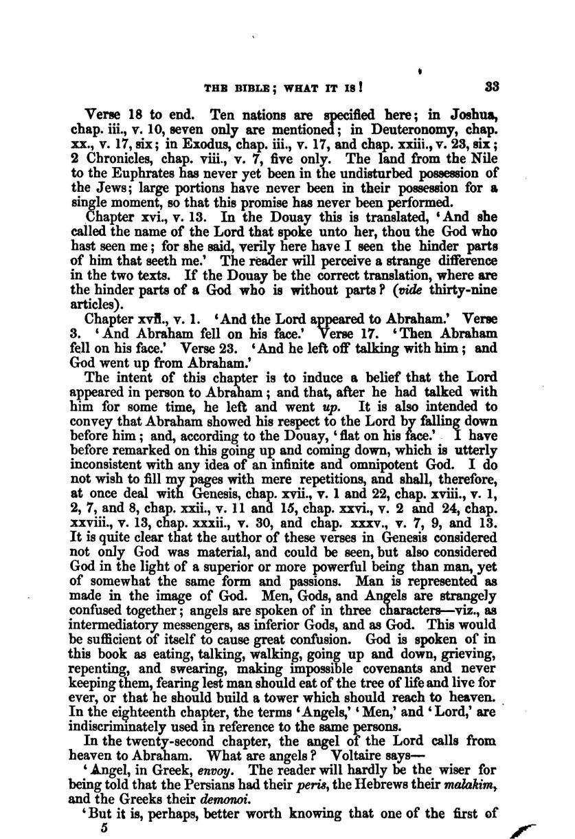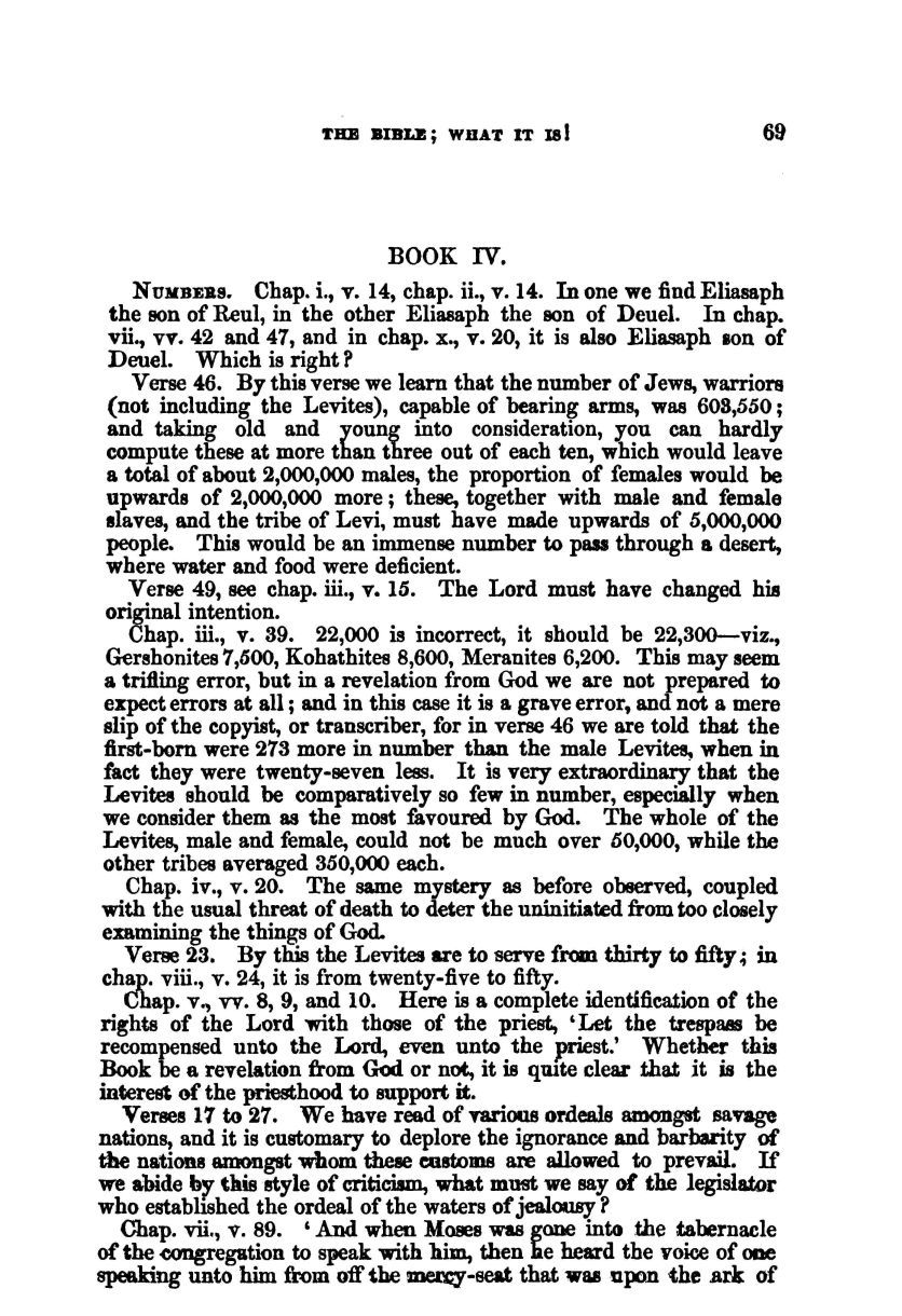 I have a copy printed by Robert Barker before me which contains the whole eighty books. It begins with these words, 'The first book of Moses, called Genesis.' Not one word of this title is to be found in the Hebrew. The word Genesis is a Greek word, signifying production, generation, birth, origin, or formation. It seems curious that the translators should have given a Hebrew book a Greek title. In the Hebrew there is no title to the book; the first word [———] (in the beginning) is merely written in larger characters. The headings to each page and chapter are also additions made by the translators; and this is sometimes very important, as they are made to improperly govern the meaning of the text. As to Genesis being called 'the first book of Moses,' I think that grave censure should be cast on those who prefixed those words; they are entirely omitted in the Douay edition. Long since, our churchmen have been acquainted with the fact that these words, fixing the authorship on Moses, form no part of the original text, yet they allow edition after edition to be printed bearing the same title as that of 1611. Why is this? It is not that they are afraid of tampering with the authorised version, for they have actually, in the later editions, omitted the whole fourteen books of the Apocrypha, which were included in the original edition. {pg5} In an edition of King James's authorised version, printed in 1630, the page containing Ezekiel, chapter 7, is headed by mistake with the word 'Apocrypha.' This mistake has been corrected in the later editions; why not also have corrected those five false statements which allege Moses as the author of the Pentateuch? There have been, also, several printers' errors corrected in the later editions, yet the words in question are allowed to stand; why is this? again I ask. The persistence in an error of so important a character would justify suspicion, and even the allegation of fraudulent intent on the part of those who issue the book. It is an attempt to give an anonymous work an undue claim on our attention. Moses himself, in no part of the five books, claims to be the author of them; and in no part of the Bible is he alleged to be the writer of the Pentateuch. It is certainly alleged that Moses wrote 'the law,' 'the book of the law,' but there is nothing whatever to show that that work outlived the destruction of Jerusalem, and there are several express declarations to the contrary (vide Letter on the Pentateuch by Thomas Cooper, M.D., and Esdras, chap, xiv., v. 21). I am aware of the texts quoted by those who allege that Moses was the author of the whole Pentateuch; viz., Exodus, chap, xvii., v. 14, chap, xxiv., v. 4 and 7, chap, xxxiv., v. 27, Numbers, chap, xxxiii., v. 1 and 2, Deuteronomy, chap, i., v. 5, chap, xxxi., v. 9, 13, 22, 24, 26; but do not think that they will, even in the hands of the most partial supporter of the Mosaic hypothesis, bear on the question sufficiently to decide it in the affirmative, or even to create a presumption in its favour. That Moses was the author of the Pentateuch as it now stands is a proposition which no intelligent man in the present day will venture to support, especially after the elaborate criticisms of Aben Ezra, Spinoza, Hobbes, Peyrerius, Astruc, Pere Simon, Volney, Voltaire, Gesenius, Vater, Paine, and others. The whole of the five books abound with passages which could not have been written by Moses, or during his life time. See—Genesis, chap, xii., v. 6, also chap, xiii., v. 7; these verses must have been written at a period when the Canaanites had been expelled from the land of which they were in quiet possession during the lifetime of Moses:—