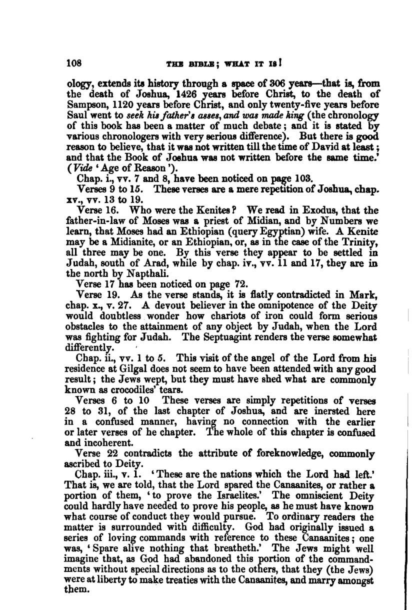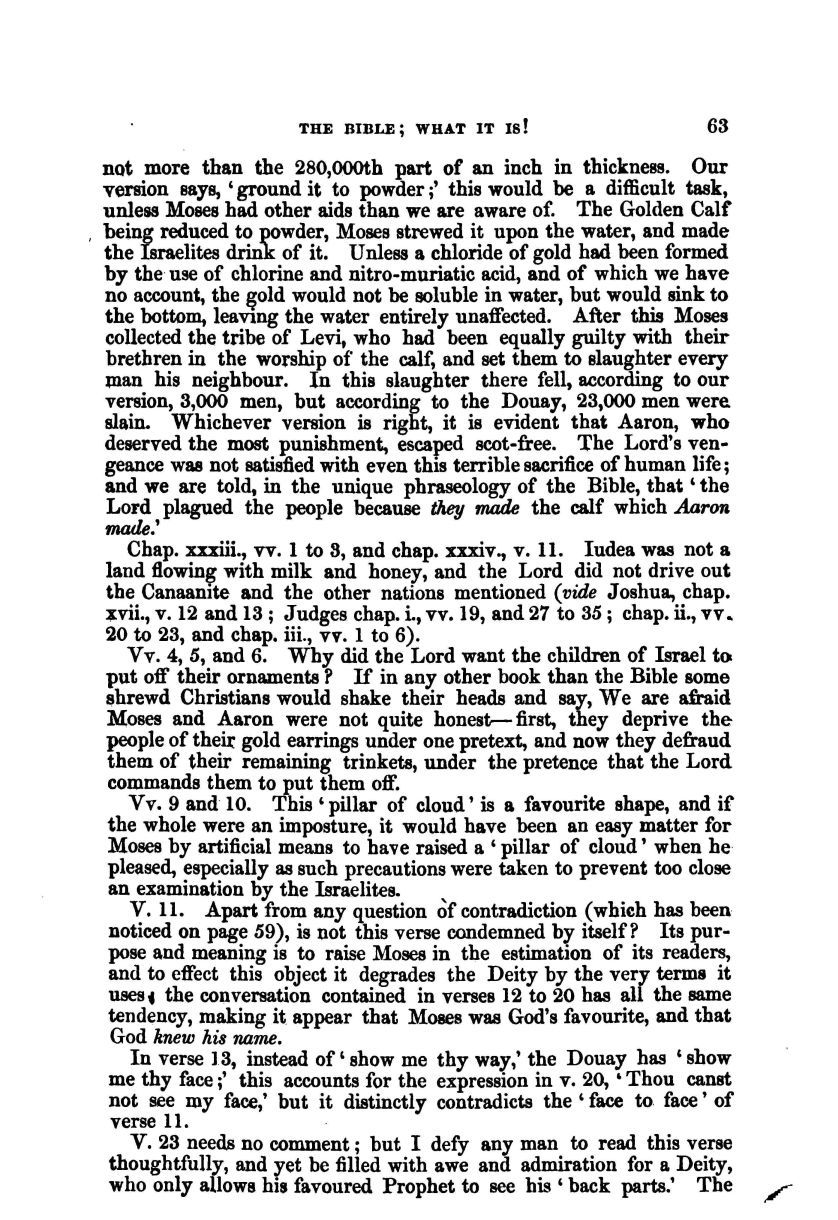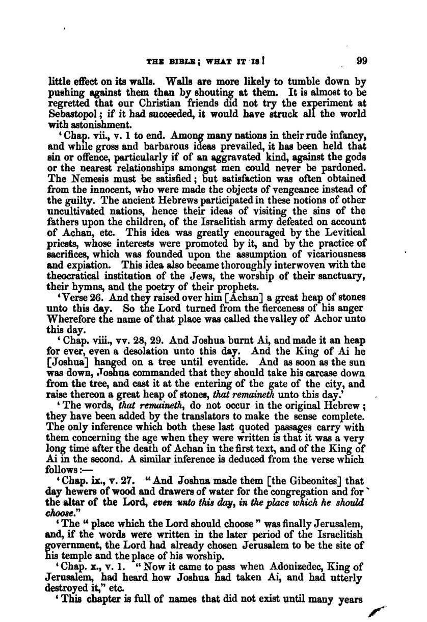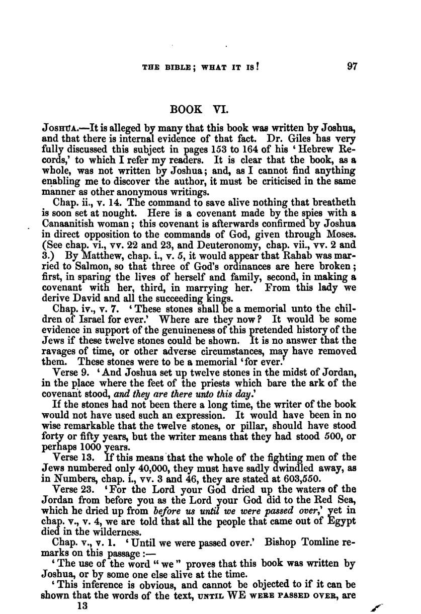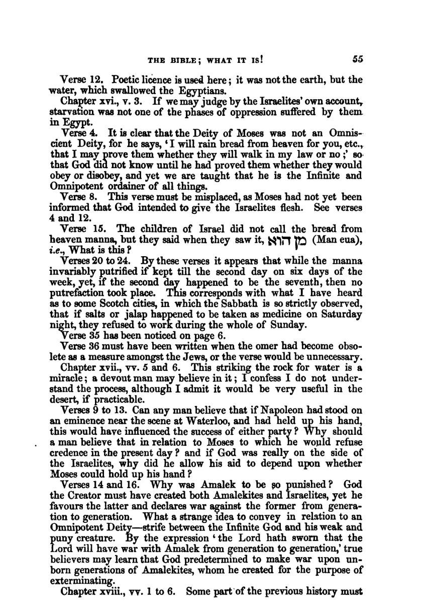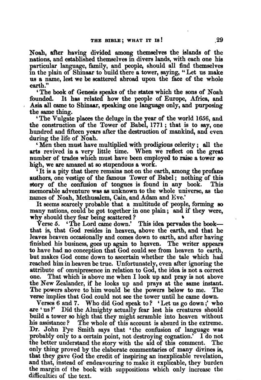 I have a copy printed by Robert Barker before me which contains the whole eighty books. It begins with these words, 'The first book of Moses, called Genesis.' Not one word of this title is to be found in the Hebrew. The word Genesis is a Greek word, signifying production, generation, birth, origin, or formation. It seems curious that the translators should have given a Hebrew book a Greek title. In the Hebrew there is no title to the book; the first word [———] (in the beginning) is merely written in larger characters. The headings to each page and chapter are also additions made by the translators; and this is sometimes very important, as they are made to improperly govern the meaning of the text. As to Genesis being called 'the first book of Moses,' I think that grave censure should be cast on those who prefixed those words; they are entirely omitted in the Douay edition. Long since, our churchmen have been acquainted with the fact that these words, fixing the authorship on Moses, form no part of the original text, yet they allow edition after edition to be printed bearing the same title as that of 1611. Why is this? It is not that they are afraid of tampering with the authorised version, for they have actually, in the later editions, omitted the whole fourteen books of the Apocrypha, which were included in the original edition. {pg5} In an edition of King James's authorised version, printed in 1630, the page containing Ezekiel, chapter 7, is headed by mistake with the word 'Apocrypha.' This mistake has been corrected in the later editions; why not also have corrected those five false statements which allege Moses as the author of the Pentateuch? There have been, also, several printers' errors corrected in the later editions, yet the words in question are allowed to stand; why is this? again I ask. The persistence in an error of so important a character would justify suspicion, and even the allegation of fraudulent intent on the part of those who issue the book. It is an attempt to give an anonymous work an undue claim on our attention. Moses himself, in no part of the five books, claims to be the author of them; and in no part of the Bible is he alleged to be the writer of the Pentateuch. It is certainly alleged that Moses wrote 'the law,' 'the book of the law,' but there is nothing whatever to show that that work outlived the destruction of Jerusalem, and there are several express declarations to the contrary (vide Letter on the Pentateuch by Thomas Cooper, M.D., and Esdras, chap, xiv., v. 21). I am aware of the texts quoted by those who allege that Moses was the author of the whole Pentateuch; viz., Exodus, chap, xvii., v. 14, chap, xxiv., v. 4 and 7, chap, xxxiv., v. 27, Numbers, chap, xxxiii., v. 1 and 2, Deuteronomy, chap, i., v. 5, chap, xxxi., v. 9, 13, 22, 24, 26; but do not think that they will, even in the hands of the most partial supporter of the Mosaic hypothesis, bear on the question sufficiently to decide it in the affirmative, or even to create a presumption in its favour. That Moses was the author of the Pentateuch as it now stands is a proposition which no intelligent man in the present day will venture to support, especially after the elaborate criticisms of Aben Ezra, Spinoza, Hobbes, Peyrerius, Astruc, Pere Simon, Volney, Voltaire, Gesenius, Vater, Paine, and others. The whole of the five books abound with passages which could not have been written by Moses, or during his life time. See—Genesis, chap, xii., v. 6, also chap, xiii., v. 7; these verses must have been written at a period when the Canaanites had been expelled from the land of which they were in quiet possession during the lifetime of Moses:—