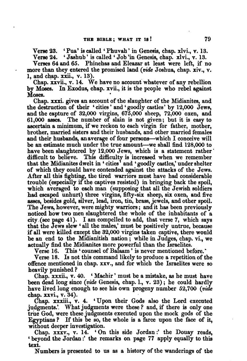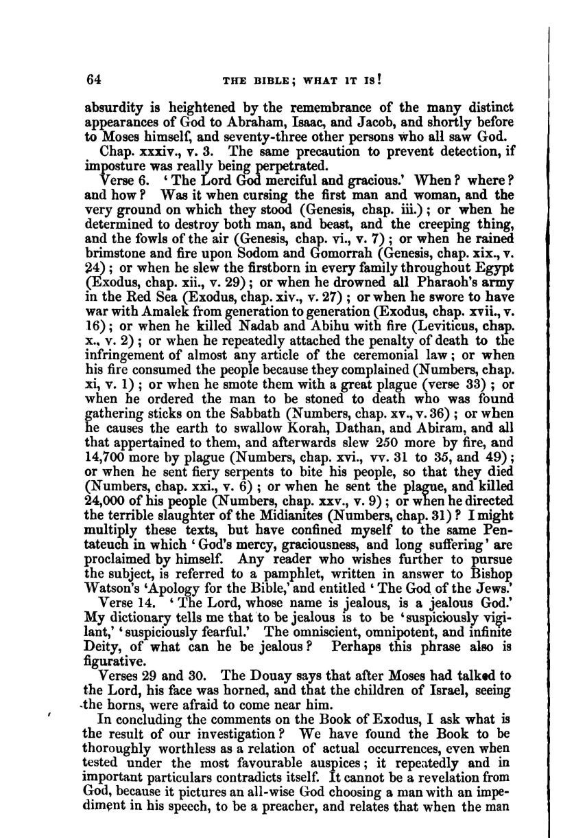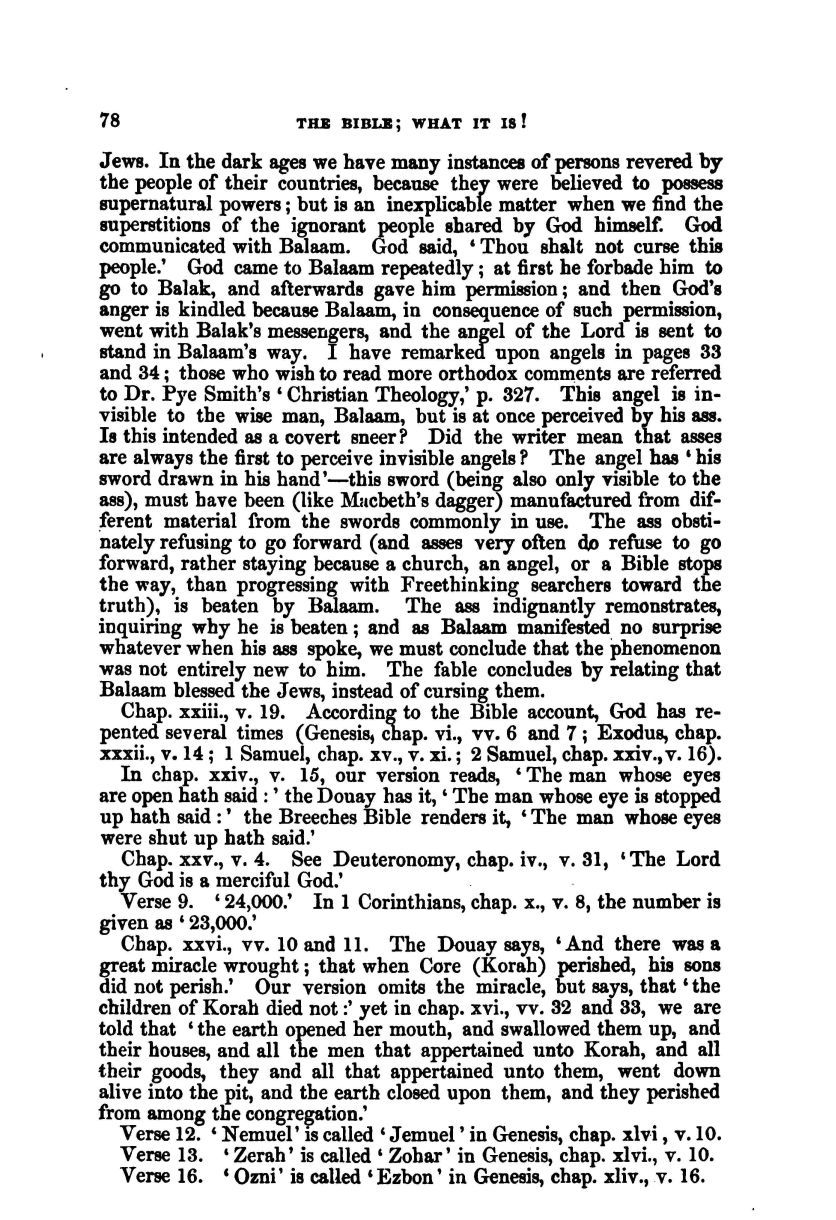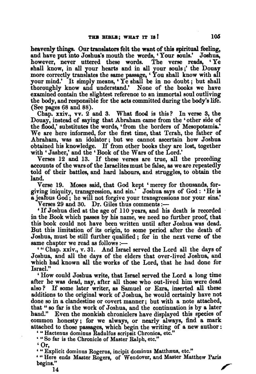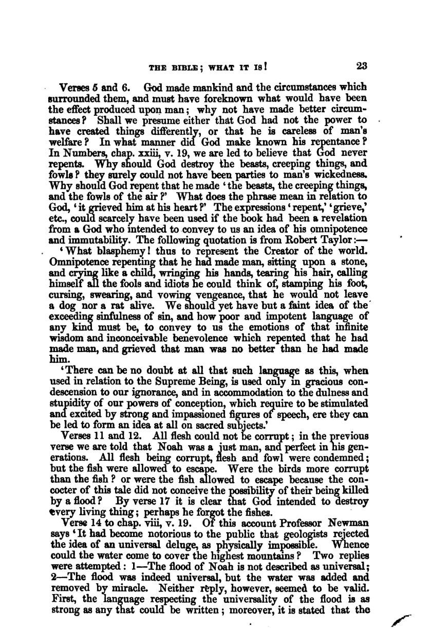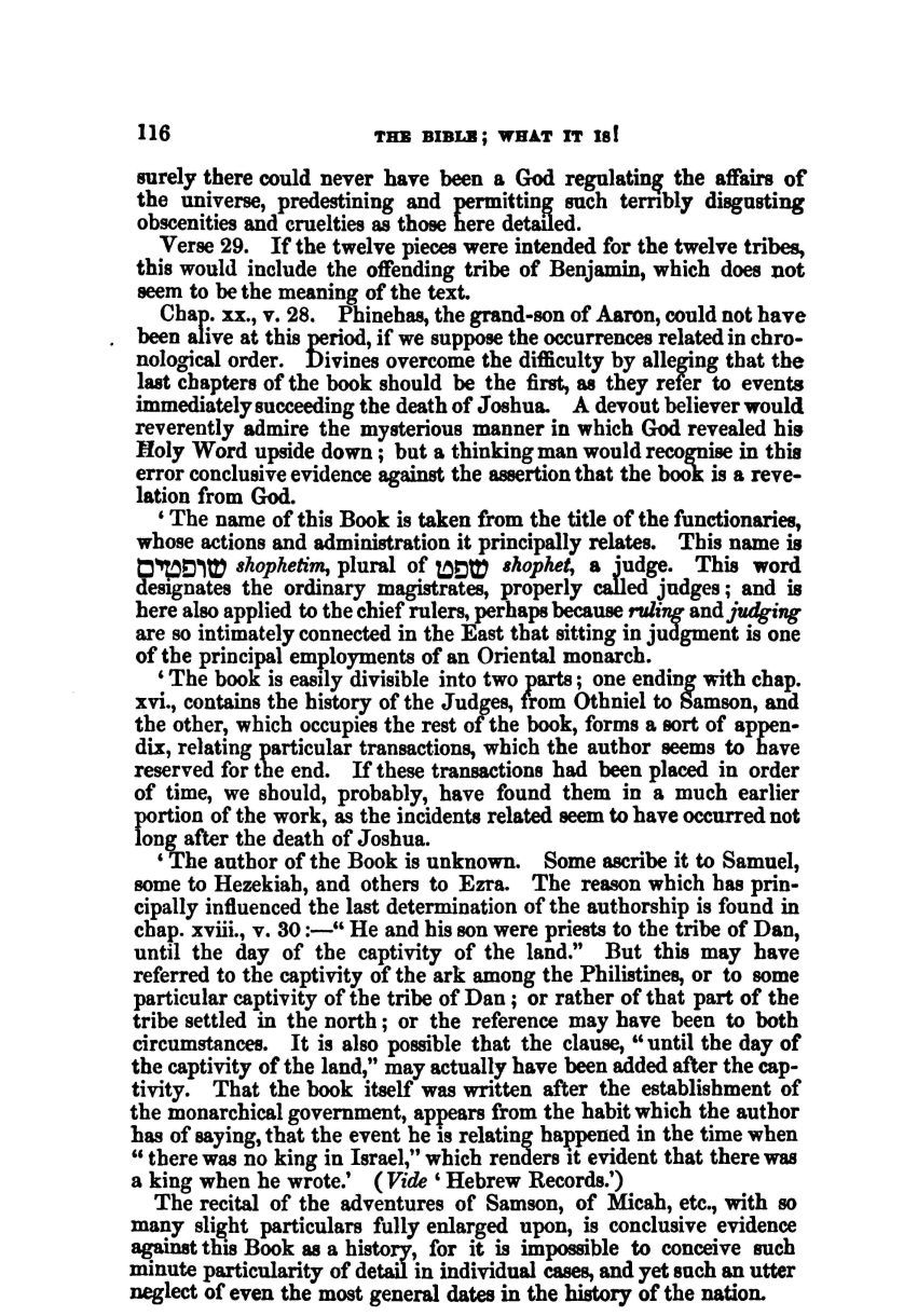 I have a copy printed by Robert Barker before me which contains the whole eighty books. It begins with these words, 'The first book of Moses, called Genesis.' Not one word of this title is to be found in the Hebrew. The word Genesis is a Greek word, signifying production, generation, birth, origin, or formation. It seems curious that the translators should have given a Hebrew book a Greek title. In the Hebrew there is no title to the book; the first word [———] (in the beginning) is merely written in larger characters. The headings to each page and chapter are also additions made by the translators; and this is sometimes very important, as they are made to improperly govern the meaning of the text. As to Genesis being called 'the first book of Moses,' I think that grave censure should be cast on those who prefixed those words; they are entirely omitted in the Douay edition. Long since, our churchmen have been acquainted with the fact that these words, fixing the authorship on Moses, form no part of the original text, yet they allow edition after edition to be printed bearing the same title as that of 1611. Why is this? It is not that they are afraid of tampering with the authorised version, for they have actually, in the later editions, omitted the whole fourteen books of the Apocrypha, which were included in the original edition. {pg5} In an edition of King James's authorised version, printed in 1630, the page containing Ezekiel, chapter 7, is headed by mistake with the word 'Apocrypha.' This mistake has been corrected in the later editions; why not also have corrected those five false statements which allege Moses as the author of the Pentateuch? There have been, also, several printers' errors corrected in the later editions, yet the words in question are allowed to stand; why is this? again I ask. The persistence in an error of so important a character would justify suspicion, and even the allegation of fraudulent intent on the part of those who issue the book. It is an attempt to give an anonymous work an undue claim on our attention. Moses himself, in no part of the five books, claims to be the author of them; and in no part of the Bible is he alleged to be the writer of the Pentateuch. It is certainly alleged that Moses wrote 'the law,' 'the book of the law,' but there is nothing whatever to show that that work outlived the destruction of Jerusalem, and there are several express declarations to the contrary (vide Letter on the Pentateuch by Thomas Cooper, M.D., and Esdras, chap, xiv., v. 21). I am aware of the texts quoted by those who allege that Moses was the author of the whole Pentateuch; viz., Exodus, chap, xvii., v. 14, chap, xxiv., v. 4 and 7, chap, xxxiv., v. 27, Numbers, chap, xxxiii., v. 1 and 2, Deuteronomy, chap, i., v. 5, chap, xxxi., v. 9, 13, 22, 24, 26; but do not think that they will, even in the hands of the most partial supporter of the Mosaic hypothesis, bear on the question sufficiently to decide it in the affirmative, or even to create a presumption in its favour. That Moses was the author of the Pentateuch as it now stands is a proposition which no intelligent man in the present day will venture to support, especially after the elaborate criticisms of Aben Ezra, Spinoza, Hobbes, Peyrerius, Astruc, Pere Simon, Volney, Voltaire, Gesenius, Vater, Paine, and others. The whole of the five books abound with passages which could not have been written by Moses, or during his life time. See—Genesis, chap, xii., v. 6, also chap, xiii., v. 7; these verses must have been written at a period when the Canaanites had been expelled from the land of which they were in quiet possession during the lifetime of Moses:—
