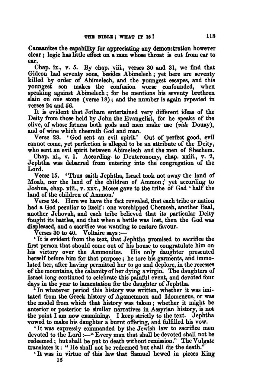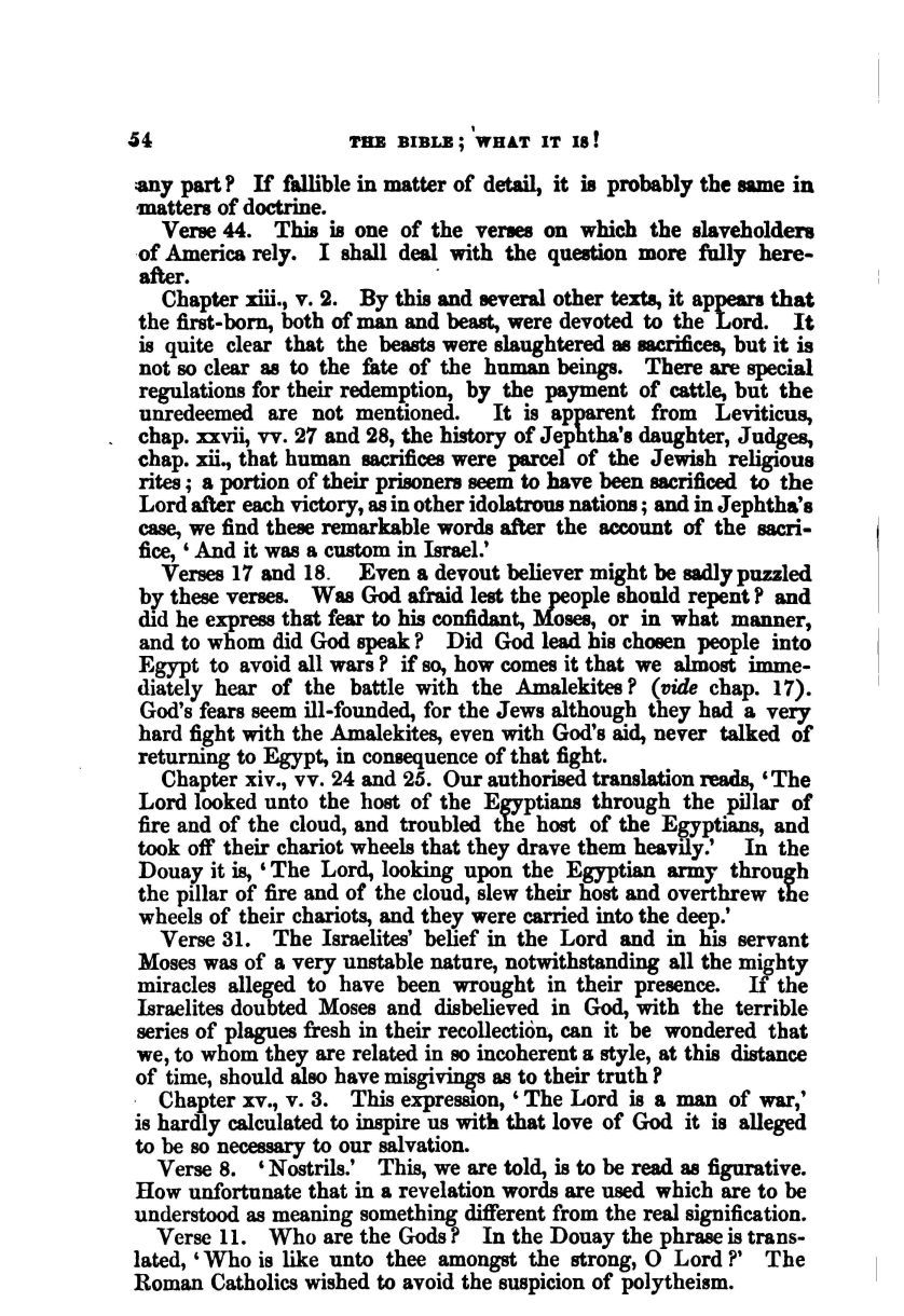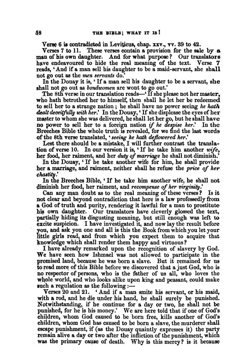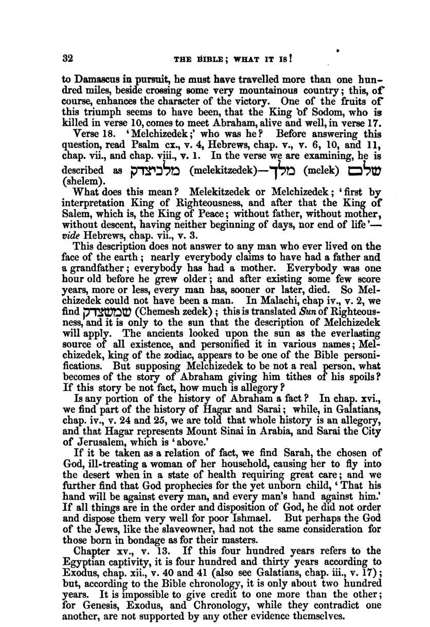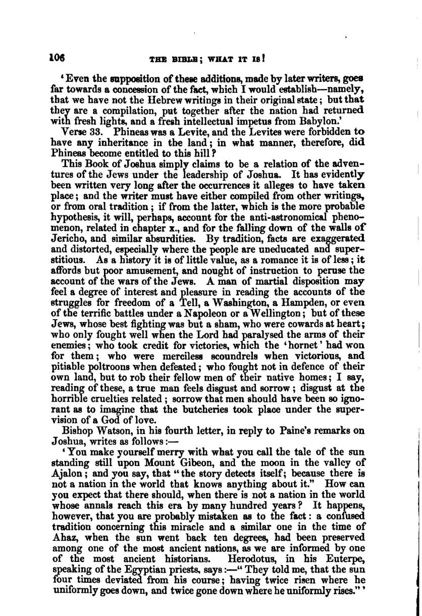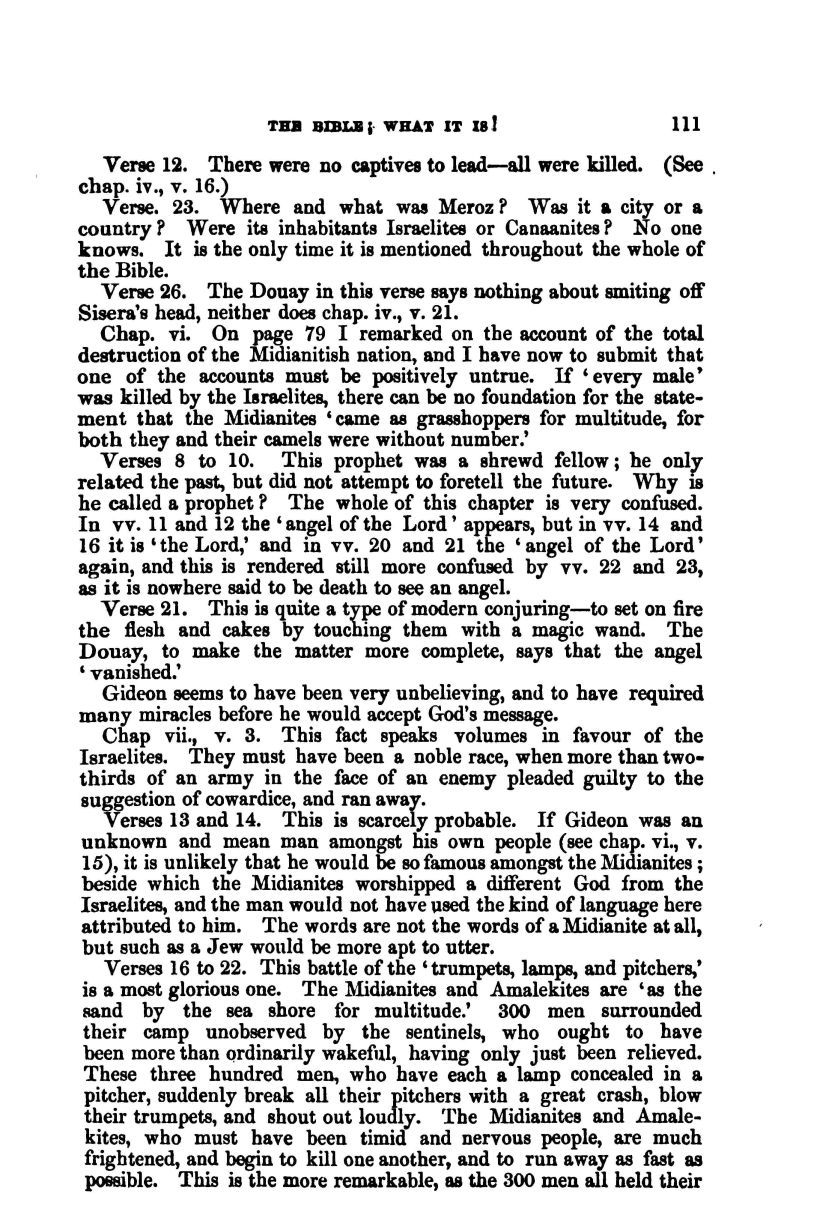 I have a copy printed by Robert Barker before me which contains the whole eighty books. It begins with these words, 'The first book of Moses, called Genesis.' Not one word of this title is to be found in the Hebrew. The word Genesis is a Greek word, signifying production, generation, birth, origin, or formation. It seems curious that the translators should have given a Hebrew book a Greek title. In the Hebrew there is no title to the book; the first word [———] (in the beginning) is merely written in larger characters. The headings to each page and chapter are also additions made by the translators; and this is sometimes very important, as they are made to improperly govern the meaning of the text. As to Genesis being called 'the first book of Moses,' I think that grave censure should be cast on those who prefixed those words; they are entirely omitted in the Douay edition. Long since, our churchmen have been acquainted with the fact that these words, fixing the authorship on Moses, form no part of the original text, yet they allow edition after edition to be printed bearing the same title as that of 1611. Why is this? It is not that they are afraid of tampering with the authorised version, for they have actually, in the later editions, omitted the whole fourteen books of the Apocrypha, which were included in the original edition. {pg5} In an edition of King James's authorised version, printed in 1630, the page containing Ezekiel, chapter 7, is headed by mistake with the word 'Apocrypha.' This mistake has been corrected in the later editions; why not also have corrected those five false statements which allege Moses as the author of the Pentateuch? There have been, also, several printers' errors corrected in the later editions, yet the words in question are allowed to stand; why is this? again I ask. The persistence in an error of so important a character would justify suspicion, and even the allegation of fraudulent intent on the part of those who issue the book. It is an attempt to give an anonymous work an undue claim on our attention. Moses himself, in no part of the five books, claims to be the author of them; and in no part of the Bible is he alleged to be the writer of the Pentateuch. It is certainly alleged that Moses wrote 'the law,' 'the book of the law,' but there is nothing whatever to show that that work outlived the destruction of Jerusalem, and there are several express declarations to the contrary (vide Letter on the Pentateuch by Thomas Cooper, M.D., and Esdras, chap, xiv., v. 21). I am aware of the texts quoted by those who allege that Moses was the author of the whole Pentateuch; viz., Exodus, chap, xvii., v. 14, chap, xxiv., v. 4 and 7, chap, xxxiv., v. 27, Numbers, chap, xxxiii., v. 1 and 2, Deuteronomy, chap, i., v. 5, chap, xxxi., v. 9, 13, 22, 24, 26; but do not think that they will, even in the hands of the most partial supporter of the Mosaic hypothesis, bear on the question sufficiently to decide it in the affirmative, or even to create a presumption in its favour. That Moses was the author of the Pentateuch as it now stands is a proposition which no intelligent man in the present day will venture to support, especially after the elaborate criticisms of Aben Ezra, Spinoza, Hobbes, Peyrerius, Astruc, Pere Simon, Volney, Voltaire, Gesenius, Vater, Paine, and others. The whole of the five books abound with passages which could not have been written by Moses, or during his life time. See—Genesis, chap, xii., v. 6, also chap, xiii., v. 7; these verses must have been written at a period when the Canaanites had been expelled from the land of which they were in quiet possession during the lifetime of Moses:—