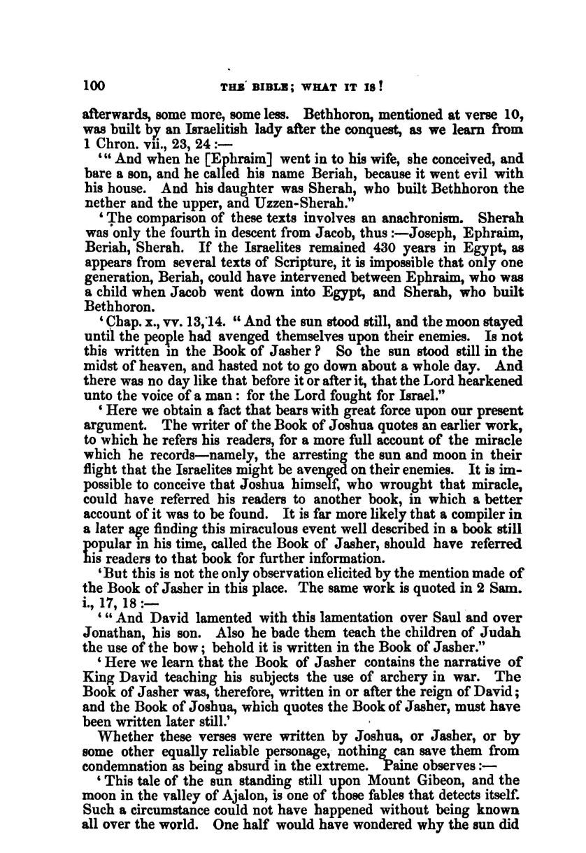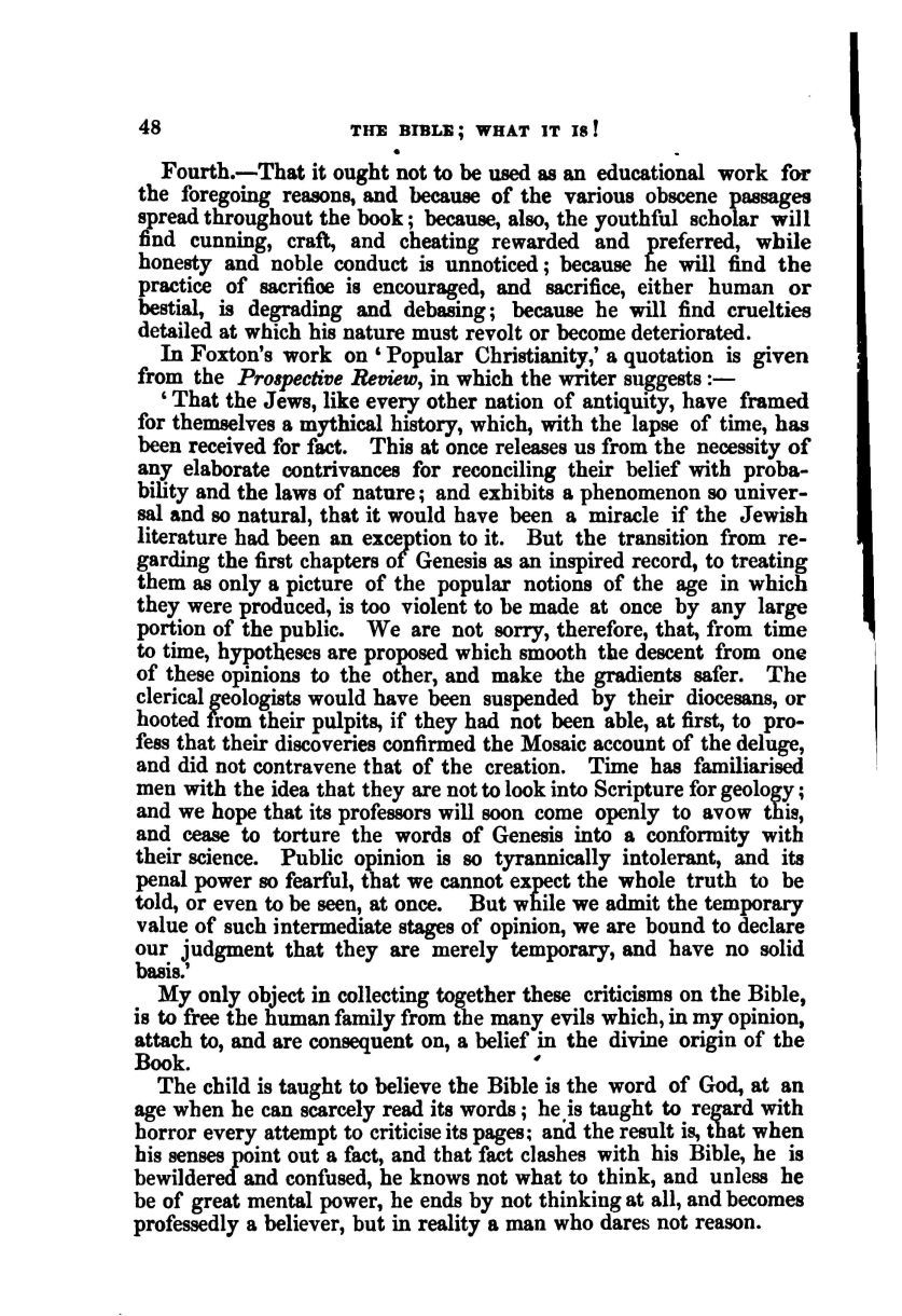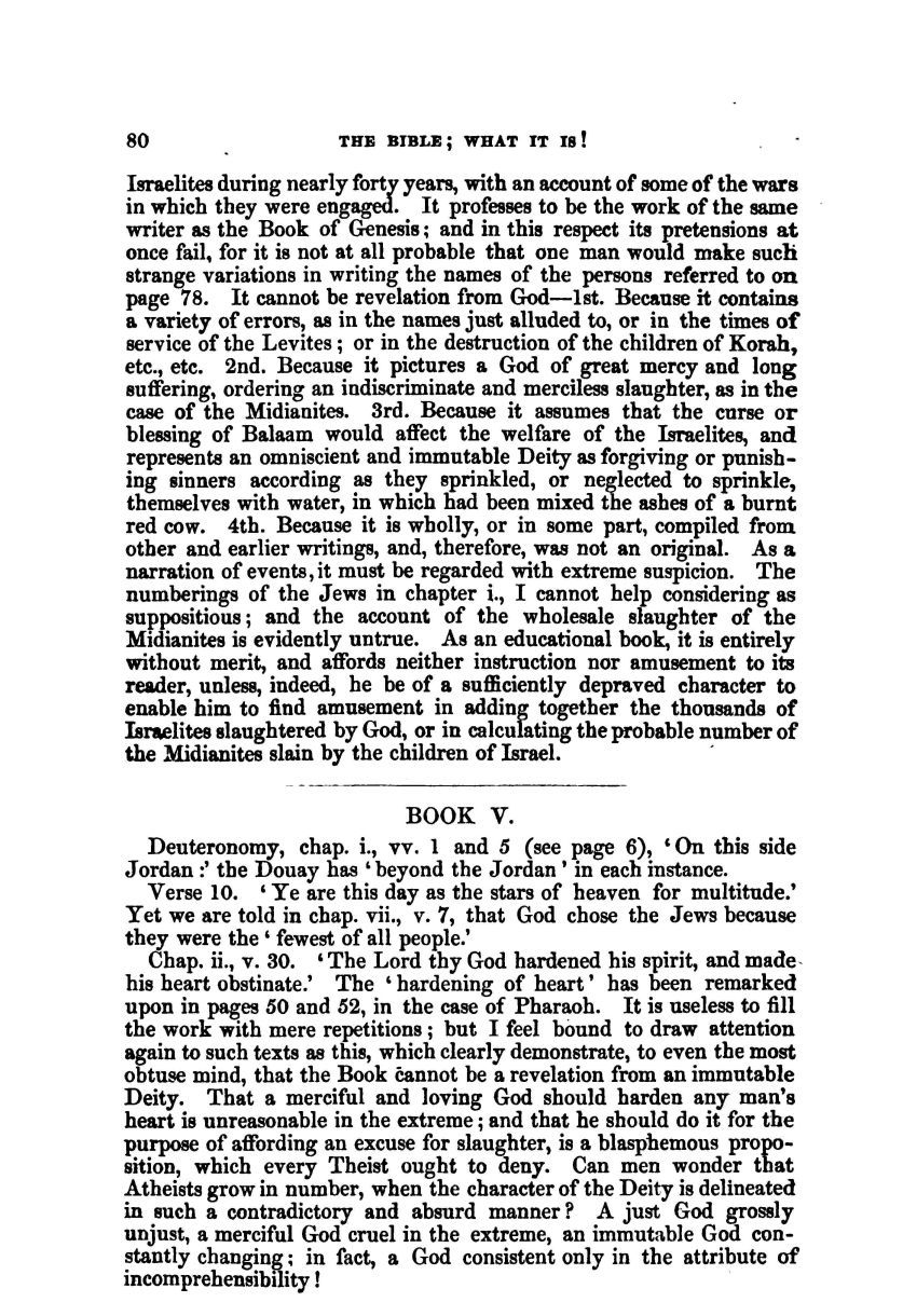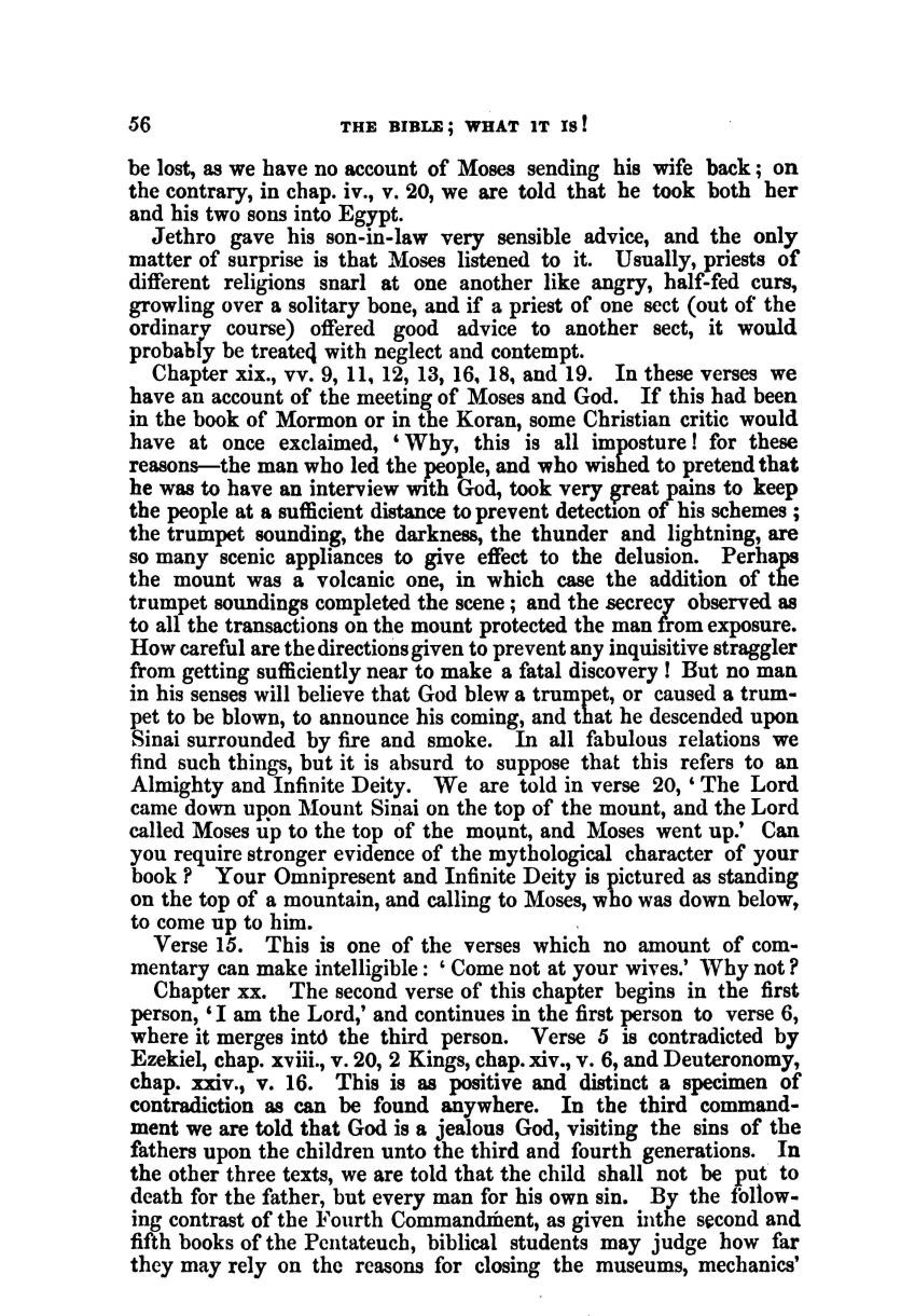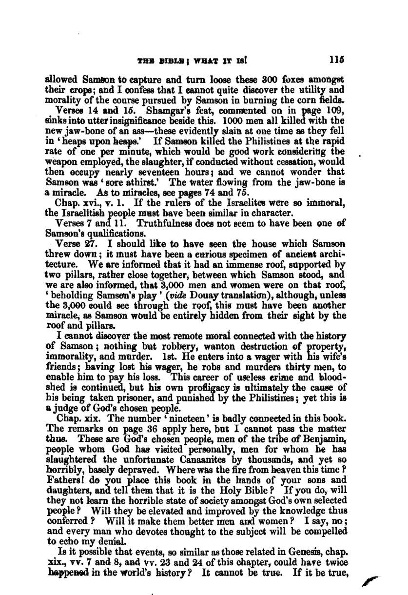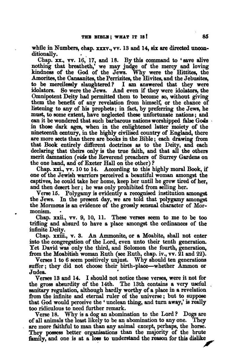 I have a copy printed by Robert Barker before me which contains the whole eighty books. It begins with these words, 'The first book of Moses, called Genesis.' Not one word of this title is to be found in the Hebrew. The word Genesis is a Greek word, signifying production, generation, birth, origin, or formation. It seems curious that the translators should have given a Hebrew book a Greek title. In the Hebrew there is no title to the book; the first word [———] (in the beginning) is merely written in larger characters. The headings to each page and chapter are also additions made by the translators; and this is sometimes very important, as they are made to improperly govern the meaning of the text. As to Genesis being called 'the first book of Moses,' I think that grave censure should be cast on those who prefixed those words; they are entirely omitted in the Douay edition. Long since, our churchmen have been acquainted with the fact that these words, fixing the authorship on Moses, form no part of the original text, yet they allow edition after edition to be printed bearing the same title as that of 1611. Why is this? It is not that they are afraid of tampering with the authorised version, for they have actually, in the later editions, omitted the whole fourteen books of the Apocrypha, which were included in the original edition. {pg5} In an edition of King James's authorised version, printed in 1630, the page containing Ezekiel, chapter 7, is headed by mistake with the word 'Apocrypha.' This mistake has been corrected in the later editions; why not also have corrected those five false statements which allege Moses as the author of the Pentateuch? There have been, also, several printers' errors corrected in the later editions, yet the words in question are allowed to stand; why is this? again I ask. The persistence in an error of so important a character would justify suspicion, and even the allegation of fraudulent intent on the part of those who issue the book. It is an attempt to give an anonymous work an undue claim on our attention. Moses himself, in no part of the five books, claims to be the author of them; and in no part of the Bible is he alleged to be the writer of the Pentateuch. It is certainly alleged that Moses wrote 'the law,' 'the book of the law,' but there is nothing whatever to show that that work outlived the destruction of Jerusalem, and there are several express declarations to the contrary (vide Letter on the Pentateuch by Thomas Cooper, M.D., and Esdras, chap, xiv., v. 21). I am aware of the texts quoted by those who allege that Moses was the author of the whole Pentateuch; viz., Exodus, chap, xvii., v. 14, chap, xxiv., v. 4 and 7, chap, xxxiv., v. 27, Numbers, chap, xxxiii., v. 1 and 2, Deuteronomy, chap, i., v. 5, chap, xxxi., v. 9, 13, 22, 24, 26; but do not think that they will, even in the hands of the most partial supporter of the Mosaic hypothesis, bear on the question sufficiently to decide it in the affirmative, or even to create a presumption in its favour. That Moses was the author of the Pentateuch as it now stands is a proposition which no intelligent man in the present day will venture to support, especially after the elaborate criticisms of Aben Ezra, Spinoza, Hobbes, Peyrerius, Astruc, Pere Simon, Volney, Voltaire, Gesenius, Vater, Paine, and others. The whole of the five books abound with passages which could not have been written by Moses, or during his life time. See—Genesis, chap, xii., v. 6, also chap, xiii., v. 7; these verses must have been written at a period when the Canaanites had been expelled from the land of which they were in quiet possession during the lifetime of Moses:—
