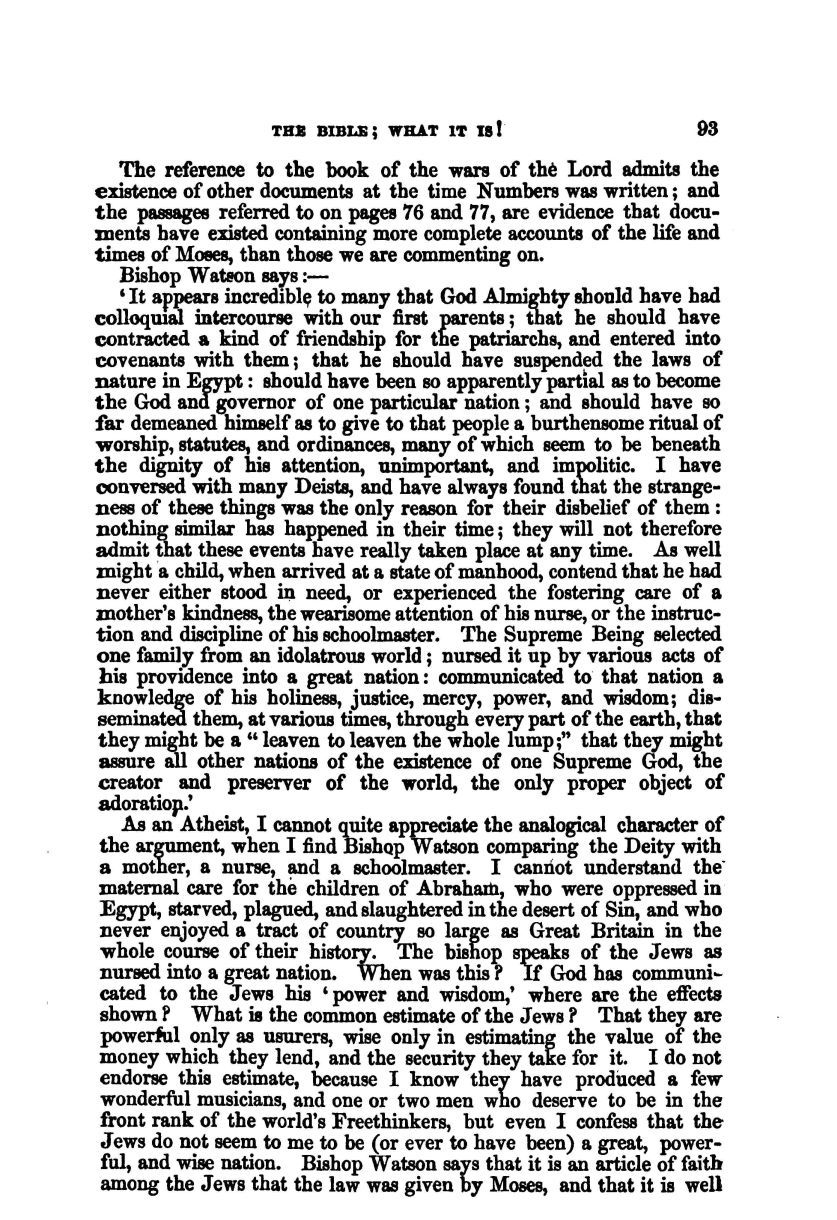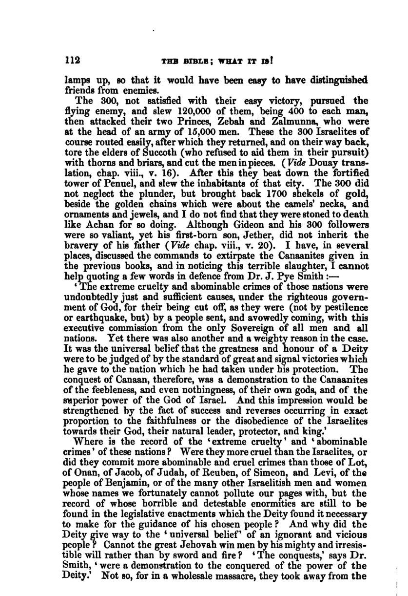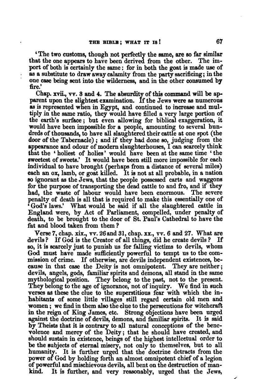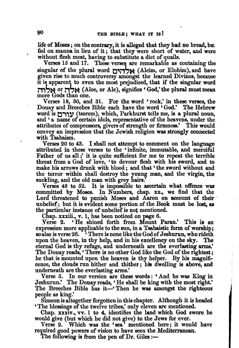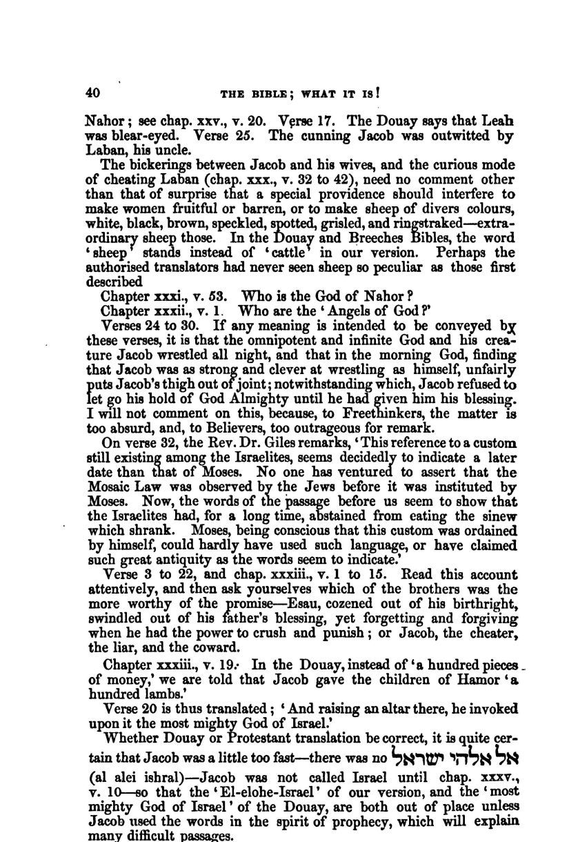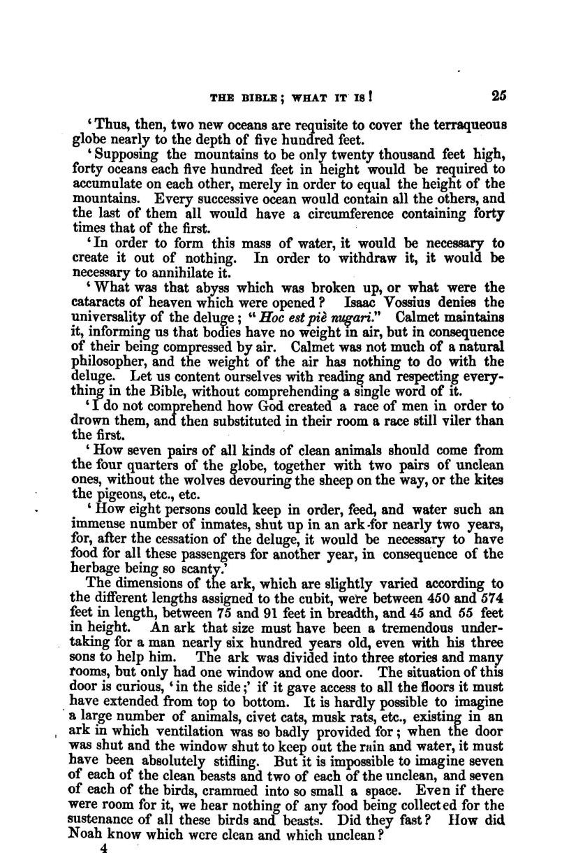 I have a copy printed by Robert Barker before me which contains the whole eighty books. It begins with these words, 'The first book of Moses, called Genesis.' Not one word of this title is to be found in the Hebrew. The word Genesis is a Greek word, signifying production, generation, birth, origin, or formation. It seems curious that the translators should have given a Hebrew book a Greek title. In the Hebrew there is no title to the book; the first word [———] (in the beginning) is merely written in larger characters. The headings to each page and chapter are also additions made by the translators; and this is sometimes very important, as they are made to improperly govern the meaning of the text. As to Genesis being called 'the first book of Moses,' I think that grave censure should be cast on those who prefixed those words; they are entirely omitted in the Douay edition. Long since, our churchmen have been acquainted with the fact that these words, fixing the authorship on Moses, form no part of the original text, yet they allow edition after edition to be printed bearing the same title as that of 1611. Why is this? It is not that they are afraid of tampering with the authorised version, for they have actually, in the later editions, omitted the whole fourteen books of the Apocrypha, which were included in the original edition. {pg5} In an edition of King James's authorised version, printed in 1630, the page containing Ezekiel, chapter 7, is headed by mistake with the word 'Apocrypha.' This mistake has been corrected in the later editions; why not also have corrected those five false statements which allege Moses as the author of the Pentateuch? There have been, also, several printers' errors corrected in the later editions, yet the words in question are allowed to stand; why is this? again I ask. The persistence in an error of so important a character would justify suspicion, and even the allegation of fraudulent intent on the part of those who issue the book. It is an attempt to give an anonymous work an undue claim on our attention. Moses himself, in no part of the five books, claims to be the author of them; and in no part of the Bible is he alleged to be the writer of the Pentateuch. It is certainly alleged that Moses wrote 'the law,' 'the book of the law,' but there is nothing whatever to show that that work outlived the destruction of Jerusalem, and there are several express declarations to the contrary (vide Letter on the Pentateuch by Thomas Cooper, M.D., and Esdras, chap, xiv., v. 21). I am aware of the texts quoted by those who allege that Moses was the author of the whole Pentateuch; viz., Exodus, chap, xvii., v. 14, chap, xxiv., v. 4 and 7, chap, xxxiv., v. 27, Numbers, chap, xxxiii., v. 1 and 2, Deuteronomy, chap, i., v. 5, chap, xxxi., v. 9, 13, 22, 24, 26; but do not think that they will, even in the hands of the most partial supporter of the Mosaic hypothesis, bear on the question sufficiently to decide it in the affirmative, or even to create a presumption in its favour. That Moses was the author of the Pentateuch as it now stands is a proposition which no intelligent man in the present day will venture to support, especially after the elaborate criticisms of Aben Ezra, Spinoza, Hobbes, Peyrerius, Astruc, Pere Simon, Volney, Voltaire, Gesenius, Vater, Paine, and others. The whole of the five books abound with passages which could not have been written by Moses, or during his life time. See—Genesis, chap, xii., v. 6, also chap, xiii., v. 7; these verses must have been written at a period when the Canaanites had been expelled from the land of which they were in quiet possession during the lifetime of Moses:—