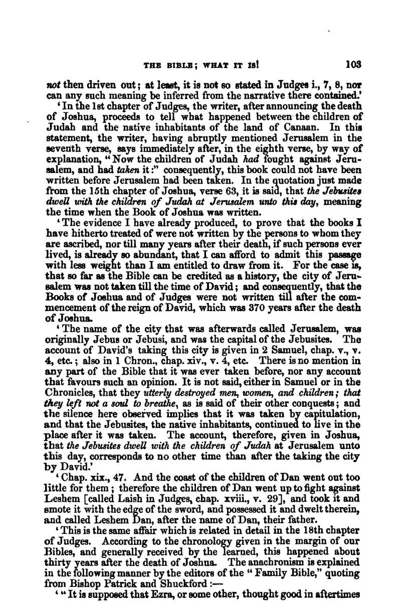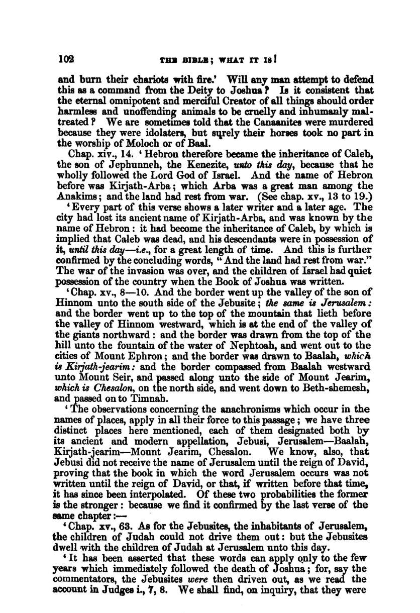 Genesis, chap, xiv., v. 14. The city of Lais, Laish, or Leshem, was not called Dan until long after the death of Moses, when the Danites possessed themselves of it and called it after Dan, their father (vide Joshua, chap, xix., v. 47, and Judges, chap, xviii., v. 29):—Genesis, chap, xiii., v. 18, chap, xxiii., v. 2 and 19, chap, xxv., v. 27, &c. These verses and several others, in which Hebron is named, cannot be from the pen of Moses, for there was no such place as Hebron in his day. Kirjath Arba was not called Hebron until given to Caleb, son of Jephunneh, long after the death of Moses (vide Joshua, chap, xiv., v. 14 and 15):—
