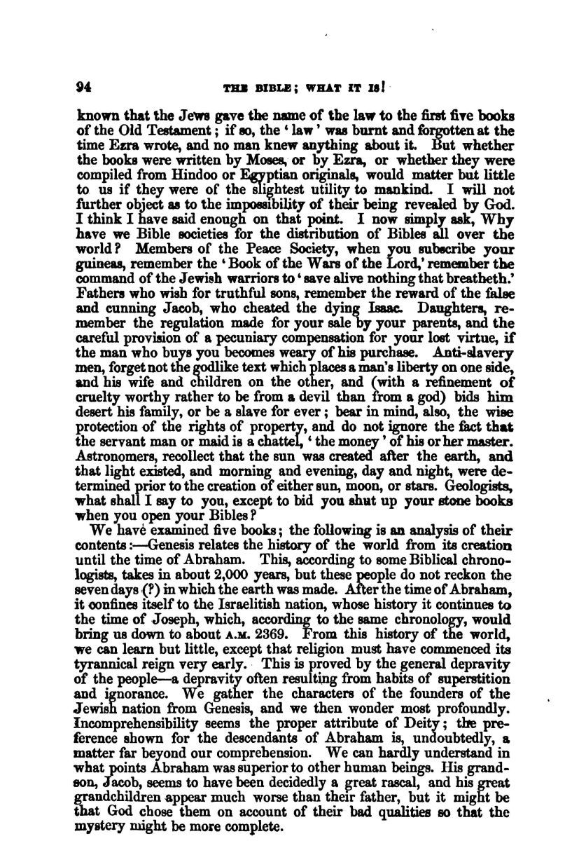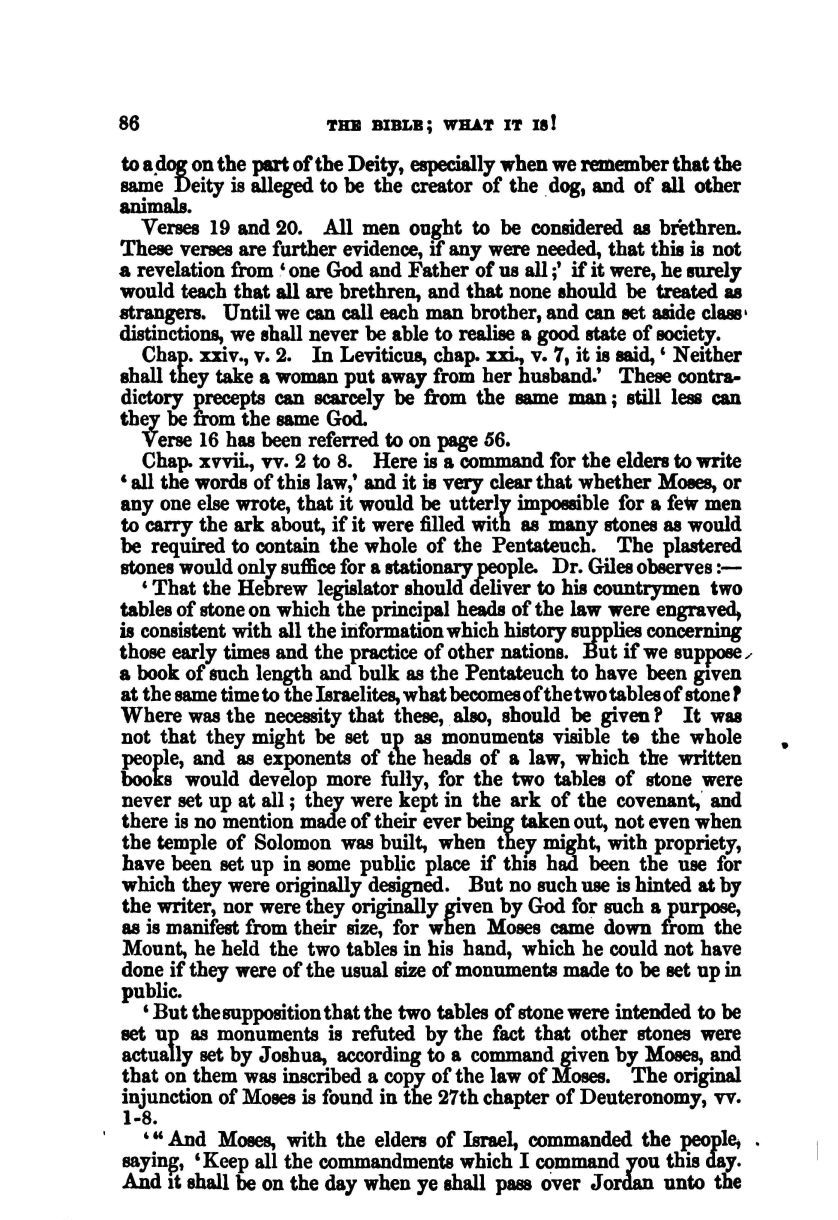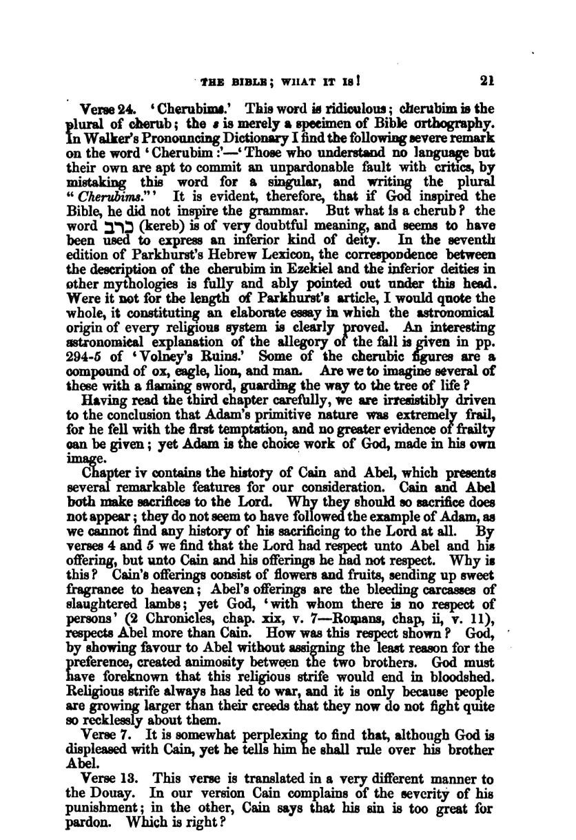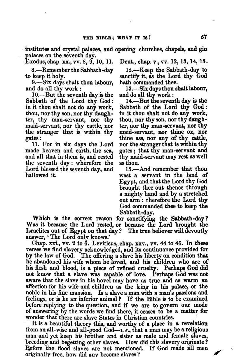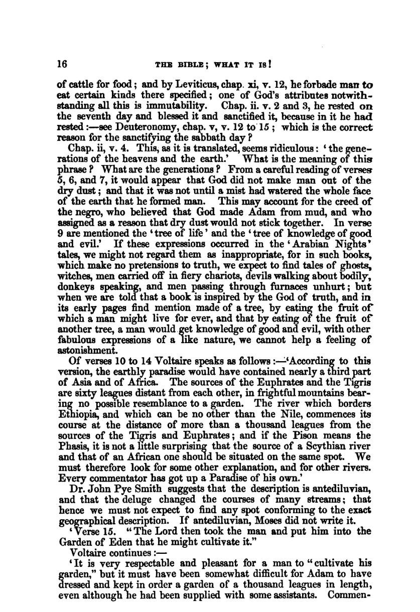 Genesis, chap, i, v. 1 to 27. Whoever wrote these verses must either have been an inspired man, a dupe, or a knave—that is, he could not have gathered from tradition, because here tradition is outstepped; it could not have been known by man, as he was not yet made; he must either have received it from God, or have been deceived by man, or must have intended to deceive man himself. If inspired, it is a pity God did not explain the creation of light before the sun ( verse 3), the creation of herbs and fruit trees bearing seed and fruit before there was a sun to ripen the fruit and bring the seed to maturity (verse 11), the creation of 'female-man' in his own image (verse 27), etc. By verse 29 it appears that God intended man to be a vegetarian; by Genesis, chap, ix, v. 3, he gave them all kinds {pg16} of cattle for food; and by Leviticus, chap, xi, v. 12, he forbade man to eat certain kinds there specified; one of God's attributes notwithstanding all this is immutability. Chap. ii. v. 2 and 3, he rested on the seventh day and blessed it and sanctified it, because in it he had rested:—see Deuteronomy, chap, v, v. 12 to 15; which is the correct reason for the sanctifying the sabbath day?