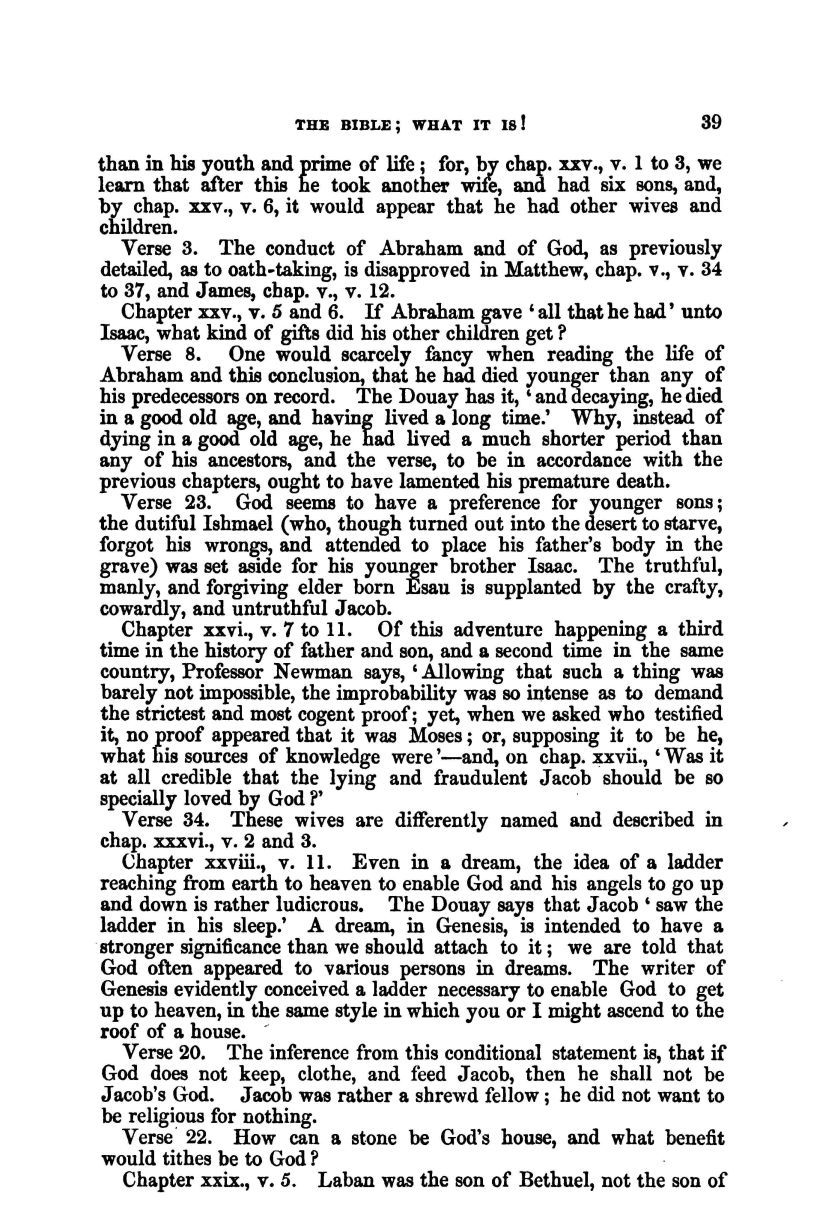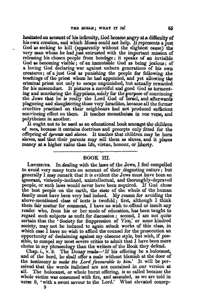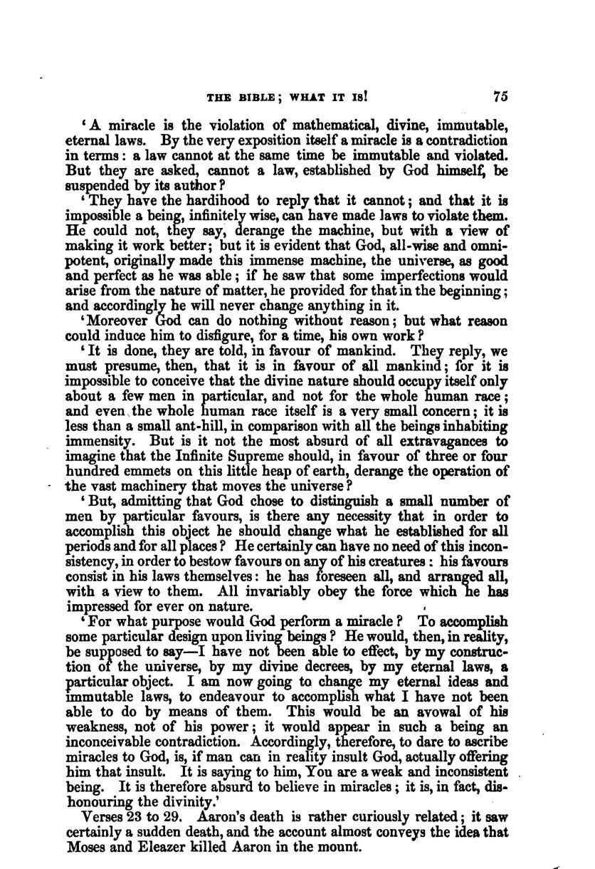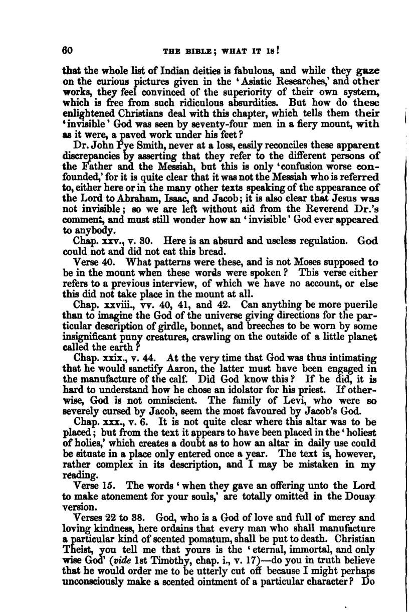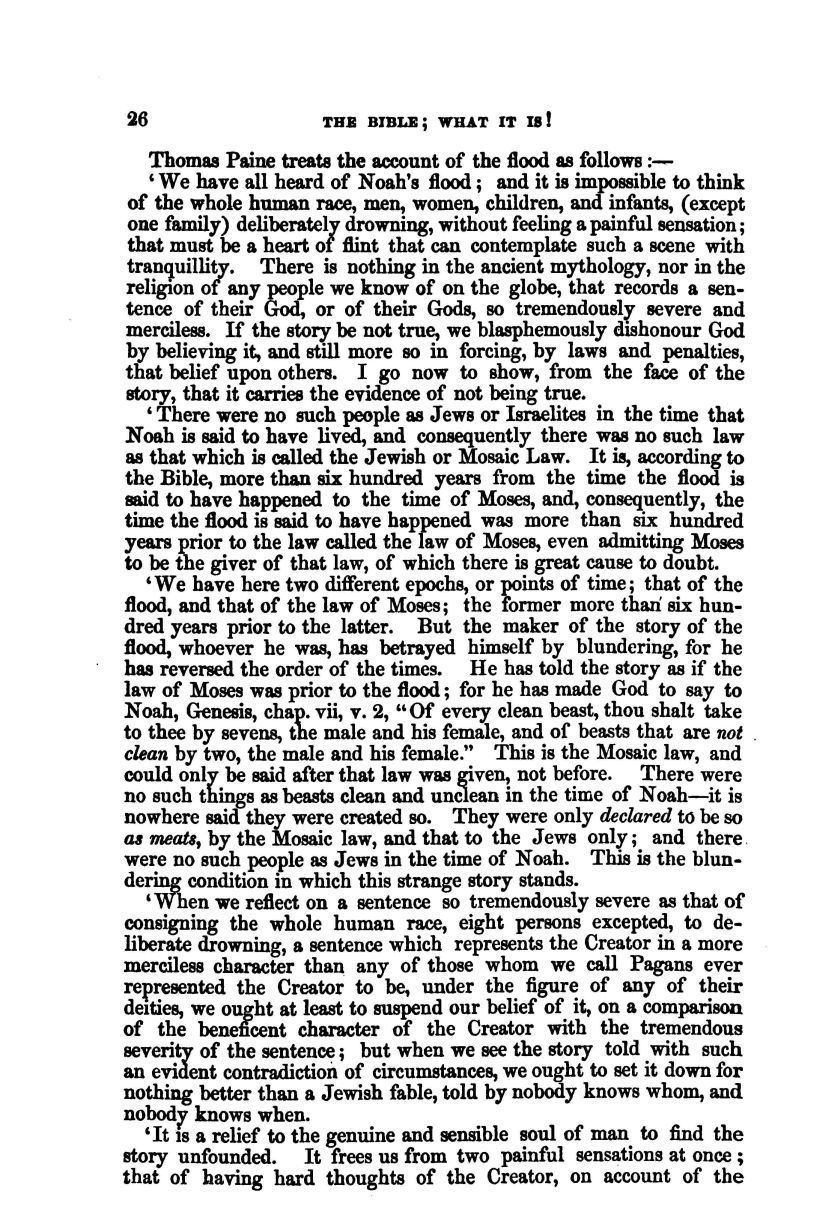 Genesis, chap, i, v. 1 to 27. Whoever wrote these verses must either have been an inspired man, a dupe, or a knave—that is, he could not have gathered from tradition, because here tradition is outstepped; it could not have been known by man, as he was not yet made; he must either have received it from God, or have been deceived by man, or must have intended to deceive man himself. If inspired, it is a pity God did not explain the creation of light before the sun ( verse 3), the creation of herbs and fruit trees bearing seed and fruit before there was a sun to ripen the fruit and bring the seed to maturity (verse 11), the creation of 'female-man' in his own image (verse 27), etc. By verse 29 it appears that God intended man to be a vegetarian; by Genesis, chap, ix, v. 3, he gave them all kinds {pg16} of cattle for food; and by Leviticus, chap, xi, v. 12, he forbade man to eat certain kinds there specified; one of God's attributes notwithstanding all this is immutability. Chap. ii. v. 2 and 3, he rested on the seventh day and blessed it and sanctified it, because in it he had rested:—see Deuteronomy, chap, v, v. 12 to 15; which is the correct reason for the sanctifying the sabbath day?