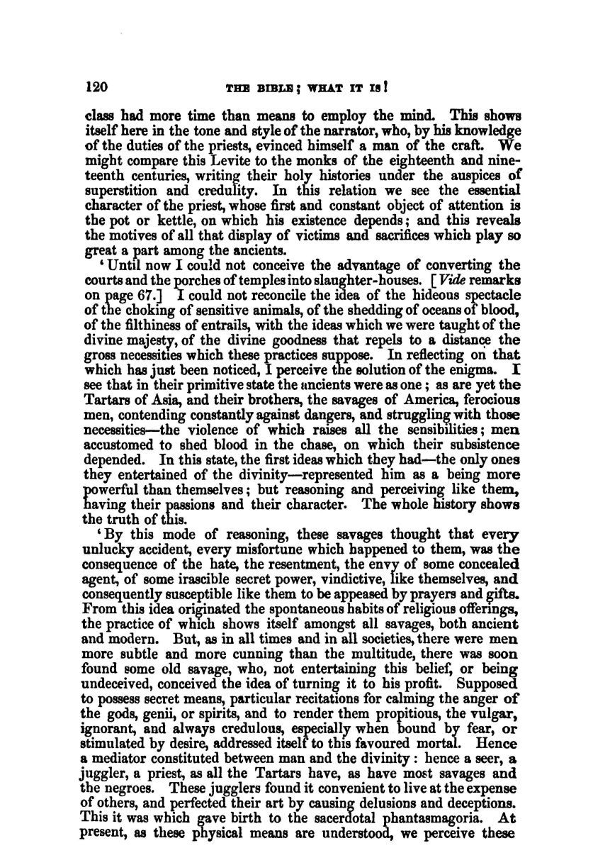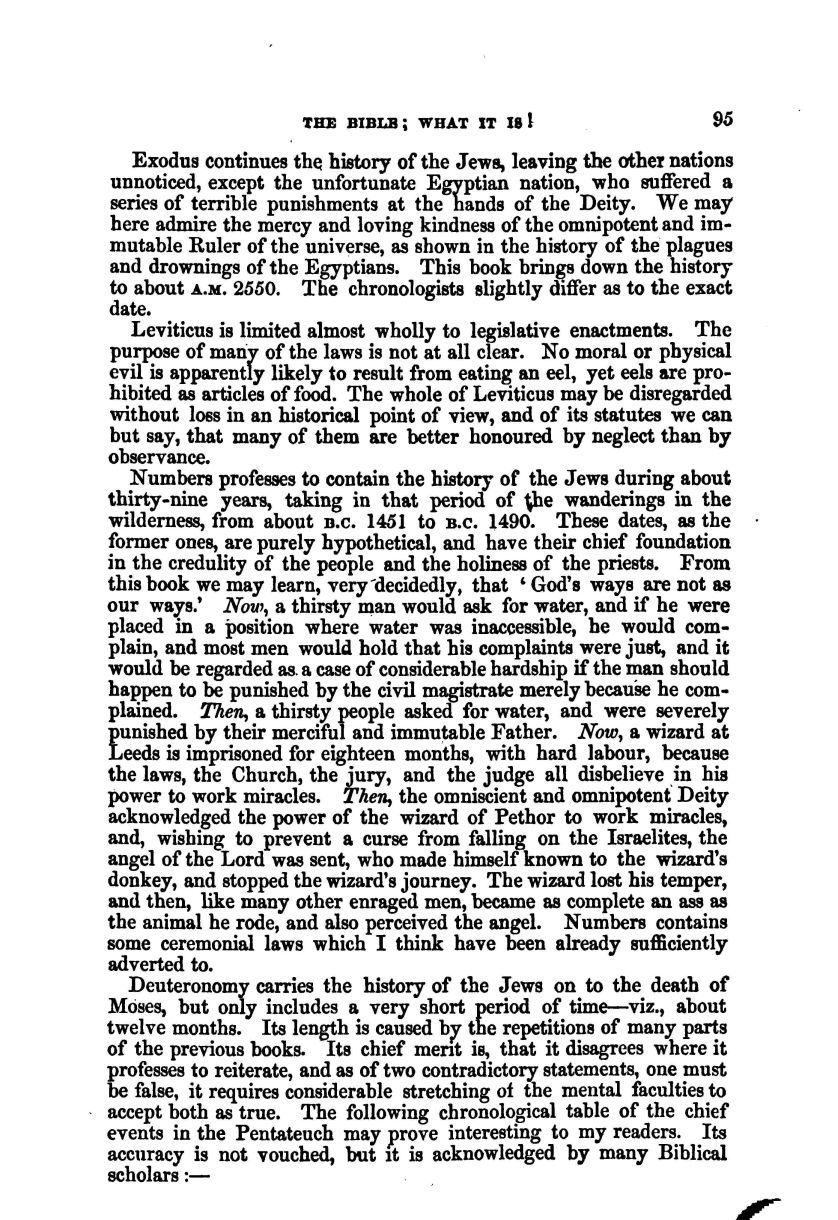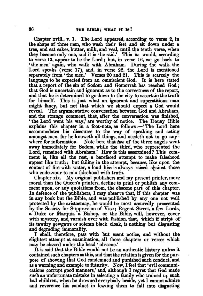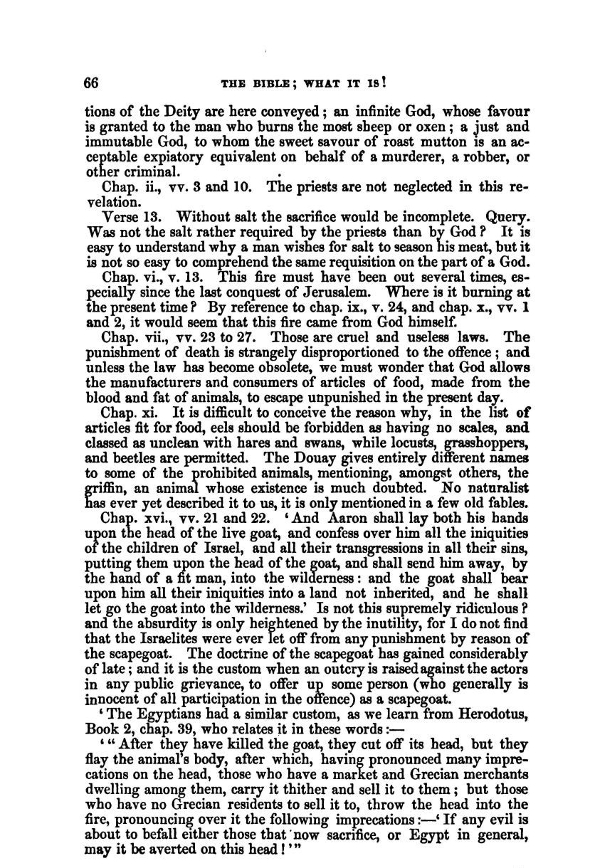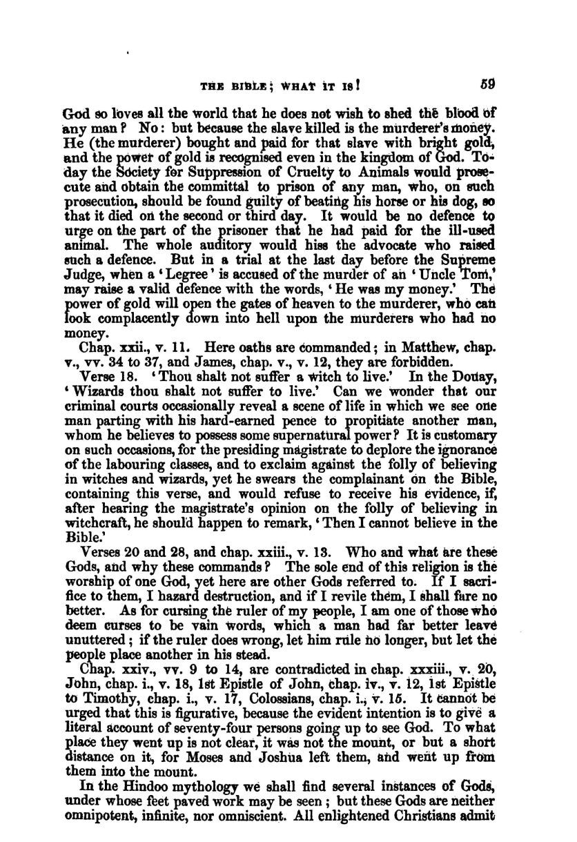 Genesis, chap, i, v. 1 to 27. Whoever wrote these verses must either have been an inspired man, a dupe, or a knave—that is, he could not have gathered from tradition, because here tradition is outstepped; it could not have been known by man, as he was not yet made; he must either have received it from God, or have been deceived by man, or must have intended to deceive man himself. If inspired, it is a pity God did not explain the creation of light before the sun ( verse 3), the creation of herbs and fruit trees bearing seed and fruit before there was a sun to ripen the fruit and bring the seed to maturity (verse 11), the creation of 'female-man' in his own image (verse 27), etc. By verse 29 it appears that God intended man to be a vegetarian; by Genesis, chap, ix, v. 3, he gave them all kinds {pg16} of cattle for food; and by Leviticus, chap, xi, v. 12, he forbade man to eat certain kinds there specified; one of God's attributes notwithstanding all this is immutability. Chap. ii. v. 2 and 3, he rested on the seventh day and blessed it and sanctified it, because in it he had rested:—see Deuteronomy, chap, v, v. 12 to 15; which is the correct reason for the sanctifying the sabbath day?