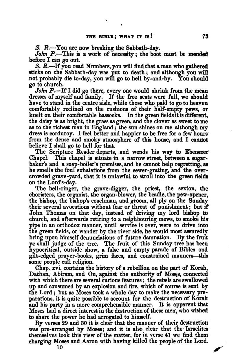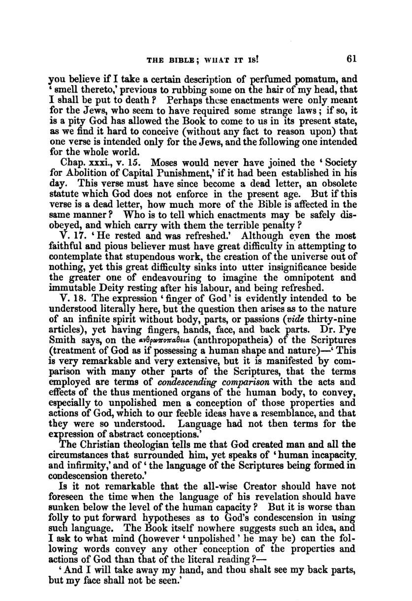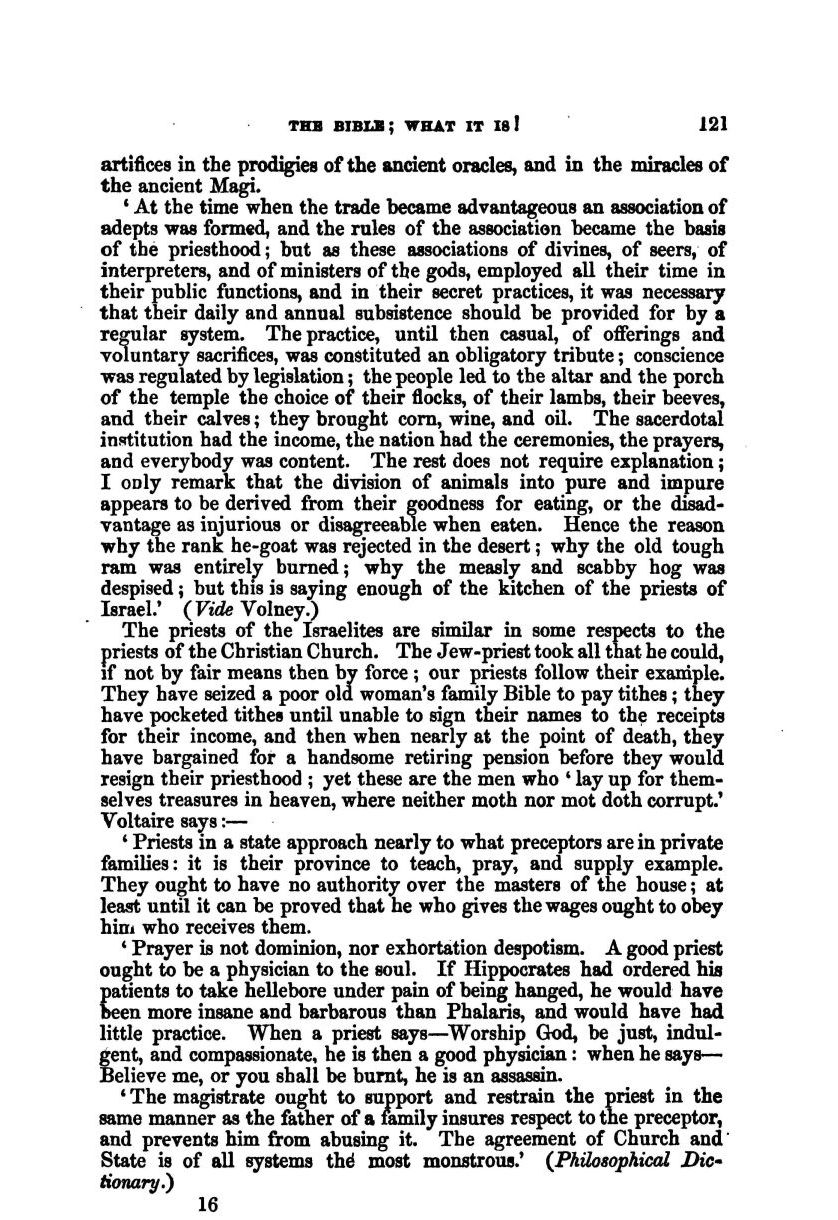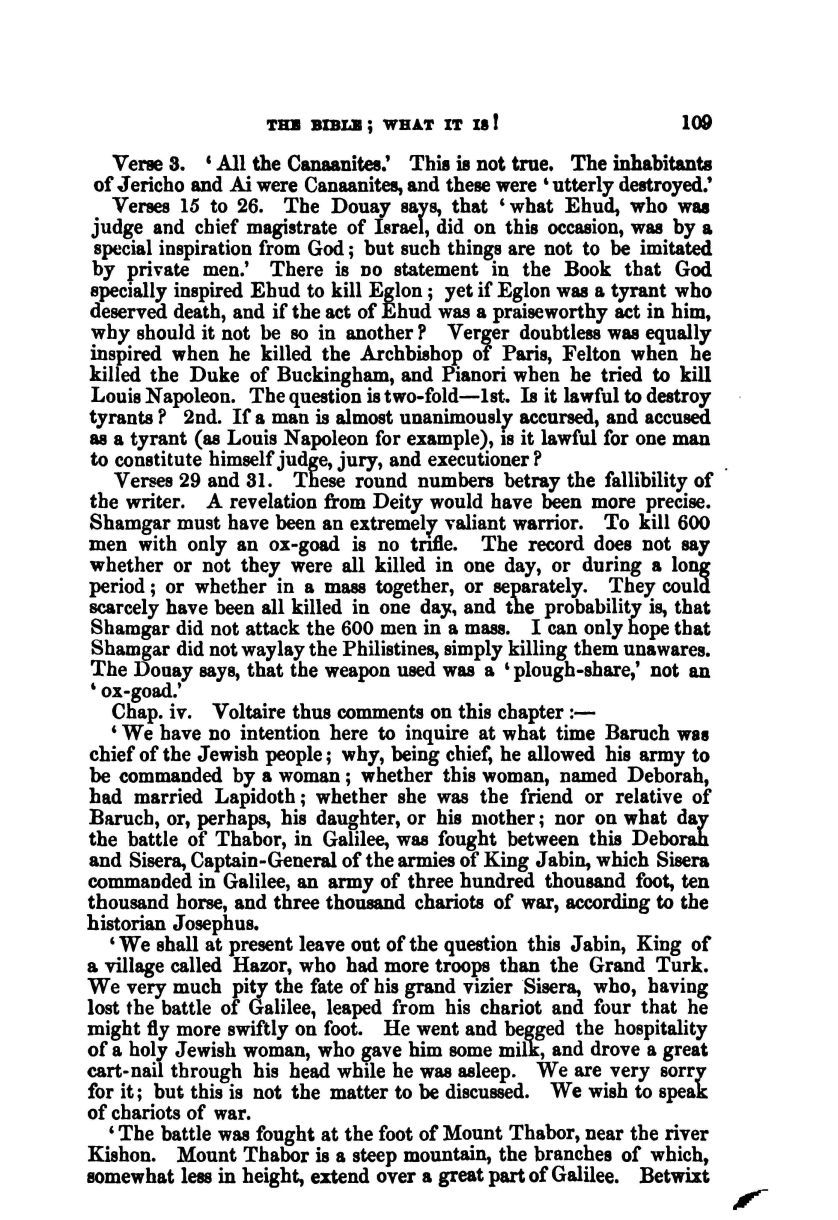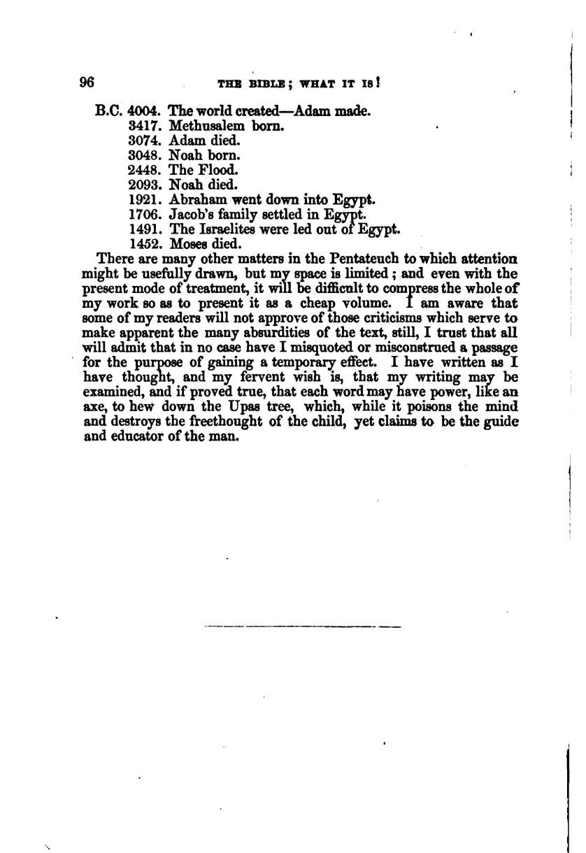 Genesis, chap, i, v. 1 to 27. Whoever wrote these verses must either have been an inspired man, a dupe, or a knave—that is, he could not have gathered from tradition, because here tradition is outstepped; it could not have been known by man, as he was not yet made; he must either have received it from God, or have been deceived by man, or must have intended to deceive man himself. If inspired, it is a pity God did not explain the creation of light before the sun ( verse 3), the creation of herbs and fruit trees bearing seed and fruit before there was a sun to ripen the fruit and bring the seed to maturity (verse 11), the creation of 'female-man' in his own image (verse 27), etc. By verse 29 it appears that God intended man to be a vegetarian; by Genesis, chap, ix, v. 3, he gave them all kinds {pg16} of cattle for food; and by Leviticus, chap, xi, v. 12, he forbade man to eat certain kinds there specified; one of God's attributes notwithstanding all this is immutability. Chap. ii. v. 2 and 3, he rested on the seventh day and blessed it and sanctified it, because in it he had rested:—see Deuteronomy, chap, v, v. 12 to 15; which is the correct reason for the sanctifying the sabbath day?