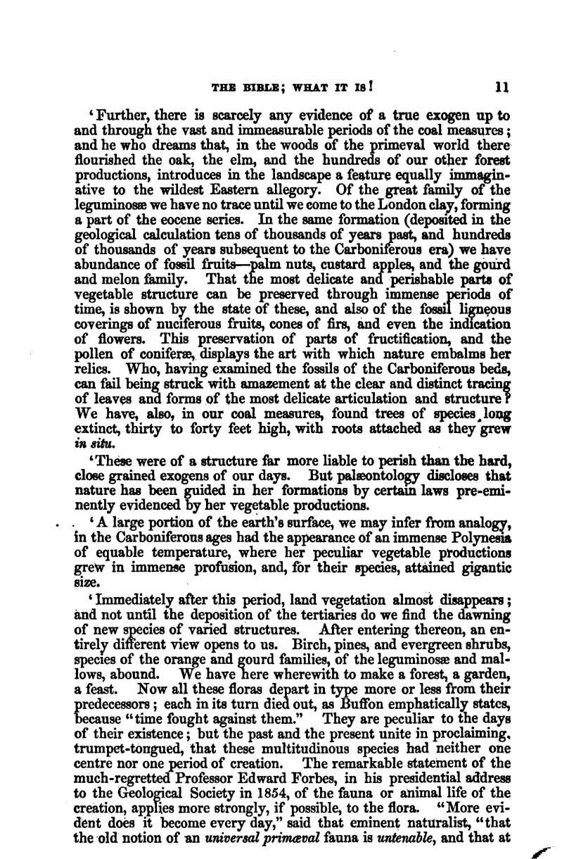 'Of the oneness of vegetable "creation," "making," or "formation," Genesis leaves no doubt. Now Geology, or rather palaeontology, adduces many proofs which, to unbiassed minds, I apprehend, will be conclusive, that such was not the case; but, on the contrary, the vegetable world progressed with the altered structural and climatic conditions of the earth. This is evidenced by the presence of special fossil vegetable productions in certain strata, and the absence of others. Negative evidence may, in some cases, be inconclusive; but it must be borne in mind that there are certain conditions or collateral circumstances which impart to negative the force and conclusiveness of positive and direct affirmative testimony. Thus, in considering the value of that evidence in favour of the existence of a certain class of vegetable life at any given period, if we find (says the Rev. B. Powell) that some vegetable forms existed, and a fitness at the same period for the existence of others, the non-appearance of the latter in such cases is tantamount to "non-existence." On evidence thus valued we will inquire into the simultaneous creation and existence of the vegetable world as related in the 11th and 12th verses.