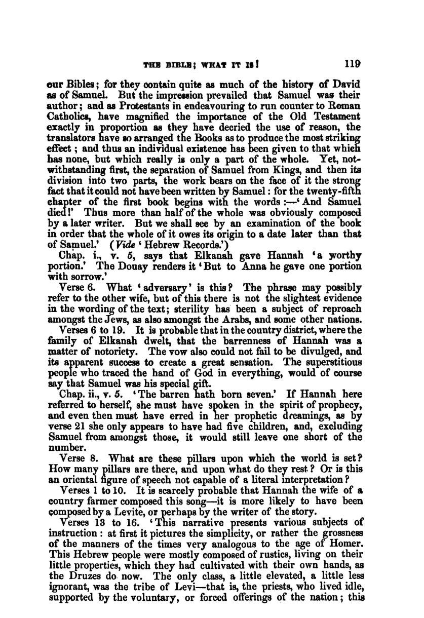 '"The day when Samuel wrote this book: when the events happened he was a youth: but the book was written when he was advanced in years." {pg128} 'The space of time between this event and Samuel's death was about forty years—not long enough to justify the expression "unto this day." It must not be taken for granted that Samuel wrote this book; and the verse before us tells as plainly as words can express, that Samuel must have been dead many years, perhaps centuries, when it was written. But the commentators have not seen the natural force of the words, on account of the erroneous opinion that Samuel was the writer, with which they would make the narrative harmonise.' ( Vide 'Hebrew Records.')