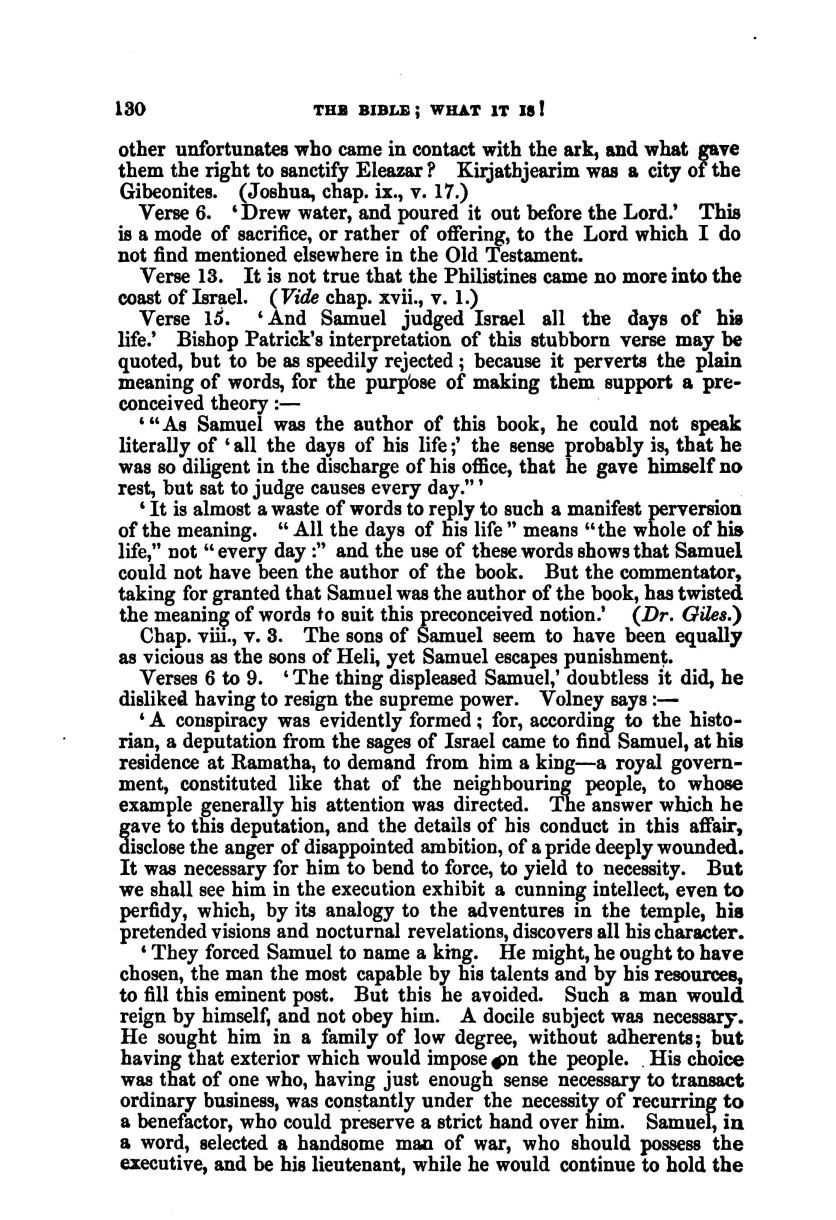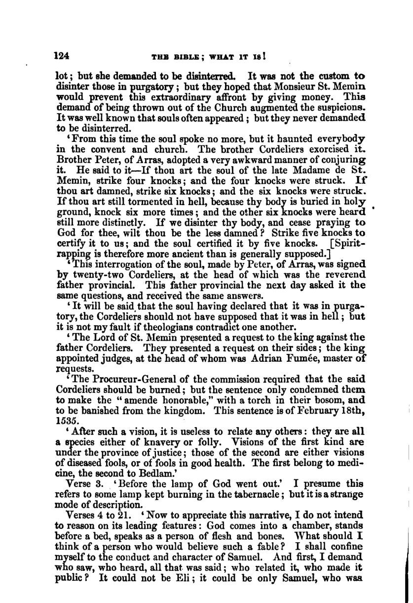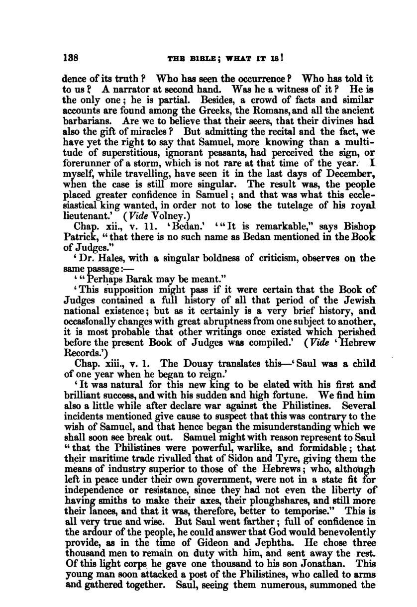 'This recital is very well, but we have a right to ask for the {pg138} evidence of its truth? Who has seen the occurrence? Who has told it to us? A narrator at second hand. Was he a witness of it? He is the only one; he is partial. Besides, a crowd of facts and similar accounts are found among the Greeks, the Romans, and all the ancient barbarians. Are we to believe that their seers, that their divines had also the gift of miracles? But admitting the recital and the fact, we have yet the right to say that Samuel, more knowing than a multitude of superstitious, ignorant peasants, had perceived the sign, or forerunner of a storm, which is not rare at that time of the year. I myself, while travelling, have seen it in the last days of December, when the case is still more singular. The result was, the people placed greater confidence in Samuel; and that was what this ecclesiastical king wanted, in order not to lose the tutelage of his royal lieutenant.' ( Vide Volney.)