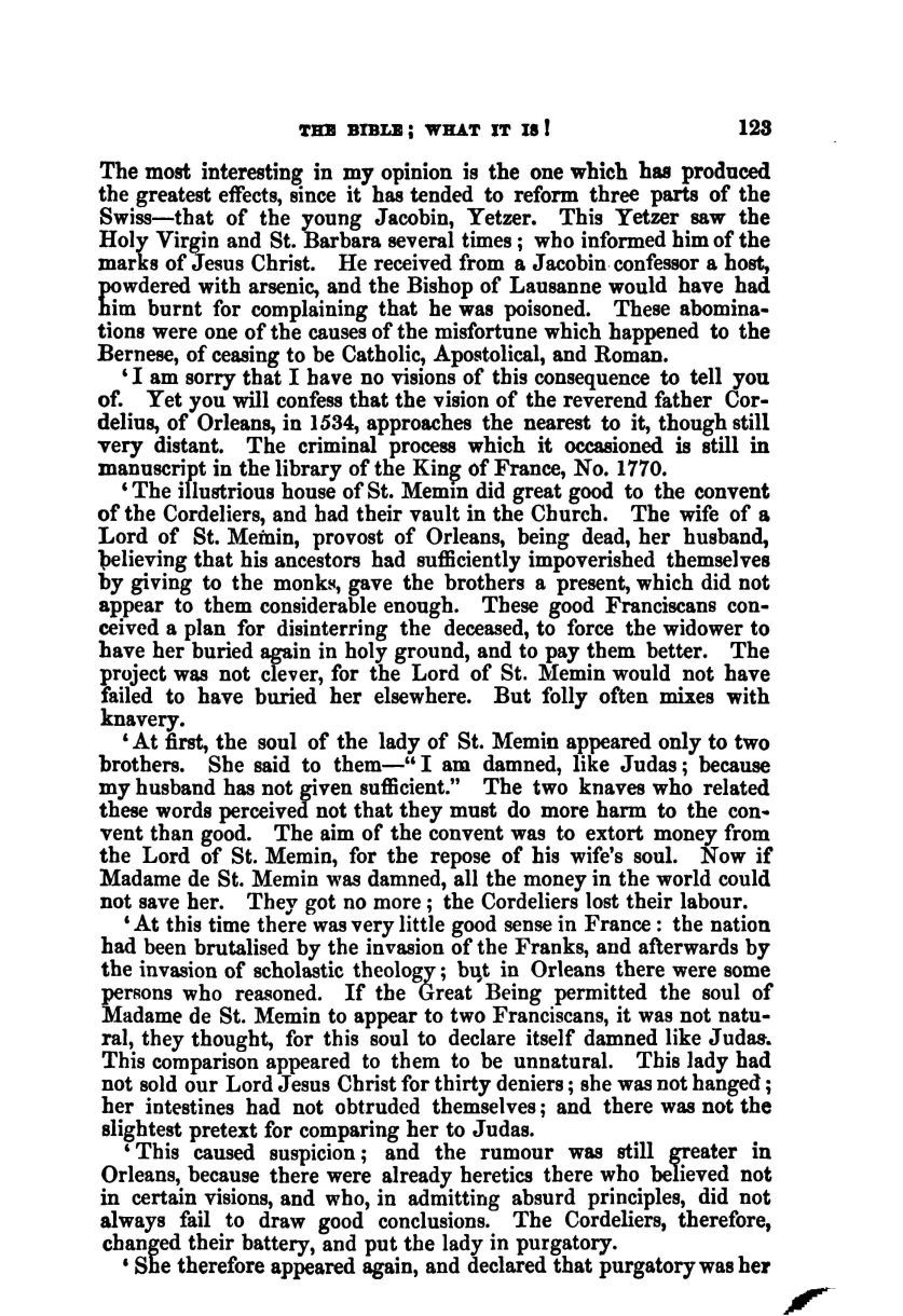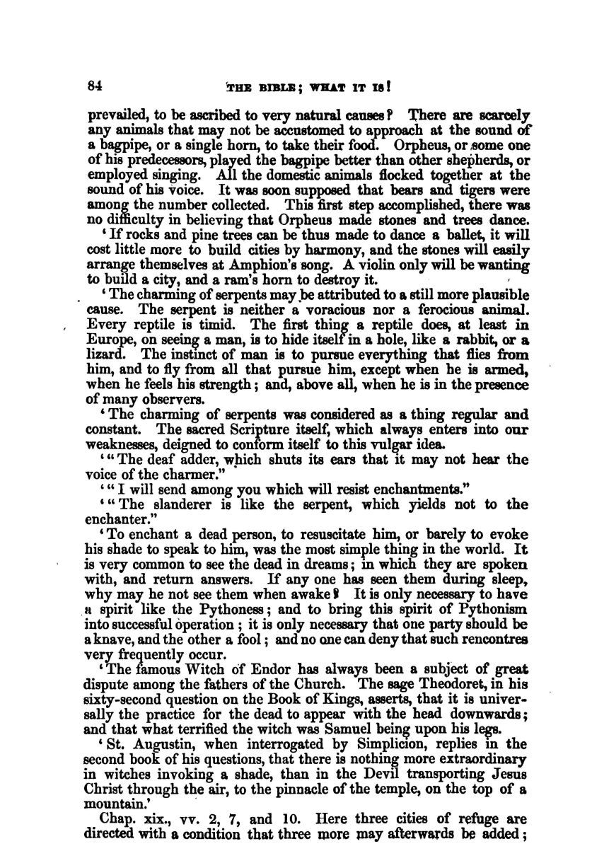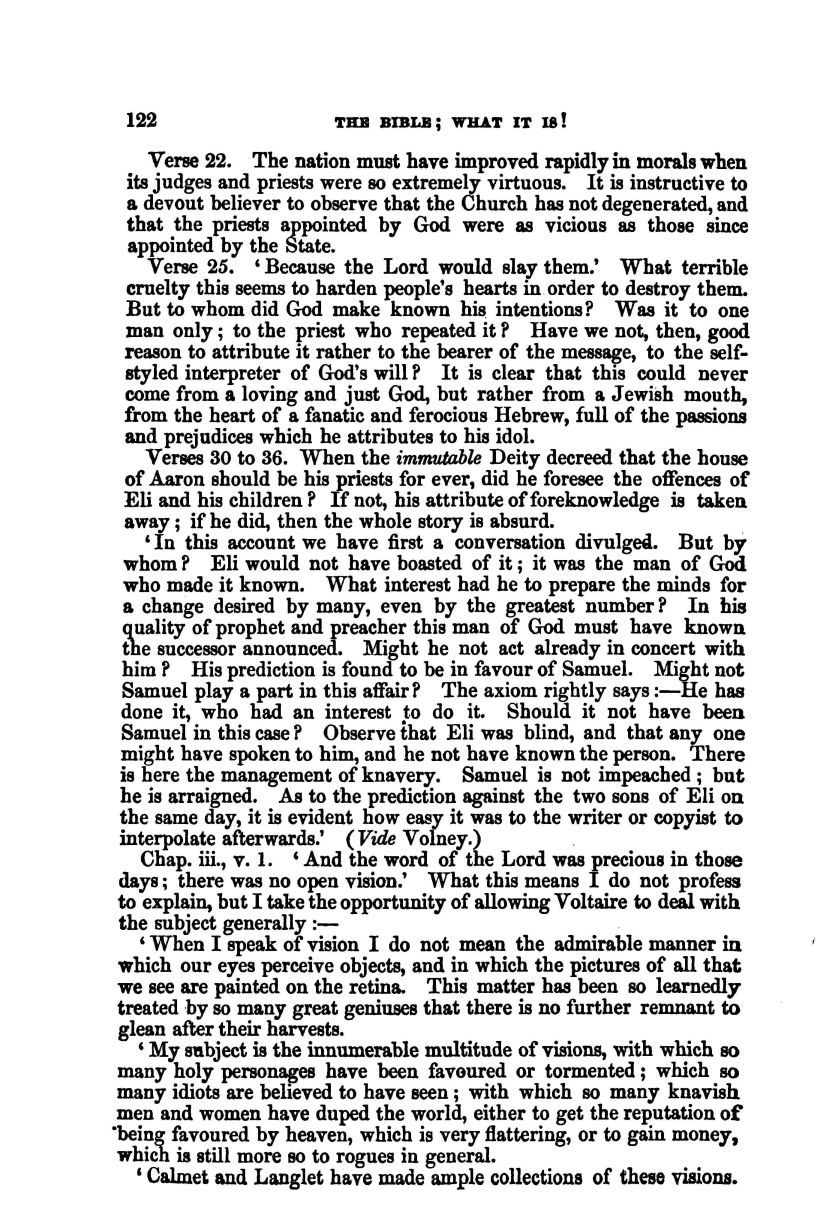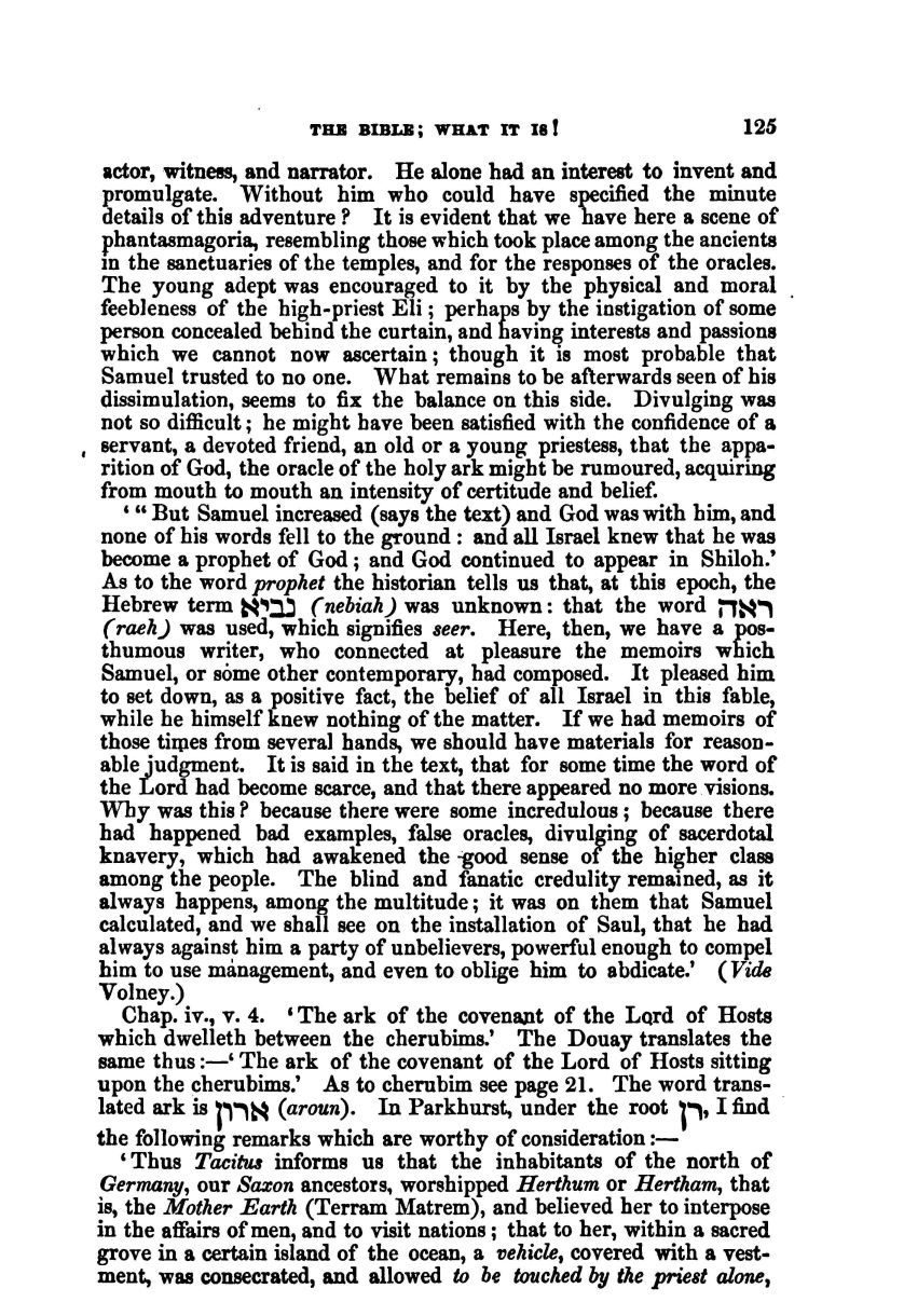 'This recital is very well, but we have a right to ask for the {pg138} evidence of its truth? Who has seen the occurrence? Who has told it to us? A narrator at second hand. Was he a witness of it? He is the only one; he is partial. Besides, a crowd of facts and similar accounts are found among the Greeks, the Romans, and all the ancient barbarians. Are we to believe that their seers, that their divines had also the gift of miracles? But admitting the recital and the fact, we have yet the right to say that Samuel, more knowing than a multitude of superstitious, ignorant peasants, had perceived the sign, or forerunner of a storm, which is not rare at that time of the year. I myself, while travelling, have seen it in the last days of December, when the case is still more singular. The result was, the people placed greater confidence in Samuel; and that was what this ecclesiastical king wanted, in order not to lose the tutelage of his royal lieutenant.' ( Vide Volney.)