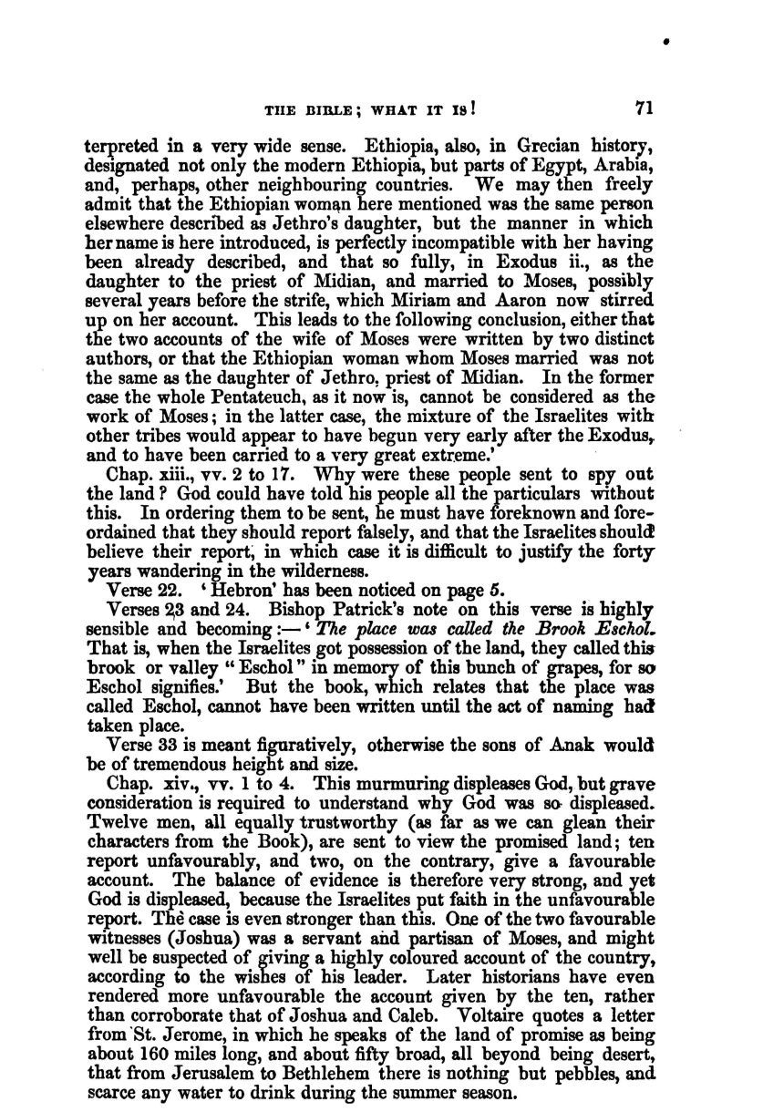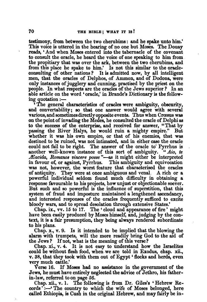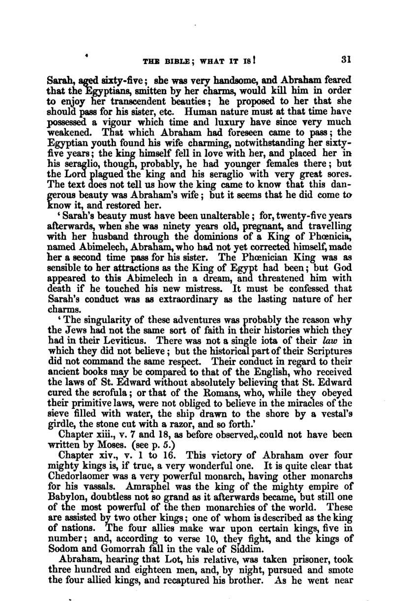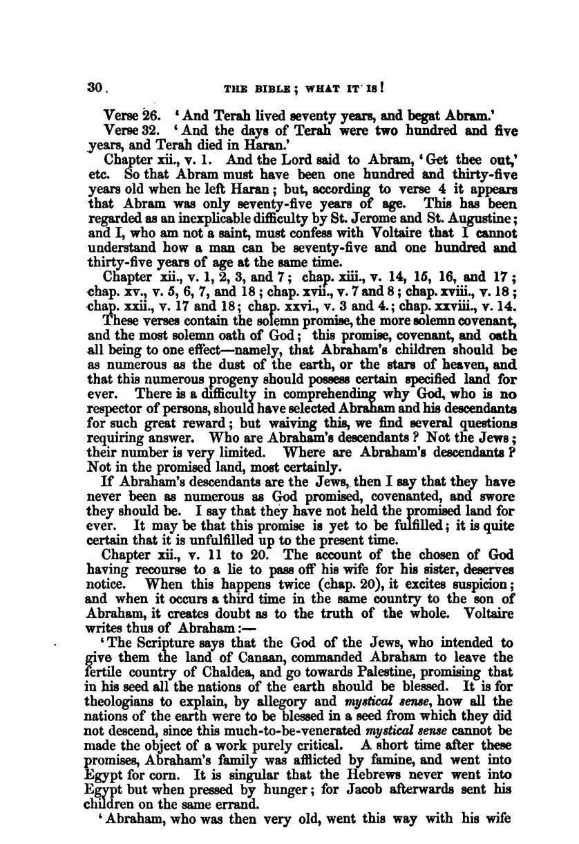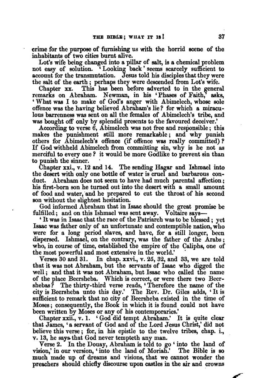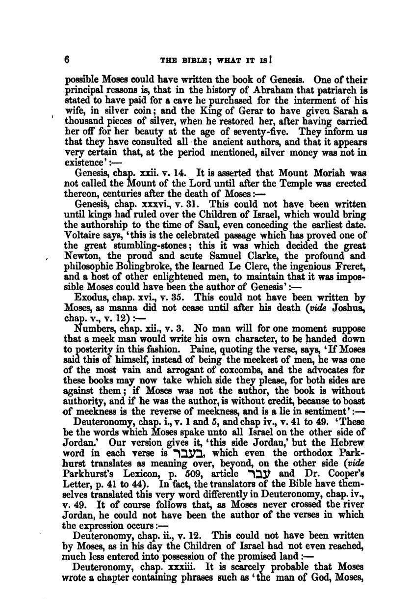 Genesis, chap, xx., v. 16, and chap, xxiii., v. 15 and 16. Of these verses, Voltaire writes as follows; 'Learned and ingenious men, full of their own talents and acquirements, have maintained that it is {pg6} impossible Moses could have written the book of Genesis. One of their principal reasons is, that in the history of Abraham that patriarch is stated to have paid for a cave he purchased for the interment of his wife, in silver coin; and the King of Gerar to have given Sarah a thousand pieces of silver, when he restored her, after having carried her off for her beauty at the age of seventy-five. They inform us that they have consulted all the ancient authors, and that it appears very certain that, at the period mentioned, silver money was not in existence:—