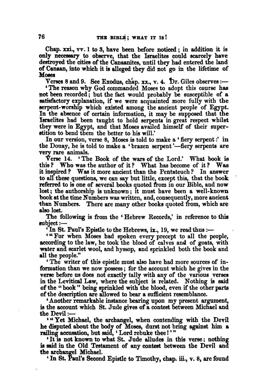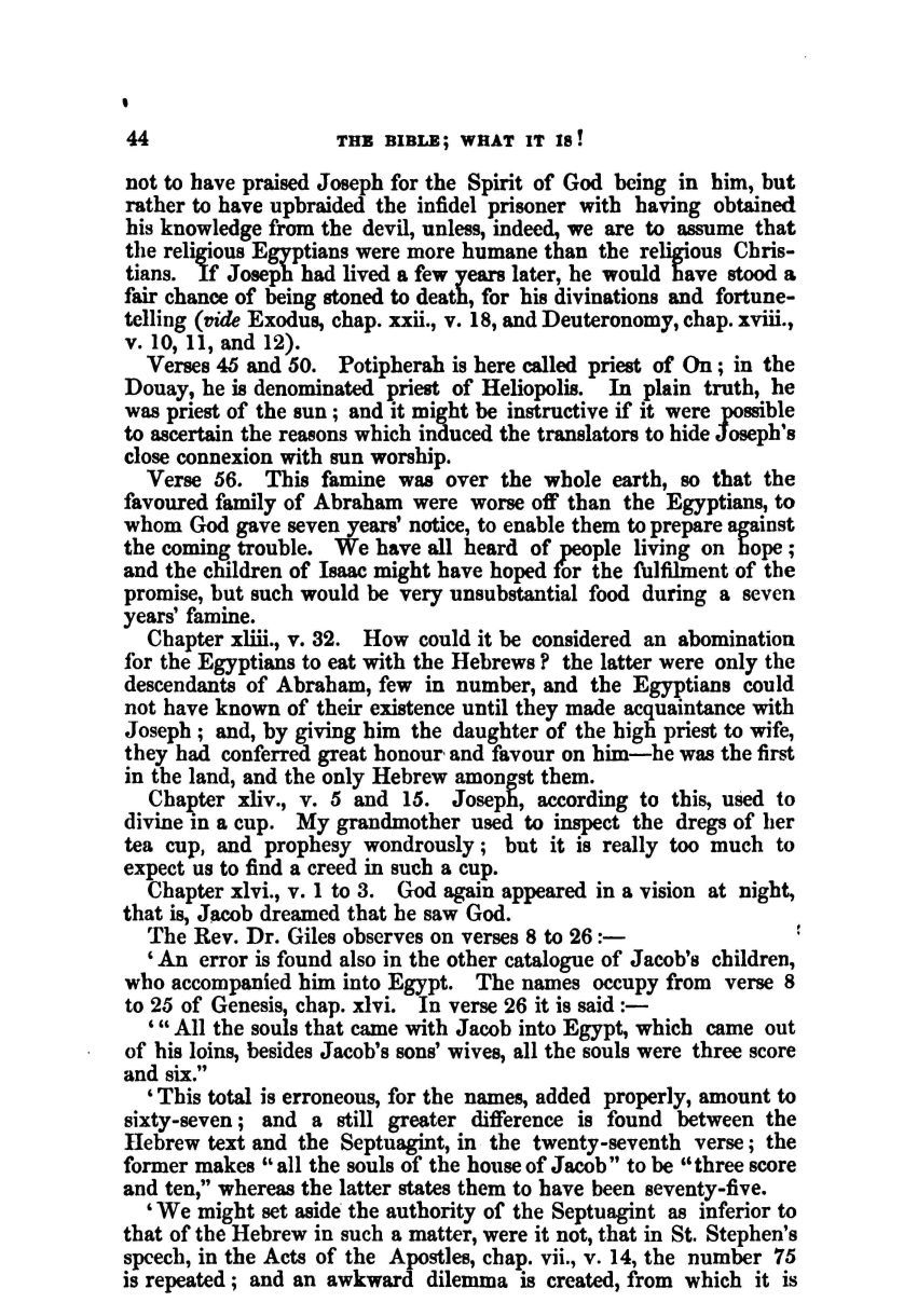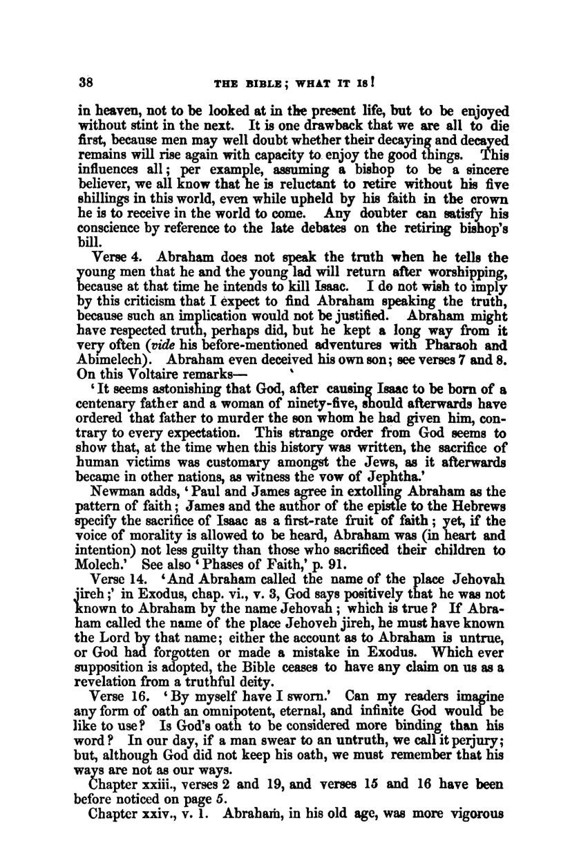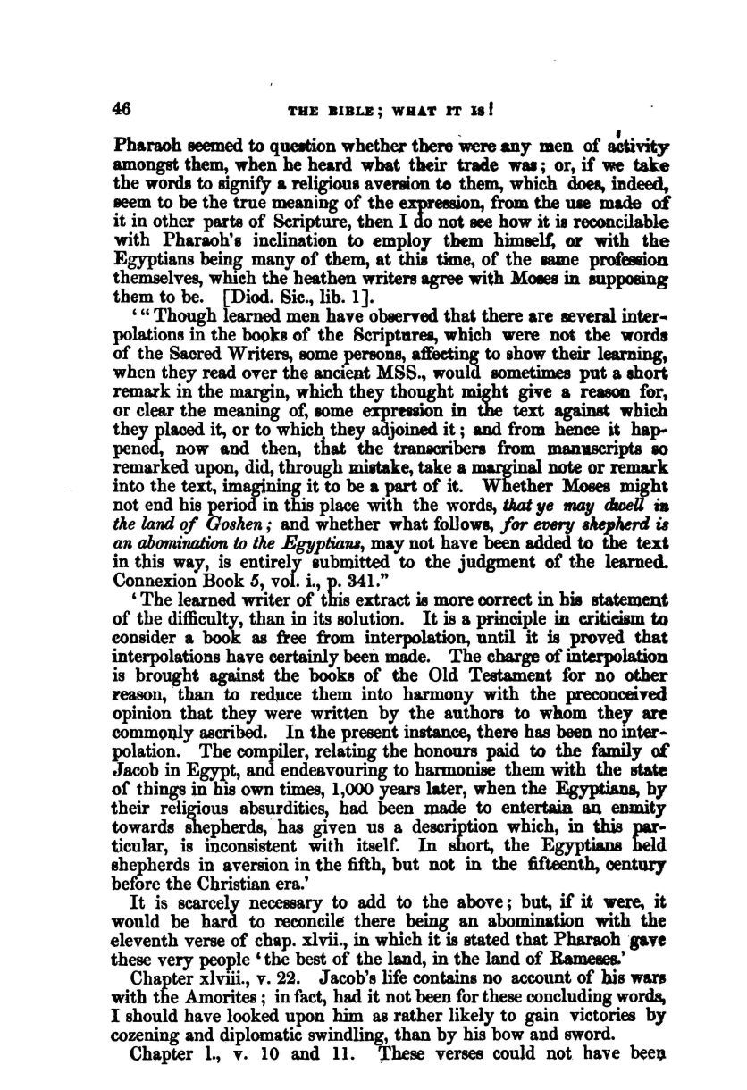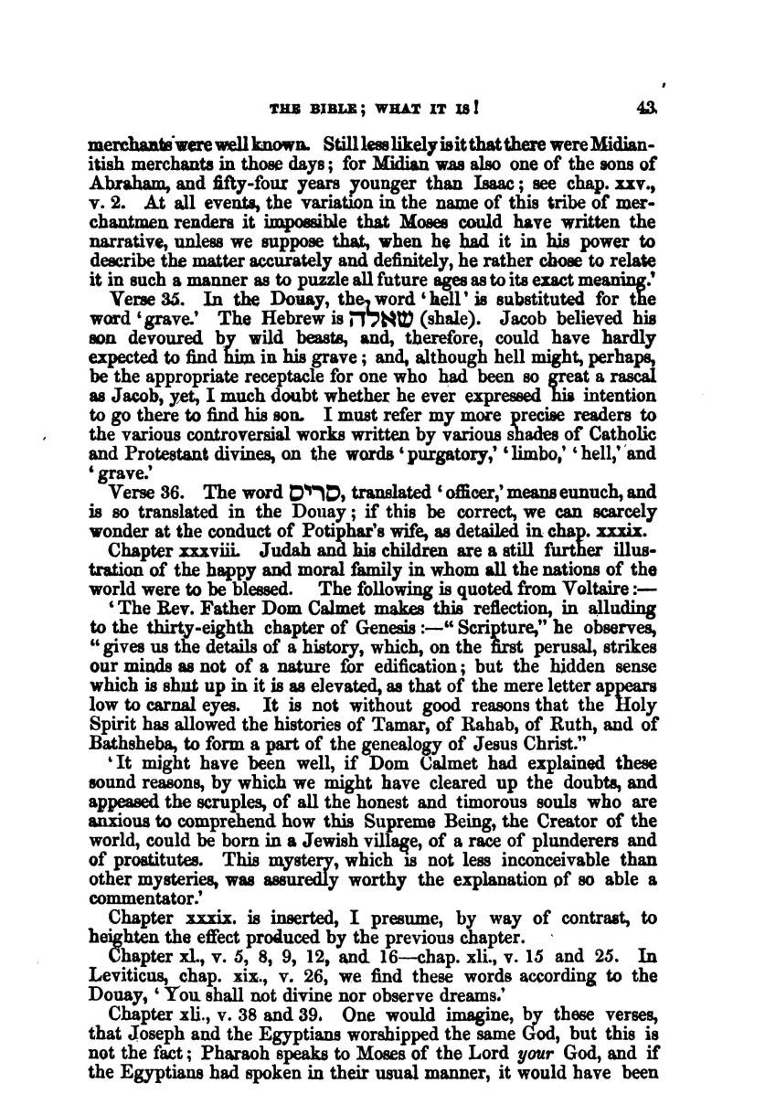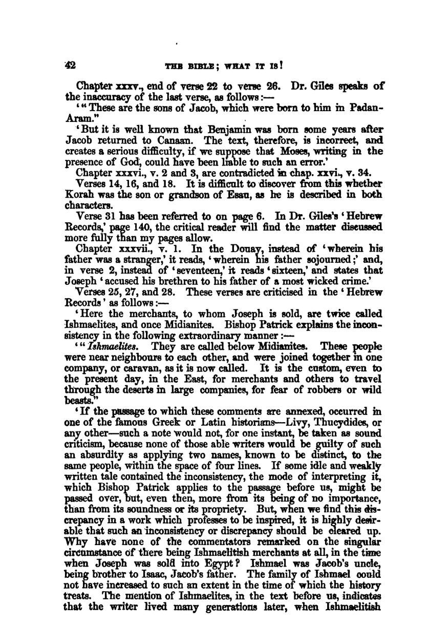 Genesis, chap, xx., v. 16, and chap, xxiii., v. 15 and 16. Of these verses, Voltaire writes as follows; 'Learned and ingenious men, full of their own talents and acquirements, have maintained that it is {pg6} impossible Moses could have written the book of Genesis. One of their principal reasons is, that in the history of Abraham that patriarch is stated to have paid for a cave he purchased for the interment of his wife, in silver coin; and the King of Gerar to have given Sarah a thousand pieces of silver, when he restored her, after having carried her off for her beauty at the age of seventy-five. They inform us that they have consulted all the ancient authors, and that it appears very certain that, at the period mentioned, silver money was not in existence:—
