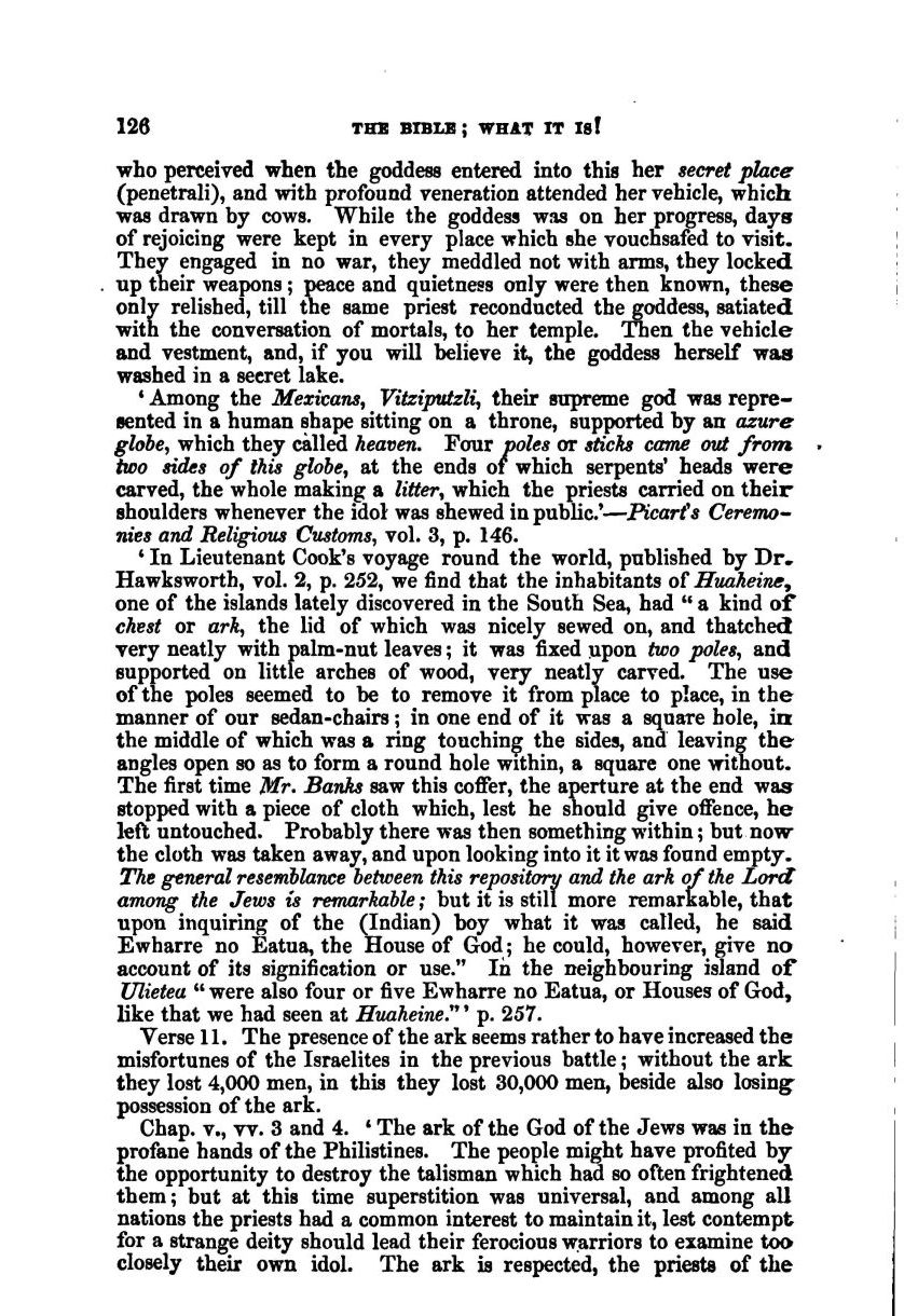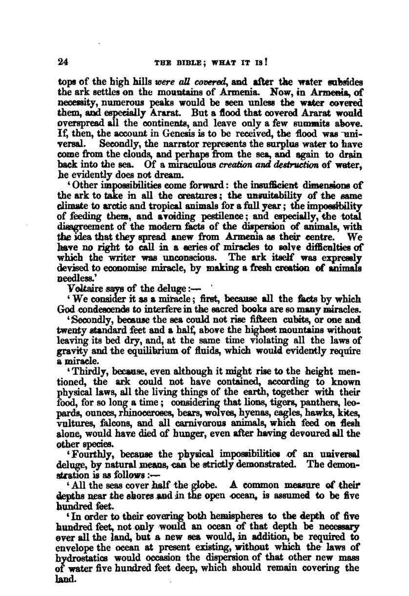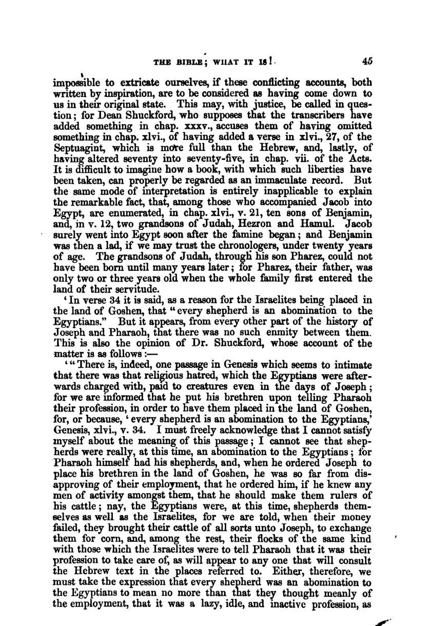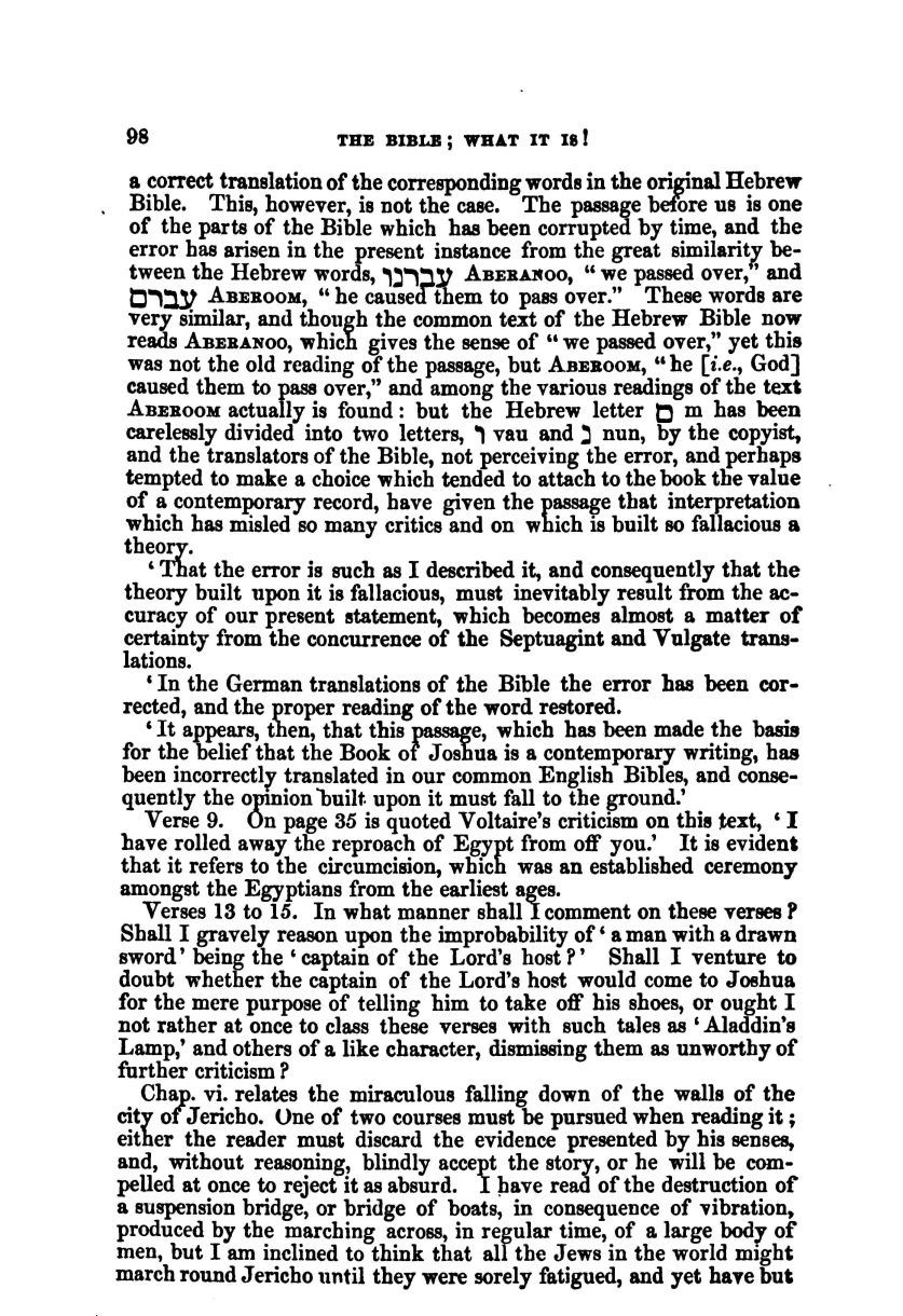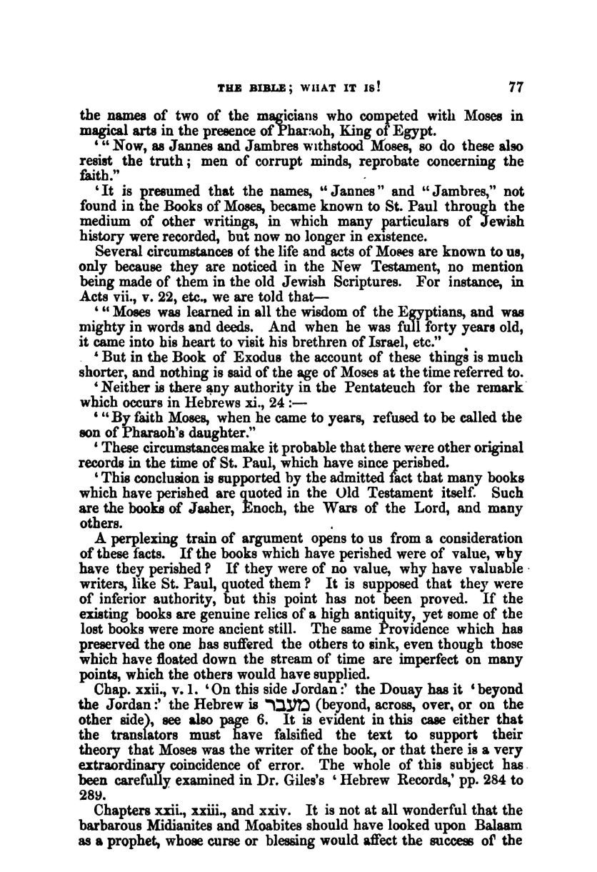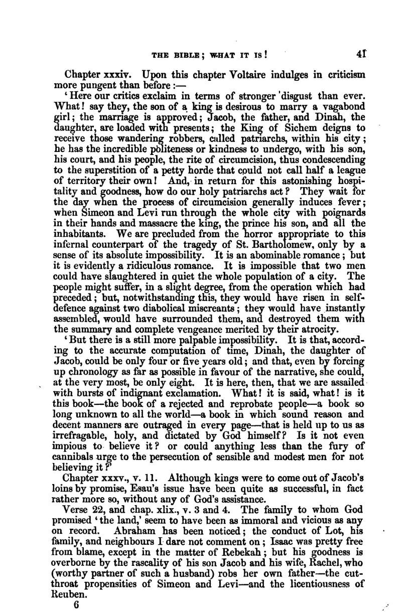 Genesis, chap, xx., v. 16, and chap, xxiii., v. 15 and 16. Of these verses, Voltaire writes as follows; 'Learned and ingenious men, full of their own talents and acquirements, have maintained that it is {pg6} impossible Moses could have written the book of Genesis. One of their principal reasons is, that in the history of Abraham that patriarch is stated to have paid for a cave he purchased for the interment of his wife, in silver coin; and the King of Gerar to have given Sarah a thousand pieces of silver, when he restored her, after having carried her off for her beauty at the age of seventy-five. They inform us that they have consulted all the ancient authors, and that it appears very certain that, at the period mentioned, silver money was not in existence:—