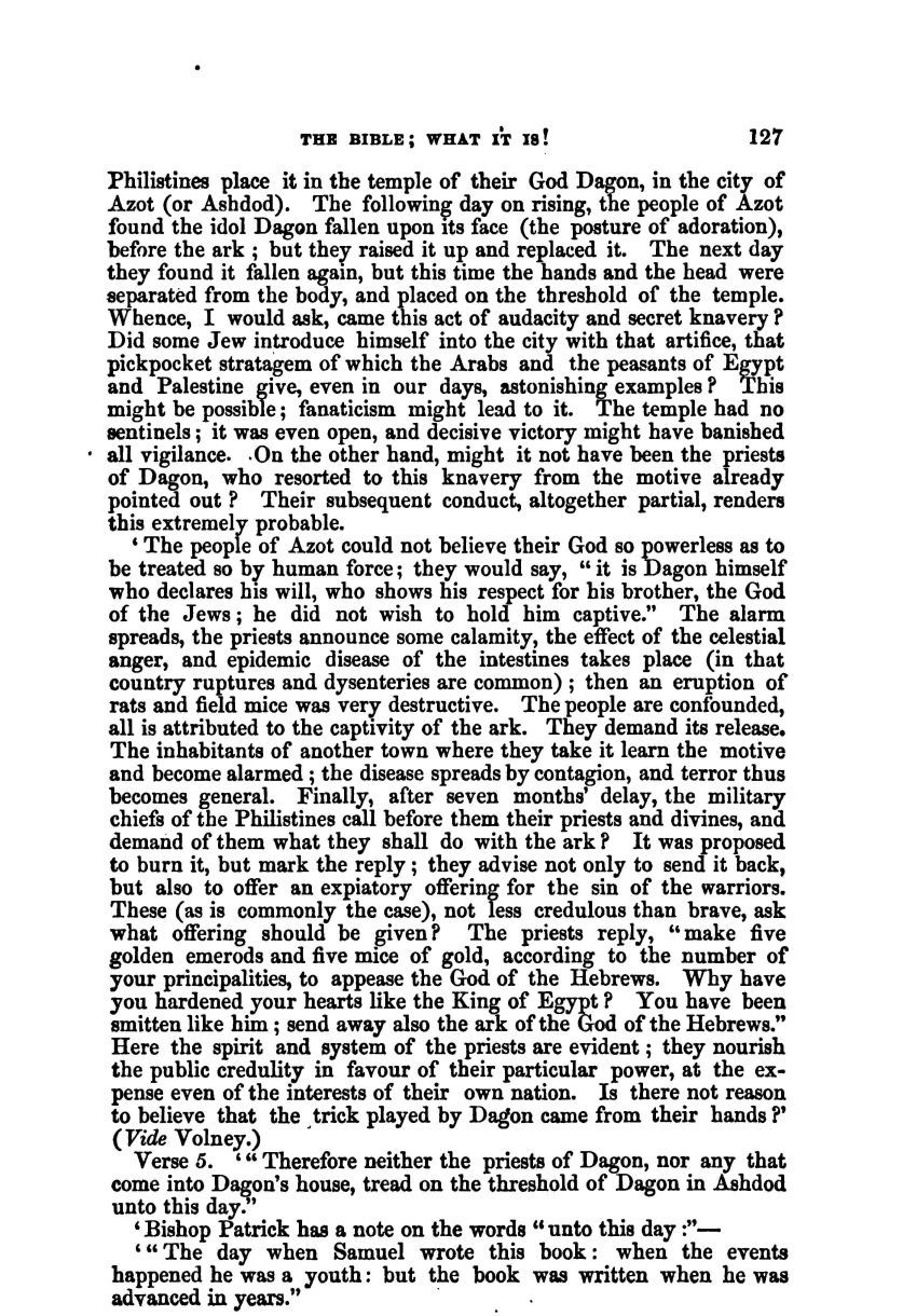 Chapter v., w. 3 and 4. 'The ark of the God of the Jews was in the profane hands of the Philistines. The people might have profited by the opportunity to destroy the talisman which had so often frightened them; but at this time superstition was universal, and among all nations the priests had a common interest to maintain it, lest contempt for a strange deity should lead their ferocious warriors to examine too closely their own idol. The ark is respected, the priests of the {pg127} Philistines place it in the temple of their God Dagon, in the city of Azot (or Ashdod). The following day on rising, the people of Azot found the idol Dagon fallen upon its face (the posture of adoration), before the ark; but they raised it up and replaced it. The next day they found it fallen again, but this time the hands and the head were separated from the body, and placed on the threshold of the temple. Whence, I would ask, came this act of audacity and secret knavery? Did some Jew introduce himself into the city with that artifice, that pickpocket stratagem of which the Arabs and the peasants of Egypt and Palestine give, even in our days, astonishing examples? This might be possible; fanaticism might lead to it. The temple had no sentinels; it was even open, and decisive victory might have banished all vigilance. On the other hand, might it not have been the priests of Dagon, who resorted to this knavery from the motive already pointed out? Their subsequent conduct, altogether partial, renders this extremely probable.