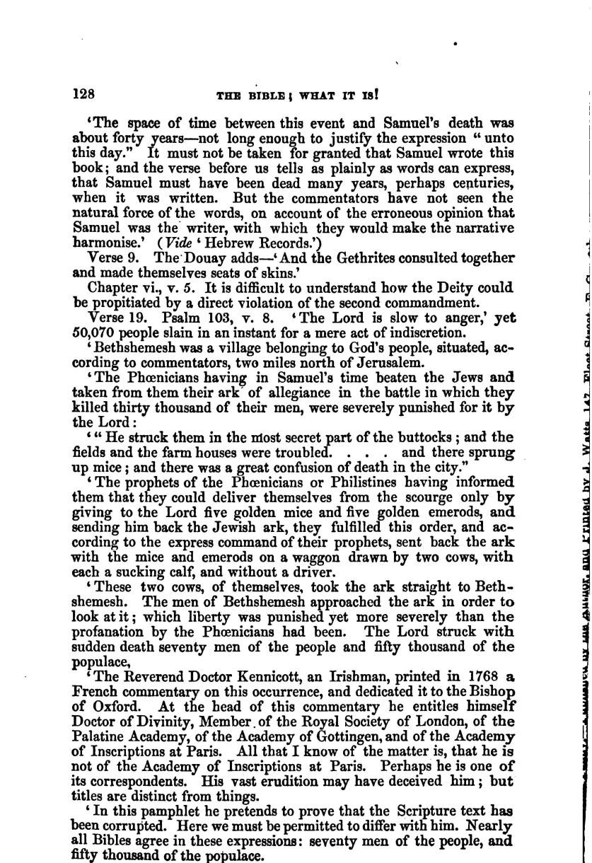 'In this pamphlet he pretends to prove that the Scripture text has been corrupted. Here we must be permitted to differ with him. Nearly all Bibles agree in these expressions: seventy men of the people, and fifty thousand of the populace. {pg129} 'The Reverend Doctor Kennicott says to the Right Reverend the Lord Bishop of Oxford, that formerly there were strong prejudices in favour of the Hebrew text; but that for seventeen years his lordship and himself have been freed from their prejudices, after the deliberate and attentive perusal of this chapter.