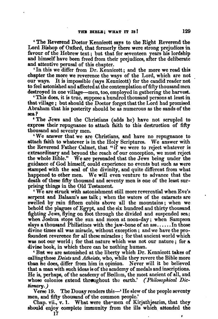'In this we differ from Dr. Kennicott; and the more we read this chapter the more we reverence the ways of the Lord, which are not our ways. It is impossible (says Kennicott) for the candid reader not to feel astonished and affected at the contemplation of fifty thousand men destroyed in one village—men, too, employed in gathering the harvest.