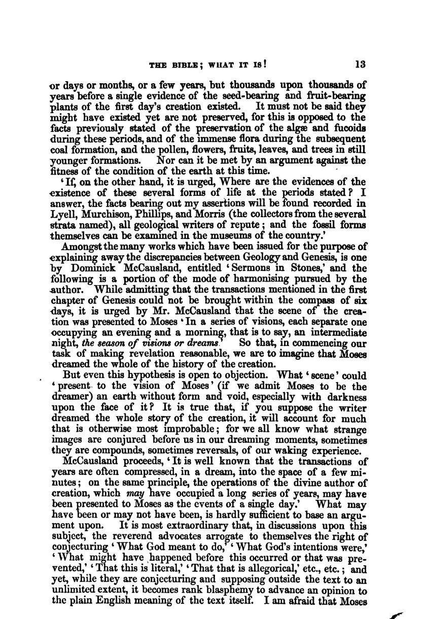 Amongst the many works which have been issued for the purpose of explaining away the discrepancies between Geology and Genesis, is one by Dommick McCausland, entitled 'Sermons in Stones,' and the following is a portion of the mode of harmonising pursued by the author. While admitting that the transactions mentioned in the first chapter of Grenesis could not be brought within the compass of six days, it is urged by Mr. McCausland that the scene of the creation was presented to Moses 'In a series of visions, each separate one occupying an evening and a morning, that is to say, an intermediate night, the season of visions or dreams. So that, in commencing our task of making revelation reasonable, we are to imagine that Moses dreamed the whole of the history of the creation.