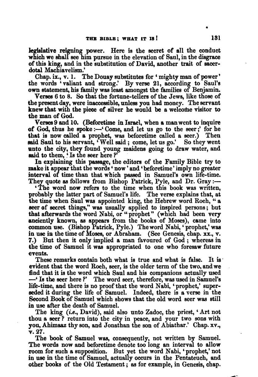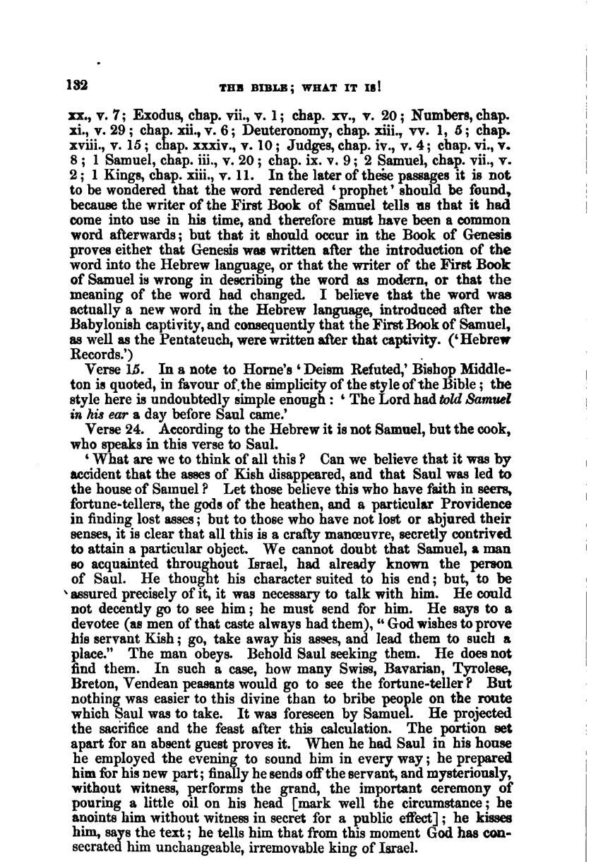 The book of Samuel was, consequently, not written by Samuel. The words now and beforetime denote too long an interval to allow room for such a supposition. But yet the word Nabi, 'prophet,' not in use in the time of Samuel, actually occurs in the Pentateuch, and other books of the Old Testament; as for example, in Genesis, chap. {pg132} xx., v. 7; Exodus, chap, vii., v. 1; chap, xv., v. 20; Numbers, chap. xi., v. 29; chap, xii., v. 6; Deuteronomy, chap, xiii., vv. 1,5; chap. xviii., v. 15; chap, xxxiv., v. 10; Judges, chap, iv., v. 4; chap, vi., v. 8; 1 Samuel, chap, iii., v. 20; chap. ix. v. 9; 2 Samuel, chap, vii., v. 2; 1 Kings, chap, xiii., v. 11. In the later of these passages it is not to be wondered that the word rendered 'prophet' should be found, because the writer of the First Book of Samuel tells us that it had come into use in his time, and therefore must have been a common word afterwards; but that it should occur in the Book of Genesis proves either that Genesis was written after the introduction of the word into the Hebrew language, or that the writer of the First Book of Samuel is wrong in describing the word as modern, or that the meaning of the word had changed. I believe that the word was actually a new word in the Hebrew language, introduced after the Babylonish captivity, and consequently that the First Book of Samuel, as well as the Pentateuch, were written after that captivity. ('Hebrew Records.')
