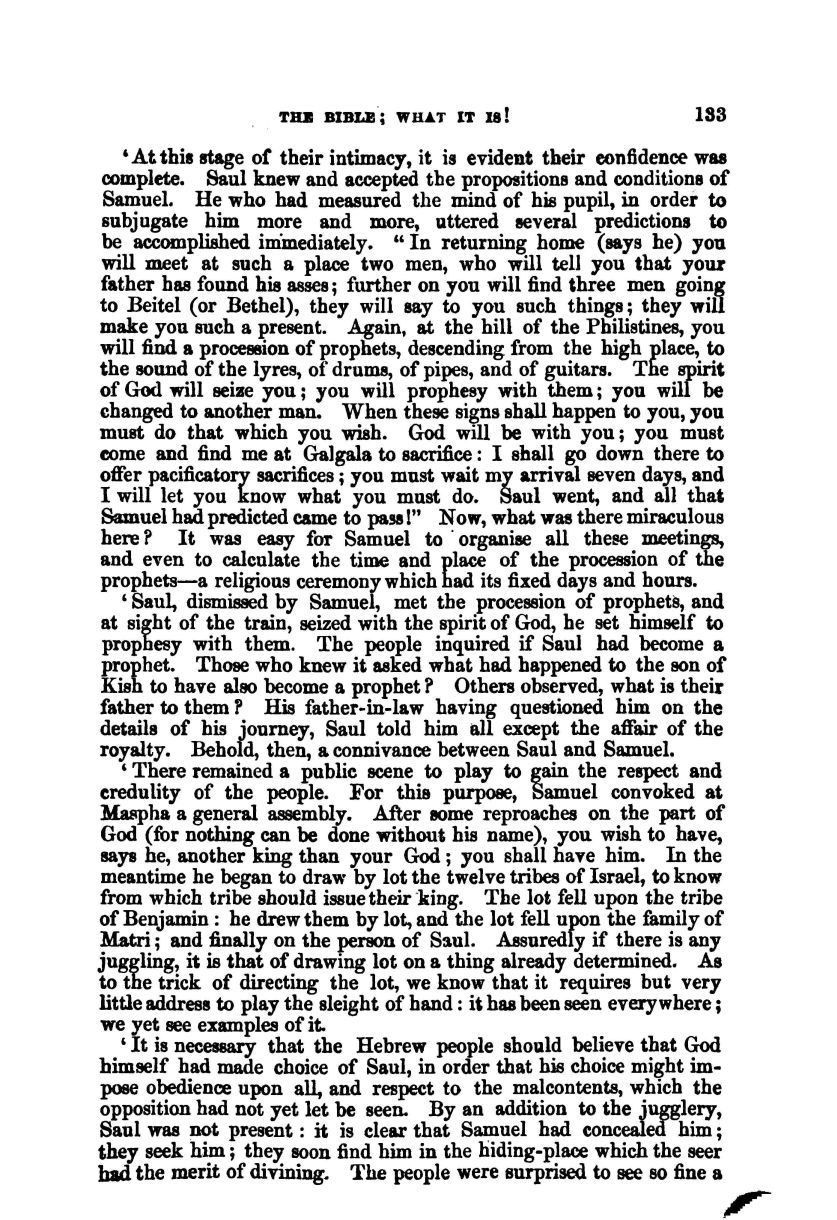 'What are we to think of all this? Can we believe that it was by accident that the asses of Kish disappeared, and that Saul was led to the house of Samuel? Let those believe this who have faith in seers, fortune-tellers, the gods of the heathen, and a particular Providence in finding lost asses; but to those who have not lost or abjured their senses, it is clear that all this is a crafty manoeuvre, secretly contrived to attain a particular object. We cannot doubt that Samuel, a man so acquainted throughout Israel, had already known the person of Saul. He thought his character suited to his end; but, to be assured precisely of it, it was necessary to talk with him. He could not decently go to see him; he must send for him. He says to a devotee (as men of that caste always had them), "God wishes to prove his servant Kish; go, take away his asses, and lead them to such a place." The man obeys. Behold Saul seeking them. He does not find them. In such a case, how many Swiss, Bavarian, Tyrolese, Breton, Vendean peasants would go to see the fortune-teller? But nothing was easier to this divine than to bribe people on the route which Saul was to take. It was foreseen by Samuel. He projected the sacrifice and the feast after this calculation. The portion set apart for an absent guest proves it. When he had Saul in his house he employed the evening to sound him in every way; he prepared him for his new part; finally he sends off the servant, and mysteriously, without witness, performs the grand, the important ceremony of pouring a little oil on his head [mark well the circumstance; he anoints him without witness in secret for a public effect]; he kisses him, says the text; he tells him that from this moment God has consecrated him unchangeable, irremovable king of Israel. {pg133} 'At this stage of their intimacy, it is evident their confidence was complete. Saul knew and accepted the propositions and conditions of Samuel. He who had measured the mind of his pupil, in order to subjugate him more and more, uttered several predictions to be accomplished immediately. "In returning home (says he) you will meet at such a place two men, who will tell you that your father has found his asses; further on you will find three men going to Beitel (or Bethel), they will say to you such things; they will make you such a present. Again, at the hill of the Philistines, you will find a procession of prophets, descending from the high place, to the sound of the lyres, of drums, of pipes, and of guitars. The spirit of God will seize you; you will prophesy with them; you will be changed to another man. When these signs shall happen to you, you must do that which you wish. God will be with you; you must come and find me at Galgala to sacrifice: I shall go down there to offer pacificatory sacrifices; you must wait my arrival seven days, and I will let you know what you must do. Saul went, and all that Samuel had predicted came to pass!" Now, what was there miraculous here? It was easy for Samuel to organise all these meetings, and even to calculate the time and place of the procession of the prophets—a religious ceremony which had its fixed days and hours.