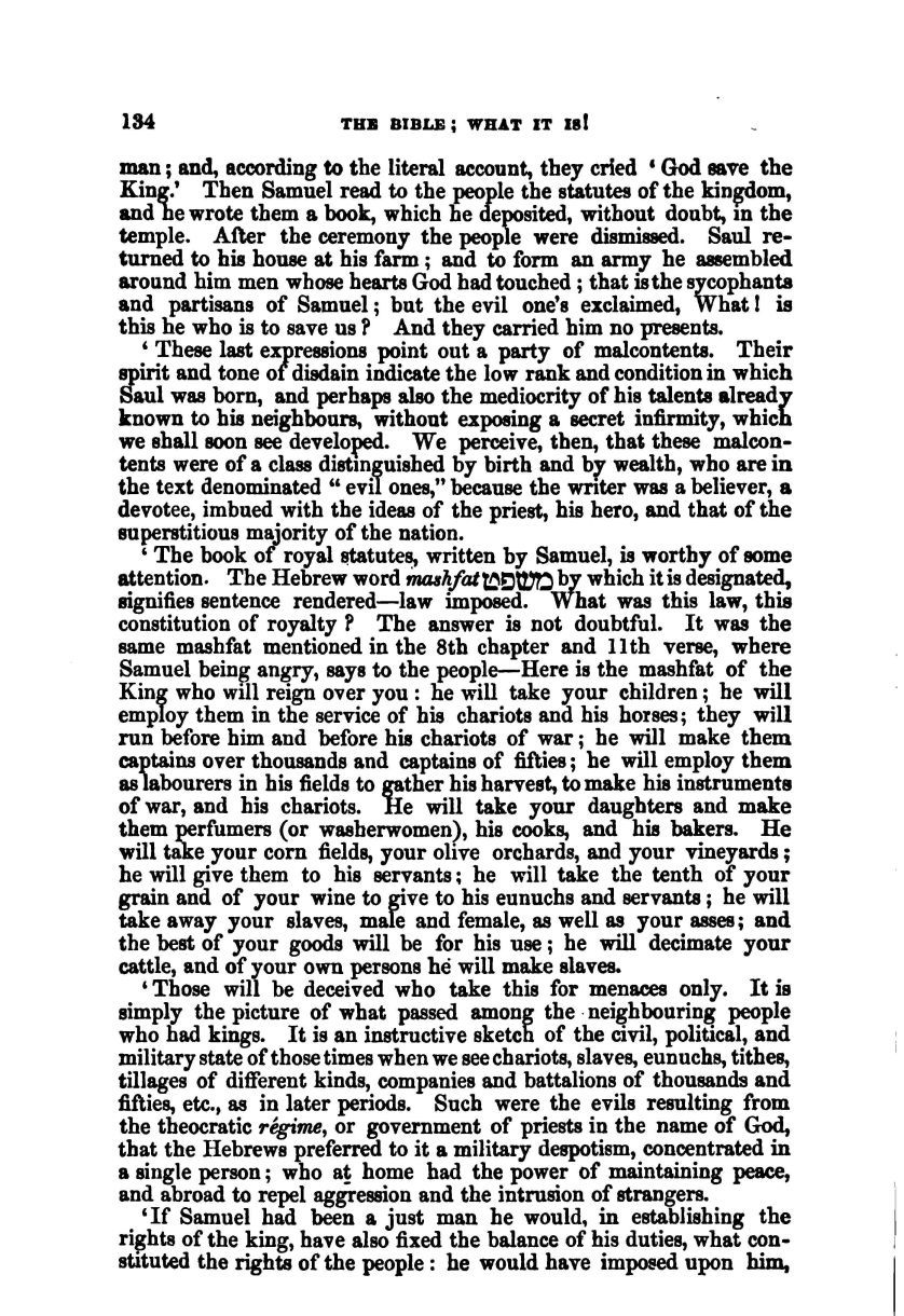 'The book of royal statutes, written by Samuel, is worthy of some attention. The Hebrew word mashfat [———] which it is designated, signifies sentence rendered—law imposed. What was this law, this constitution of royalty? The answer is not doubtful. It was the same mashfat mentioned in the 8th chapter and 11th verse, where Samuel being angry, says to the people—Here is the mashfat of the King; who will reign over you: he will take your children; he will employ them in the service of his chariots and his horses; they will run before him and before his chariots of war; he will make them captains over thousands and captains of fifties; he will employ them as labourers in his fields to gather his harvest, to make his instruments of war, and his chariots. He will take your daughters and make them perfumers (or washerwomen), his cooks, and his bakers. He will take your corn fields, your olive orchards, and your vineyards; he will give them to his servants; he will take the tenth of your grain and of your wine to give to his eunuchs and servants; he will take away your slaves, male and female, as well as your asses; and the best of your goods will be for his use; he will decimate your cattle, and of your own persons he will make slaves.