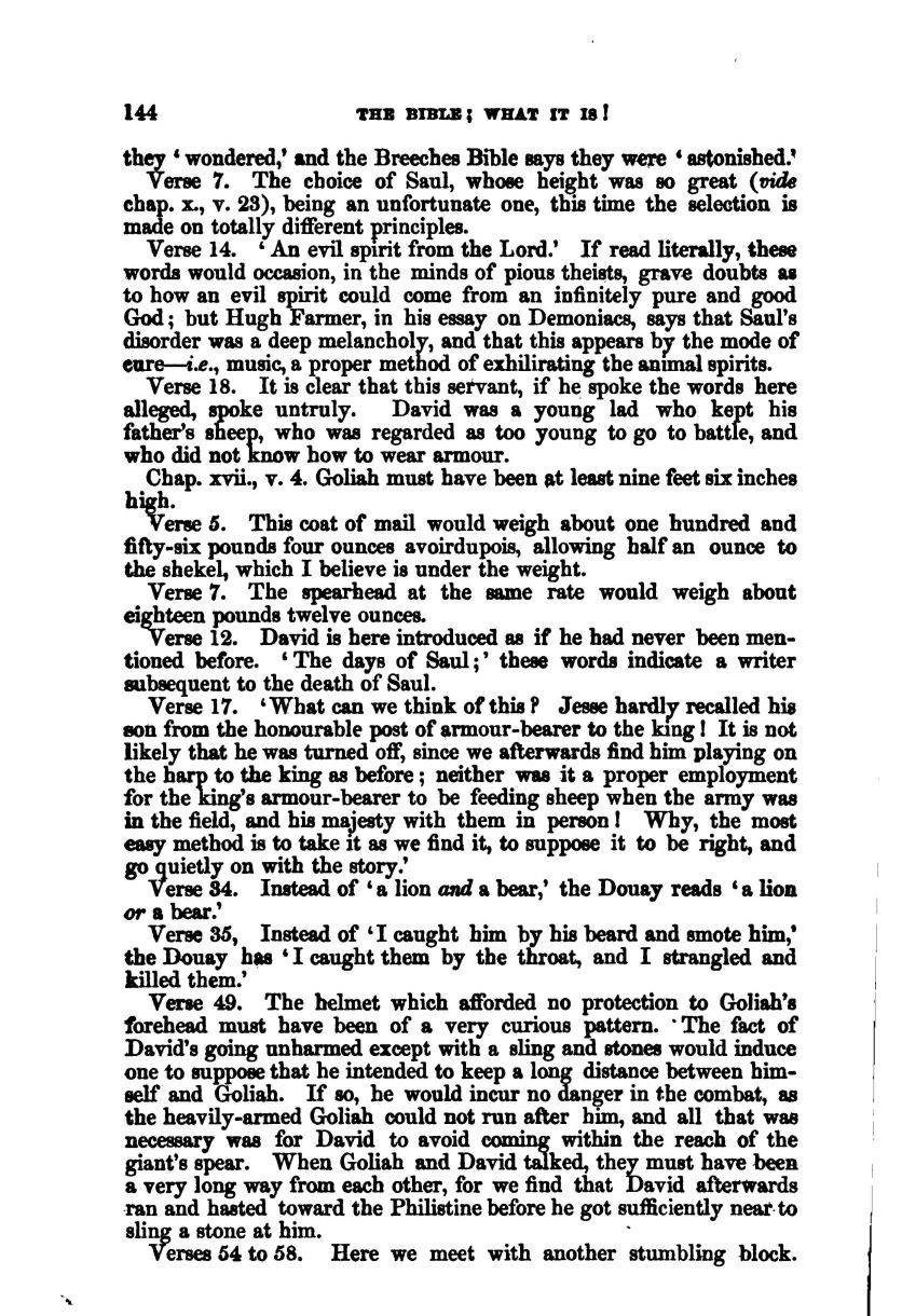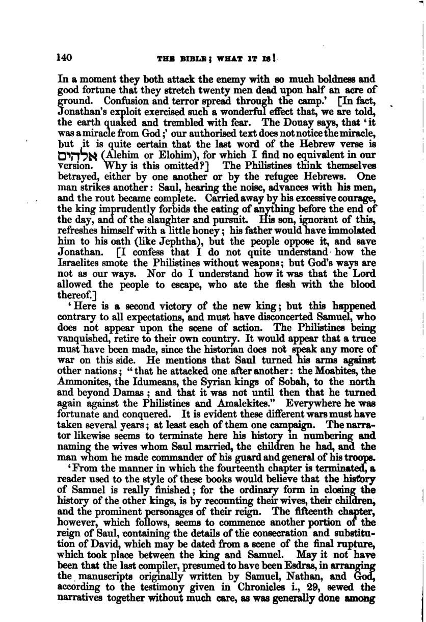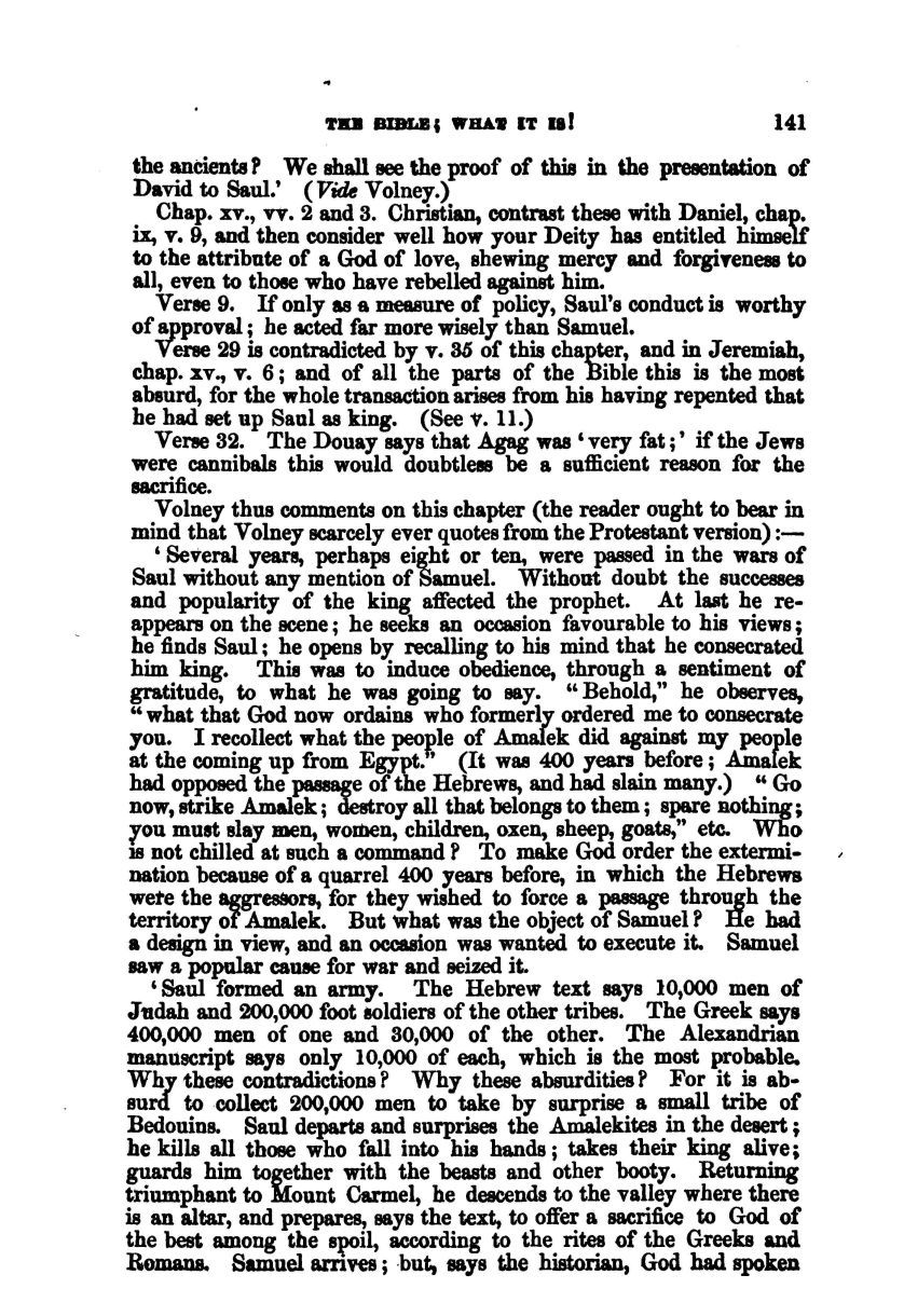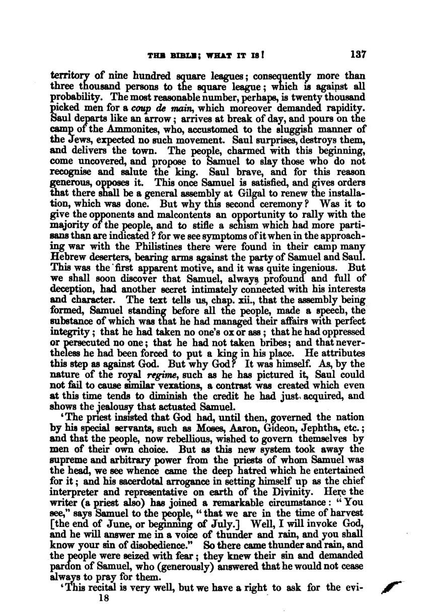 'This priest thought all success impossible, and by immolating his vanquished pupil he wished to insure for himself a compromise with his enemies, both within and without. Chance defeated his calculations. Saul remained with six hundred men, courageous and determined like himself. He takes post before the enemy's camp, prohibiting all attack. Several days passed. His son, Jonathan, stealing under cover (of the night, probably), followed by one only squire, he presents himself before a Philistine post, situated on a high rock; he is taken for a refugee Hebrew, such as had arrived in great numbers for several days before; he climbs up with his squire and is received. {pg140} In a moment they both attack the enemy with so much boldness and good fortune that they stretch twenty men dead upon half an acre of ground. Confusion and terror spread through the camp.' [In fact, Jonathan's exploit exercised such a wonderful effect that, we are told, the earth quaked and trembled with fear. The Douay says, that 'it was a miracle from God;' our authorised text does not notice the miracle, but it is quite certain that the last word of the Hebrew verse is [———] (Alehim or Elohim), for which I find no equivalent in our version. Why is this omitted?] The Philistines think themselves betrayed, either by one another or by the refugee Hebrews. One man strikes another: Saul, hearing the noise, advances with his men, and the rout became complete. Carried away by his excessive courage, the king imprudently forbids the eating of anything before the end of the day, and of the slaughter and pursuit. His son, ignorant of this, refreshes himself with a little honey; his father would have immolated him to his oath (like Jephtha), but the people oppose it, and save Jonathan. [I confess that I do not quite understand how the Israelites smote the Philistines without weapons; but God's ways are not as our ways. Nor do I understand how it was that the Lord allowed the people to escape, who ate the flesh with the blood thereof. 'Here is a second victory of the new king; but this happened contrary to all expectations, and must have disconcerted Samuel, who does not appear upon the scene of action. The Philistines being vanquished, retire to their own country. It would appear that a truce must have been made, since the historian does not speak any more of war on this side. He mentions that Saul turned his arms against other nations; "that he attacked one after another: the Moabites, the Ammonites, the Idumeans, the Syrian kings of Sobah, to the north and beyond Damas; and that it was not until then that he turned again against the Philistines and Amalekites." Everywhere he was fortunate and conquered. It is evident these different wars must have taken several years; at least each of them one campaign. The narrator likewise seems to terminate here his history in numbering and naming the wives whom Saul married, the children he had, and the man whom he made commander of his guard and general of his troops. 'From the manner in which the fourteenth chapter is terminated!' a reader used to the style of these books would believe that the history of Samuel is really finished; for the ordinary form in closing the history of the other kings, is by recounting their wives, their children, and the prominent personages of their reign. The fifteenth chapter, however, which follows, seems to commence another portion of the reign of Saul, containing the details of the consecration and substitution of David, which may be dated from a scene of the final rupture, which took place between the king and Samuel. May it not have been that the last compiler, presumed to have been Esdras, in arranging the manuscripts originally written by Samuel, Nathan, and God, according to the testimony given in Chronicles i., 29, sewed the narratives together without much care, as was generally done among {pg141} the ancients? We shall see the proof of this in the presentation of David to Saul.' ( Vide Volney.)