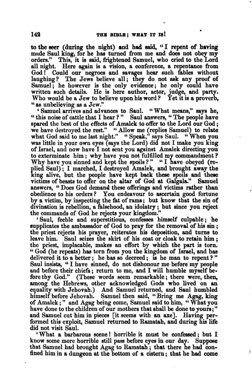 'Saul formed an army. The Hebrew text says 10,000 men of Judah and 200,000 foot soldiers of the other tribes. The Greek says 400,000 men of one and 30,000 of the other. The Alexandrian manuscript says only 10,000 of each, which is the most probable. Why these contradictions? Why these absurdities? For it is absurd to collect 200,000 men to take by surprise a small tribe of Bedouins. Saul departs and surprises the Amalekites in the desert; he kills all those who fall into his hands; takes their king alive; guards him together with the beasts and other booty. Returning triumphant to Mount Carmel, he descends to the valley where there is an altar, and prepares, says the text, to offer a sacrifice to God of the best among the spoil, according to the rites of the Greeks and Romans. Samuel arrives; but, says the historian, God had spoken {pg142} to the seer (during the night) and had said, "I repent of having made Saul king, for he has turned from me and does not obey my orders." This, it is said, frightened Samuel, who cried to the Lord all night. Here again is a vision, a conference, a repentance from God! Could our negroes and savages hear such fables without laughing? The Jews believe all; they do not ask any proof of Samuel; he however is the only evidence; he only could have written such details. He is here author, actor, judge, and party. Who would be a Jew to believe upon his word? Yet it is a proverb, "as unbelieving as a Jew."