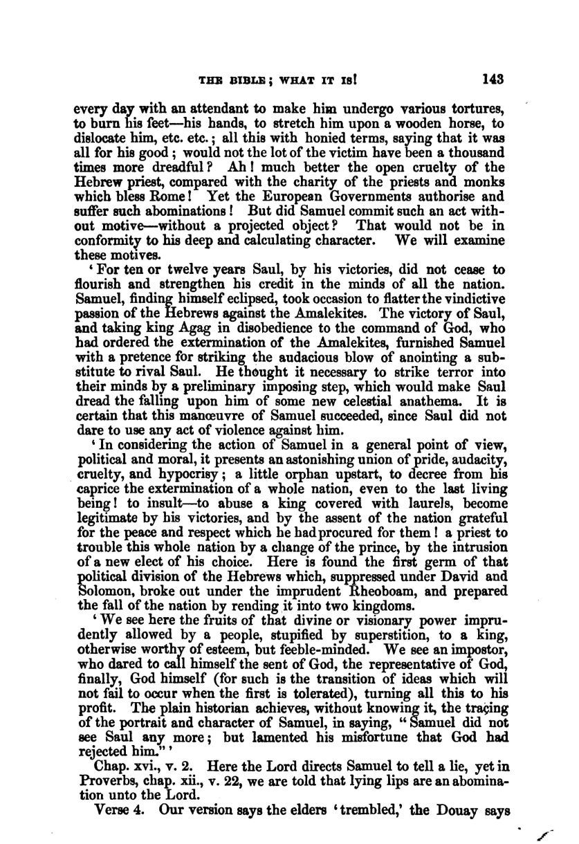 'What a barbarous scene! horrible it must be confessed; but I know some more horrible still pass before eyes in our day. Suppose that Samuel had brought Agag to Ramatah; that there he had confined him in a dungeon at the bottom of a cistern; that he had come {pg143} every day with an attendant to make him undergo various tortures, to burn his feet—his hands, to stretch him upon a wooden horse, to dislocate him, etc. etc.; all this with honied terms, saying that it was all for his good; would not the lot of the victim have been a thousand times more dreadful? Ah! much better the open cruelty of the Hebrew priest, compared with the charity of the priests and monks which bless Rome! Yet the European Governments authorise and suffer such abominations! But did Samuel commit such an act without motive—without a projected object? That would not be in conformity to his deep and calculating character. We will examine these motives.