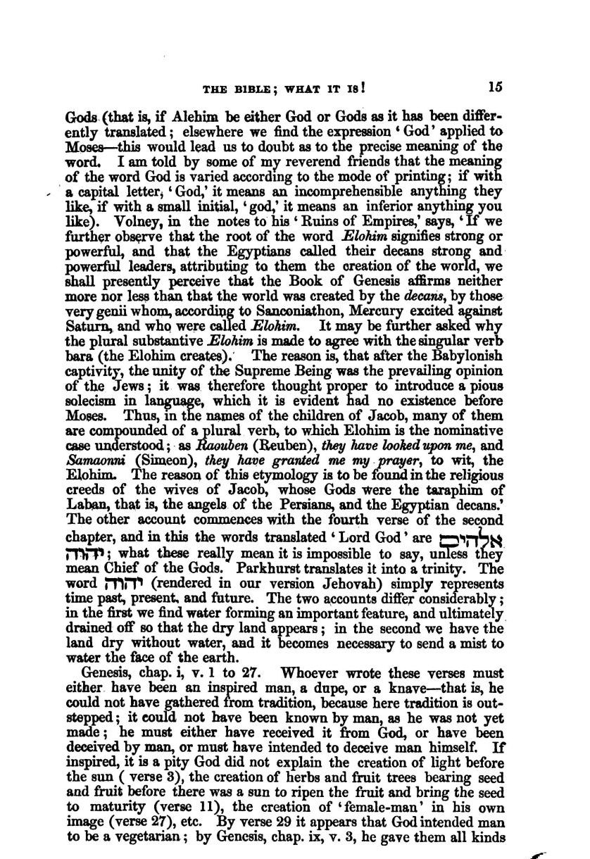 'In the beginning God created the heaven and the earth.' The word here translated God is [———] (Alehim or Elohim) which is a plural noun (vide Parkhurst's Hebrew Lexicon, article [———], and although translated by the singular word God, it is often associated with plural adjectives, pronouns, and verbs, see Genesis, chap, i, v. 26, chap, iii, y. 22, chap, xi, v. 7; nay more, on the same orthodox authority we learn, that in many other passages the translators have ignored the plural accompaniments for the purpose of supporting the orthodox theory, and yet we are told in the present day that the Bible does not want retranslation. It has been before pointed out that there is a double creation narrated, one from Genesis, chap, i, v. 1 to chap. ii, v. 3; in this the only word used is the plural word Alehim, or the {pg15} Gods (that is, if Alehim be either God or Gods as it has been differently translated; elsewhere we find the expression 'God' applied to Moses—this would lead us to doubt as to the precise meaning of the word. I am told by some of my reverend friends that the meaning of the word God is varied according to the mode of printing; if with a capital letter 'God,' it means an incomprehensible anything they like, if with a small initial, 'god,' it means an inferior anything you like). Volney, in the notes to his 'Ruins of Empires,' says, 'If we further observe that the root of the word Elohim signifies strong or powerful, and that the Egyptians called their decans strong and powerful leaders, attributing to them the creation of the world, we shall presently perceive that the Book of Genesis affirms neither more nor less than that the world was created by the decans, by those very genii whom, according to Sanconiathon, Mercury excited against Saturn, and who were called Elohim. It may be further asked why the plural substantive Elohim is made to agree with the singular verb bara (the Elohim creates). The reason is, that after the Babylonish captivity, the unity of the Supreme Being was the prevailing opinion of the Jews; it was therefore thought proper to introduce a pious solecism in language, which it is evident had no existence before Moses. Thus, in the names of the children of Jacob, many of them are compounded of a plural verb, to which Elohim is the nominative case understood; as Raouben (Reuben), they have looted upon me, and Samaonm (Simeon), they have granted me my prayer, to wit, the Elohim. The reason of this etymology is to be found in the religious creeds of the wives of Jacob, whose Gods were the taraphim of Laban, that is, the angels of the Persians, and the Egyptian decans.' The other account commences with the fourth verse of the second chapter, and in this the words translated 'Lord God' are [———]; what these really mean it is impossible to say, unless they mean Chief of the Gods. Parkhurst translates it into a trinity. The word [———] (rendered in our version Jehovah) simply represents time past, present, and future. The two accounts differ considerably; in the first we find water forming an important feature, and ultimately drained off so that the dry land appears; in the second we have the land dry without water, and it becomes necessary to send a mist to water the face of the earth.