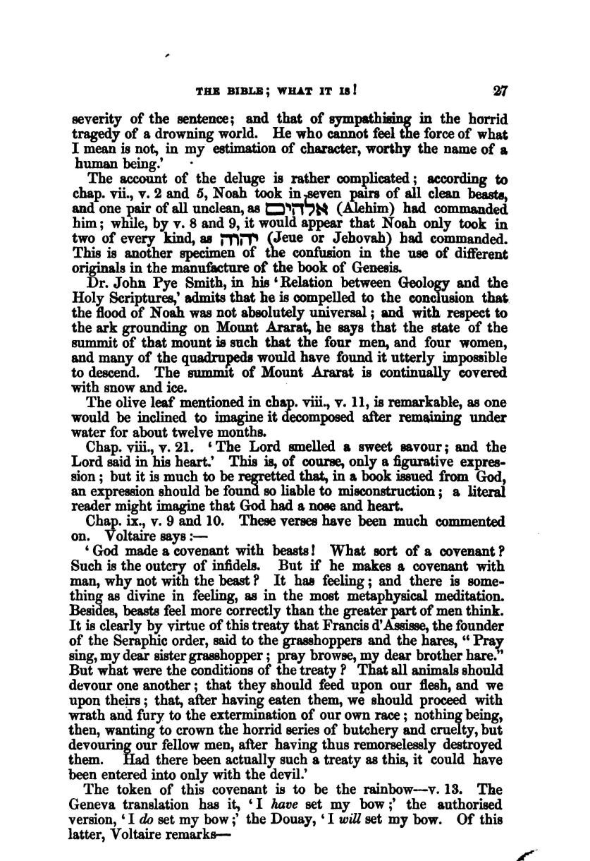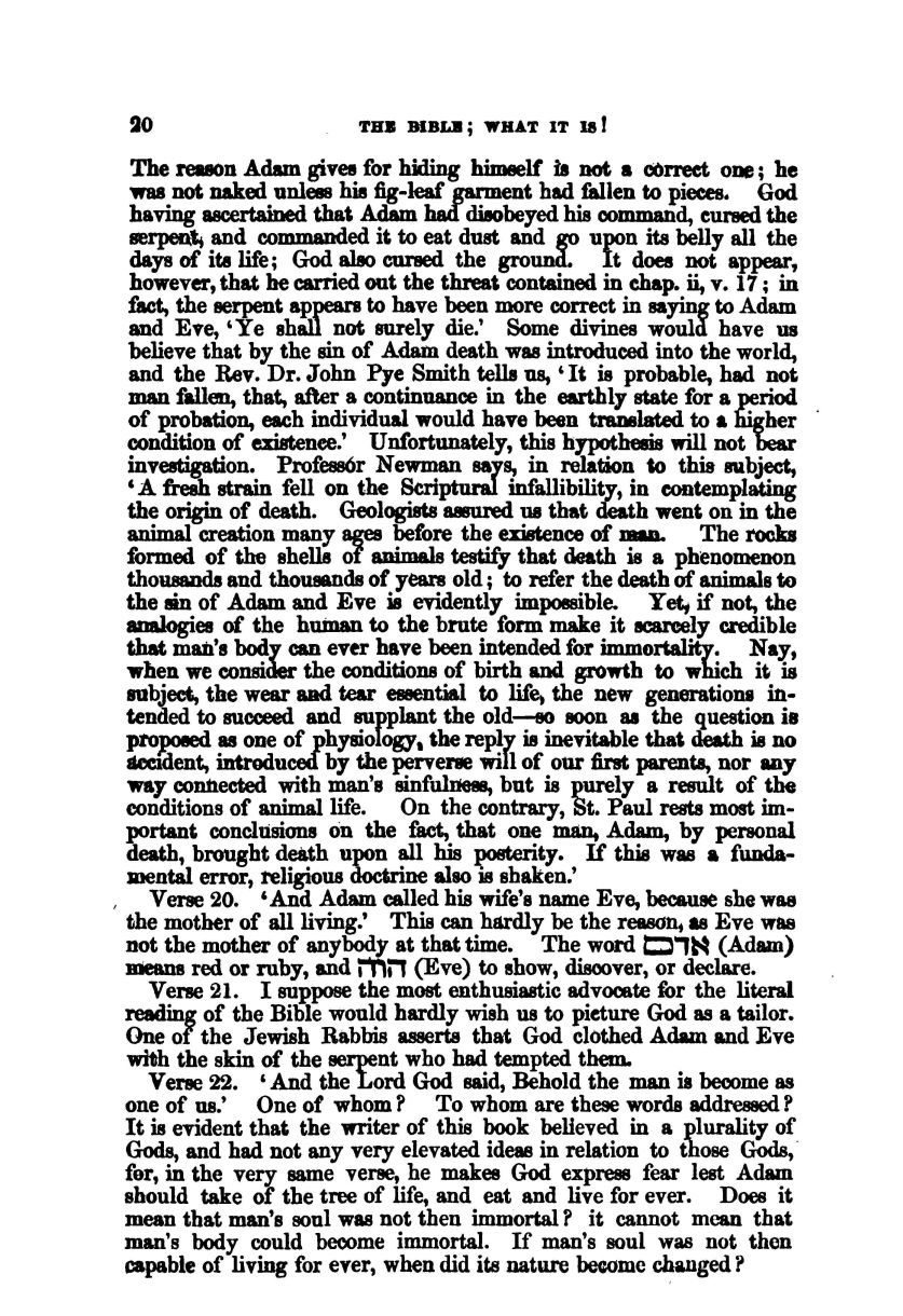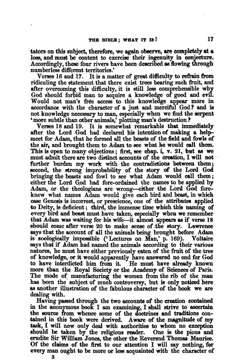 for Adam, that he formed all the beasts of the field and fowls of the air, and brought them to Adam to see what he would call them. This is open to many objections; first, see chap, i, v. 21, but as we must admit there are two distinct accounts of the creation, I will not further burden my work with the contradictions between them; second, the strong improbability of the story of the Lord God bringing the beasts and fowl to see what Adam would call them; either the Lord God had fore-ordained the names to be applied by Adam, or the theologians are wrong—either the Lord God foreknew what names Adam would give each bird and beast, in which case Genesis is incorrect, or prescience, one of the attributes applied to Deity, is deficient; third, the immense time which this naming of every bird and beast must have taken, especially when we remember that Adam was waiting for his wife—it almost appears as if verse 18 should come after verse 20 to make sense of the story. Lawrence says that the account of all the animals being brought before Adam is zoologically impossible ('Lectures on Man,' p. 169). Voltaire says that if Adam had named the animals according to their various natures, he must have either previously eaten of the fruit of the tree of knowledge, or it would apparently have answered no end for God to have interdicted him from it. He must have already known more than the Royal Society or the Academy of Sciences of Paris. The mode of manufacturing the woman from the rib of the man has been the subject of much controversy, but is only noticed here as another illustration of the fabulous character of the book we are dealing with.